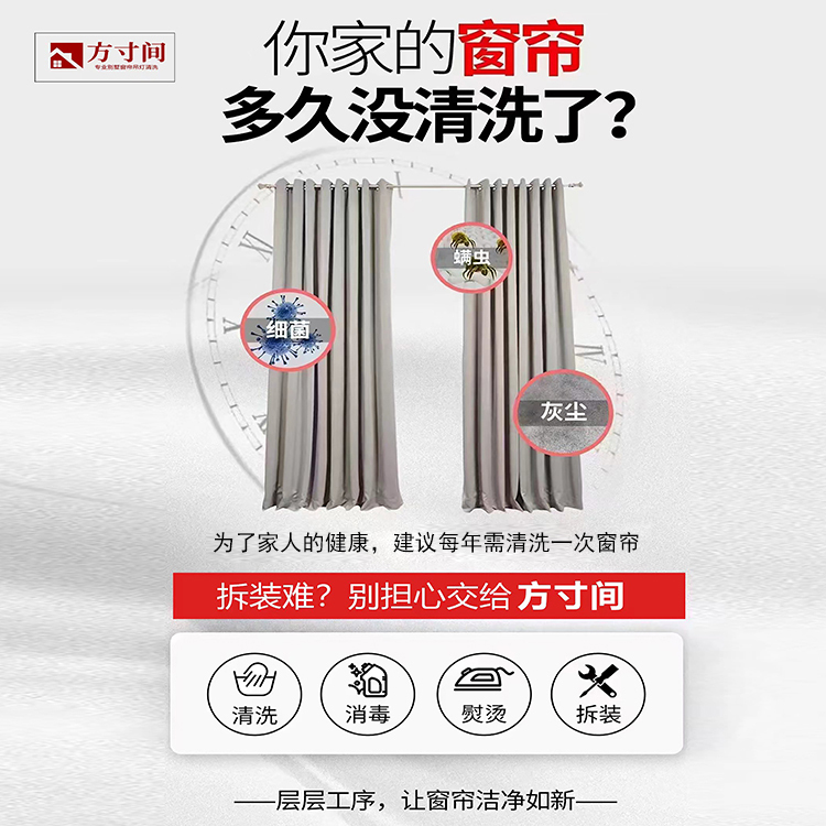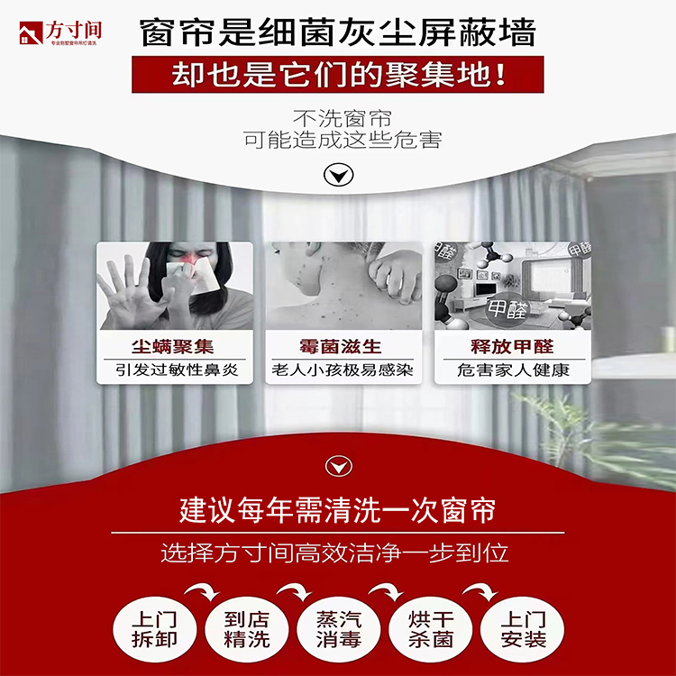 窗帘拆装、深度水洗、保养、杀菌、除螨、深度清洁、熨烫拉伸.