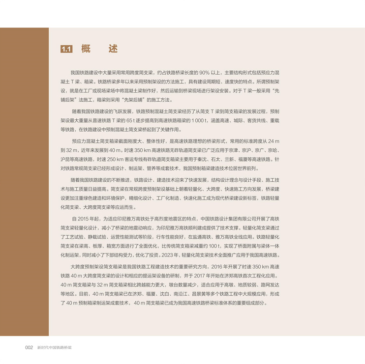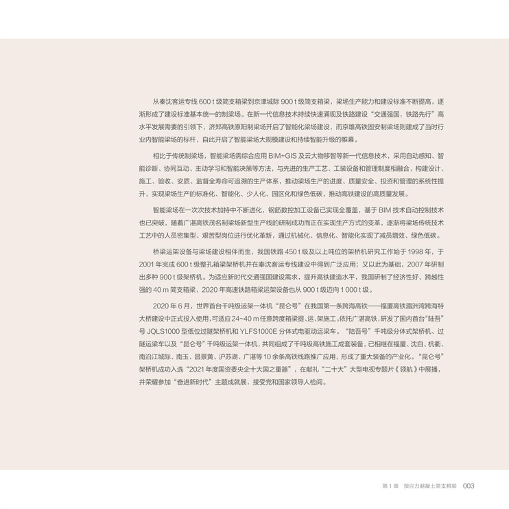全书共分九章四十四节,第一章介绍铁路预制混凝土简支梁及制运架装备,共收录盐通高铁海安特大桥、济郑高铁郑州万滩黄河公铁大桥等7座桥梁以及智能梁场、运架设备等;第二章介绍预制节段装配式桥梁及装备,共收录京唐铁路潮白新河特大桥、广汕铁路增江特大桥等6座桥梁及装配式桥梁制造装备;第三章介绍连续梁(刚构)桥,共收录南三龙铁路闽江特大桥、玉磨铁路阿墨江特大桥等7座桥梁;第四章介绍钢梁桥,共收录南沙港铁路洪奇沥特大桥、石济客专济南黄河公铁两用桥等15座桥梁;第五章介绍组合结构桥,共收录汉十铁路崔家营汉江特大桥、盐通铁路盐城南特大桥等19座桥梁;第六章介绍拱桥, 共收录大瑞铁路怒江特大桥、沪昆高铁北盘江特大桥等20座桥梁;第七章介绍斜拉桥,共收录沪苏通铁路长江公铁大桥、平潭海峡公铁两用大桥等44座桥梁;第八章介绍悬索桥,共收录连镇铁路五峰山长江大桥、滇藏铁路虎跳峡金沙江大桥2座桥梁;第九章创新与发展,收录了甬舟铁路西堠门公铁两用大桥、马鞍山公铁两用长江大桥等3座在研或在建桥梁,总结展望了进入21世纪后,我国铁路桥梁建造在完善设计理论、新材料应用、新结构发展、新产品新装备研发、结构体系创新等方面取得的丰硕成果。