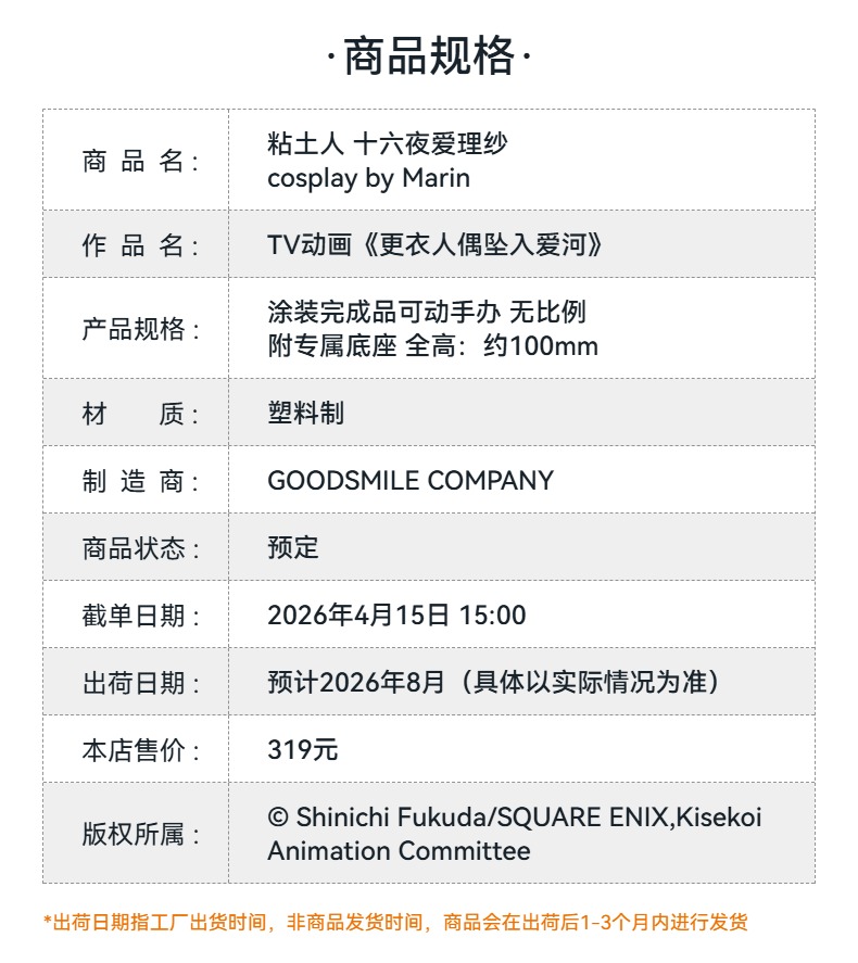 【GSC预售定金】粘土人 十六夜爱理纱 cosplay by Marin TV动画《更衣人偶坠入爱河》