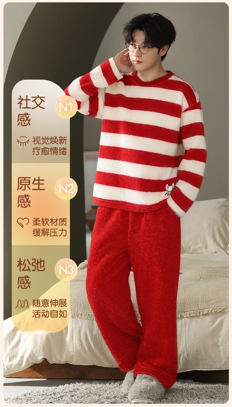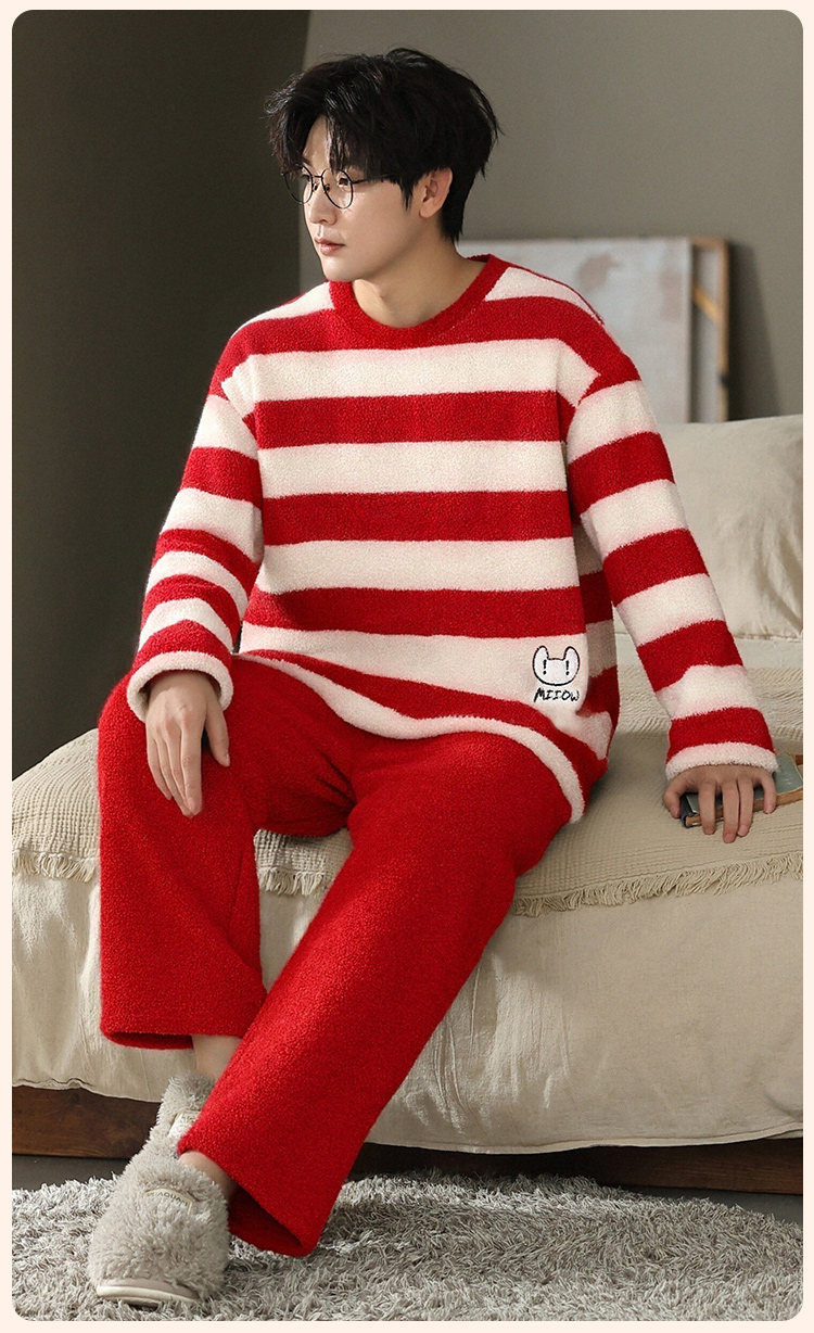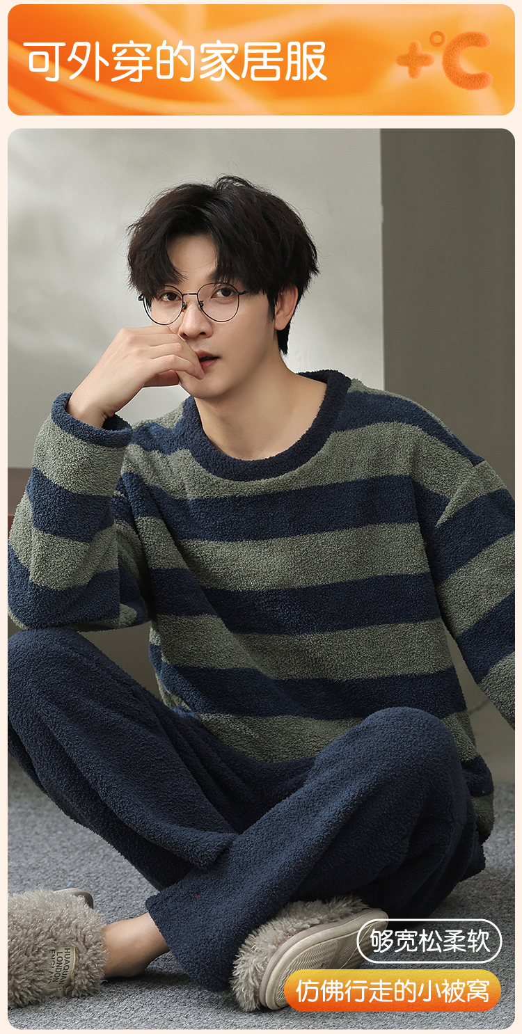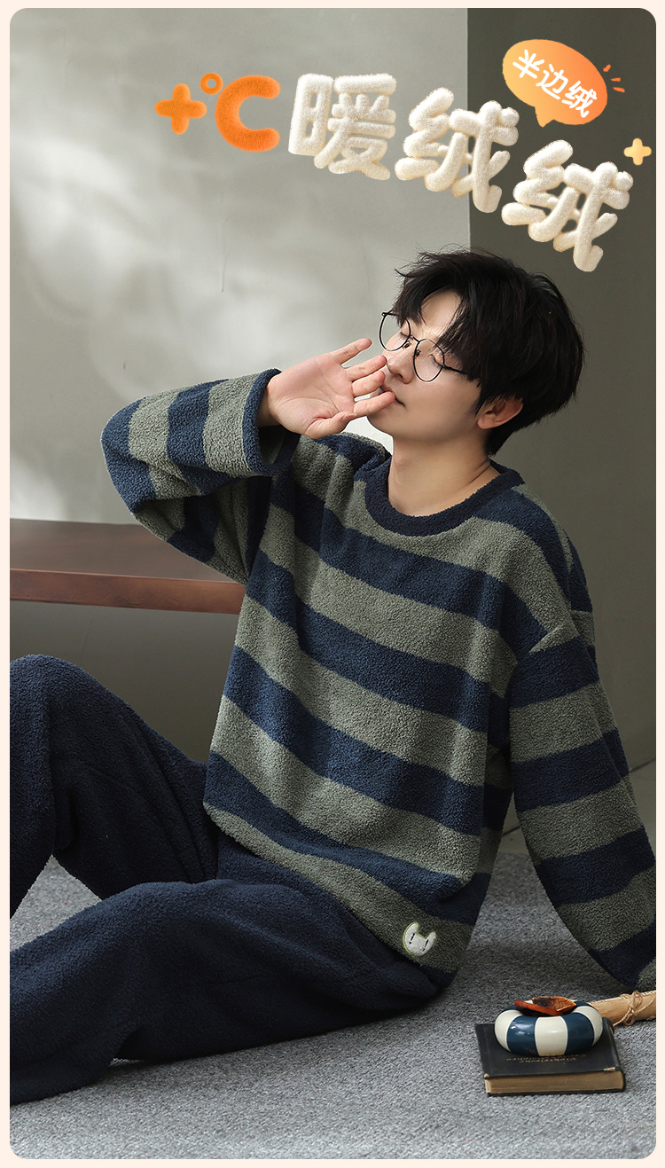 【L-3XL】【猫人】男士条纹半边绒家居服套装