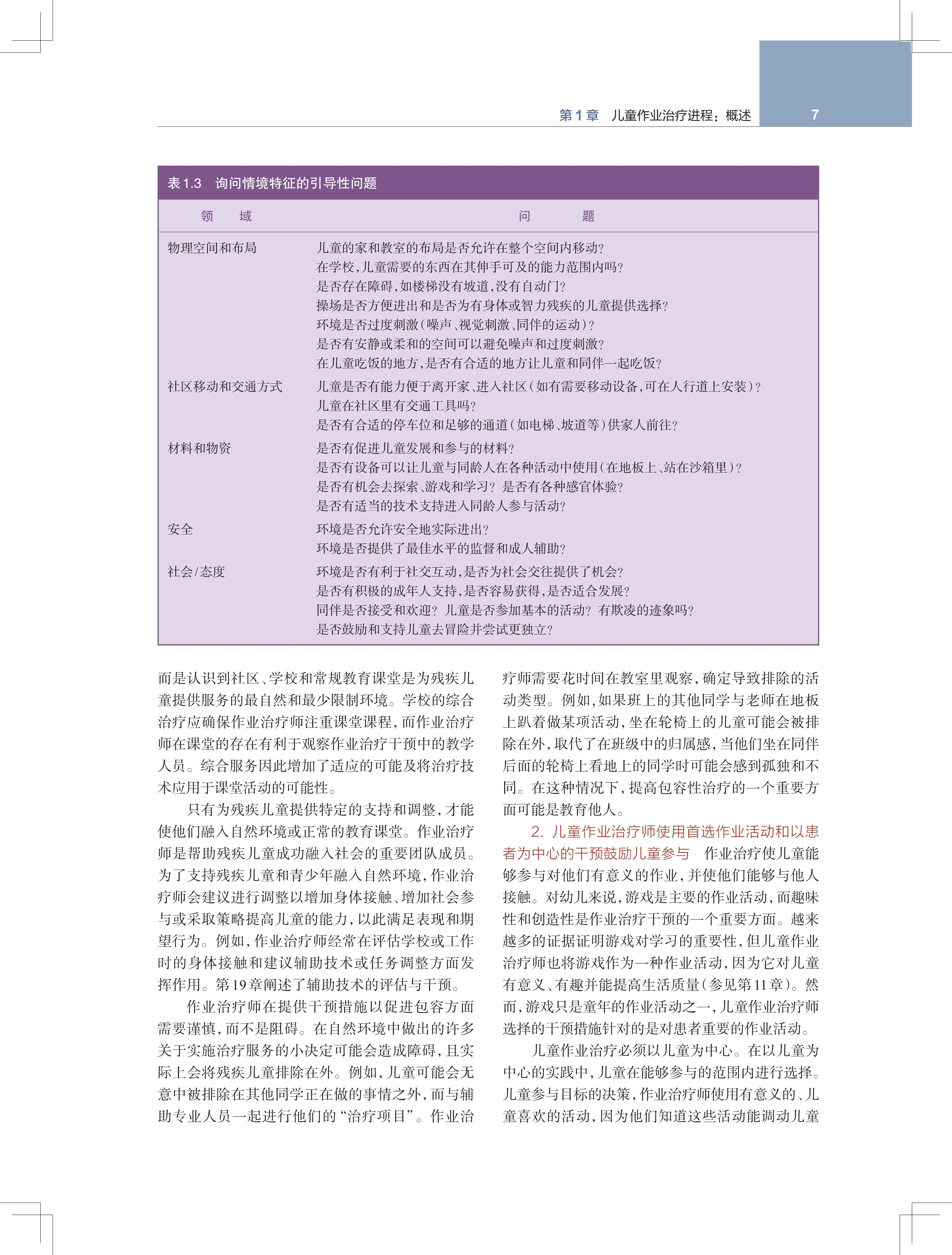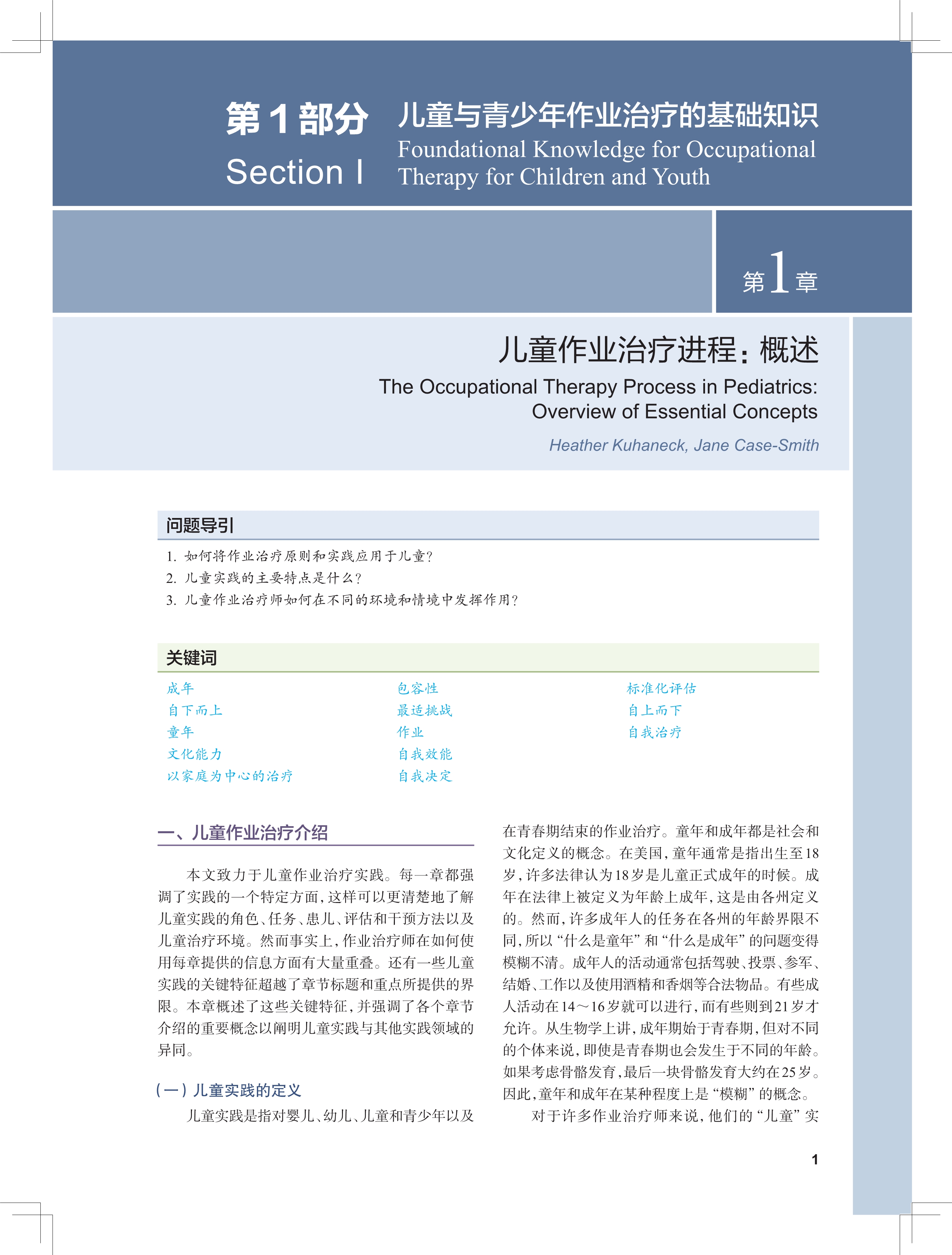 本书原著是美国儿童和青少年作业治疗专业教学的权威参考书。全书从婴幼儿到青少年阶段人体发育的特点出发,充分考虑环境因素对儿童发育的影响,通过详细阐述各个维度的作业评估方法,结合儿童常见致残性疾病,指导读者制订作业治疗方案和辅具评估方案。全书共分6部分,包括儿童与青少年作业治疗的基础知识、作业治疗评估与评价方法及过程、作业活动的评估与治疗、作业治疗方法、具体疾病的作业治疗。