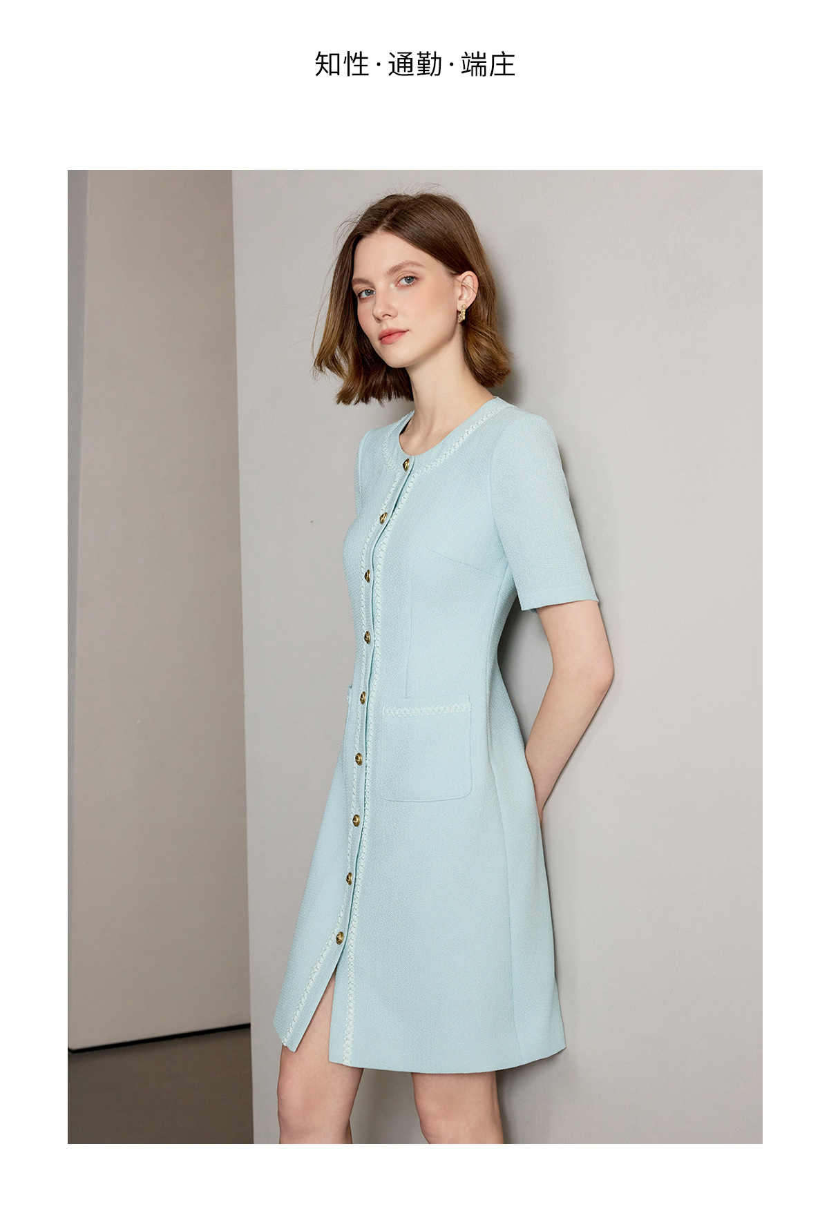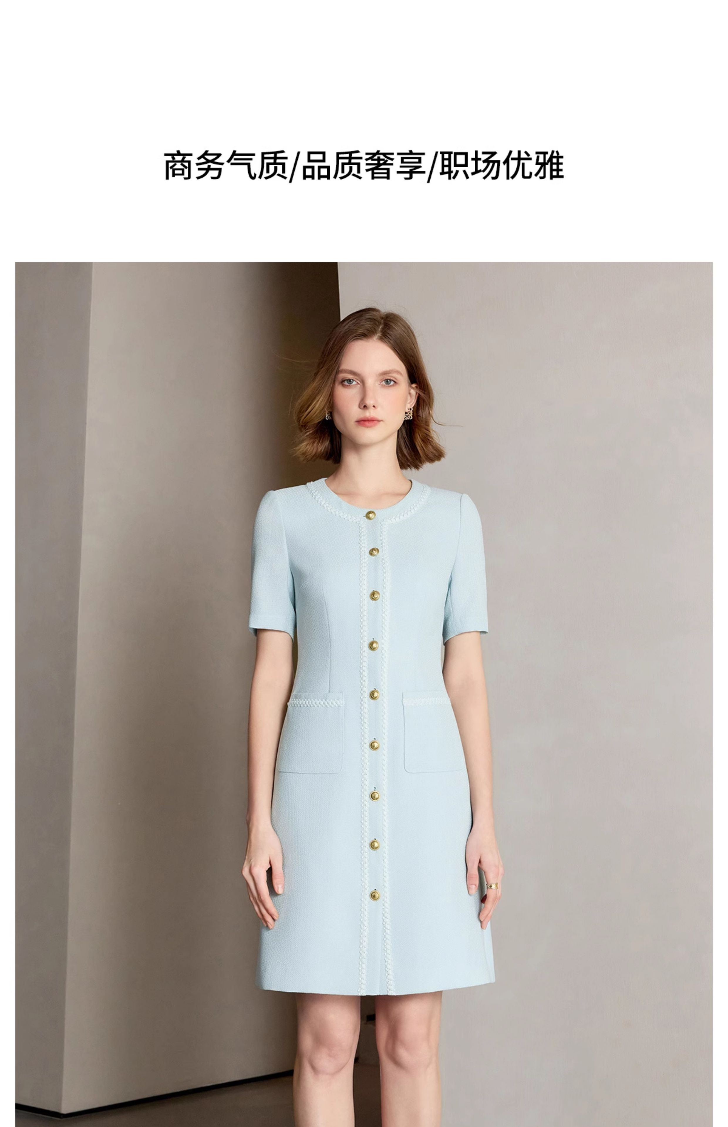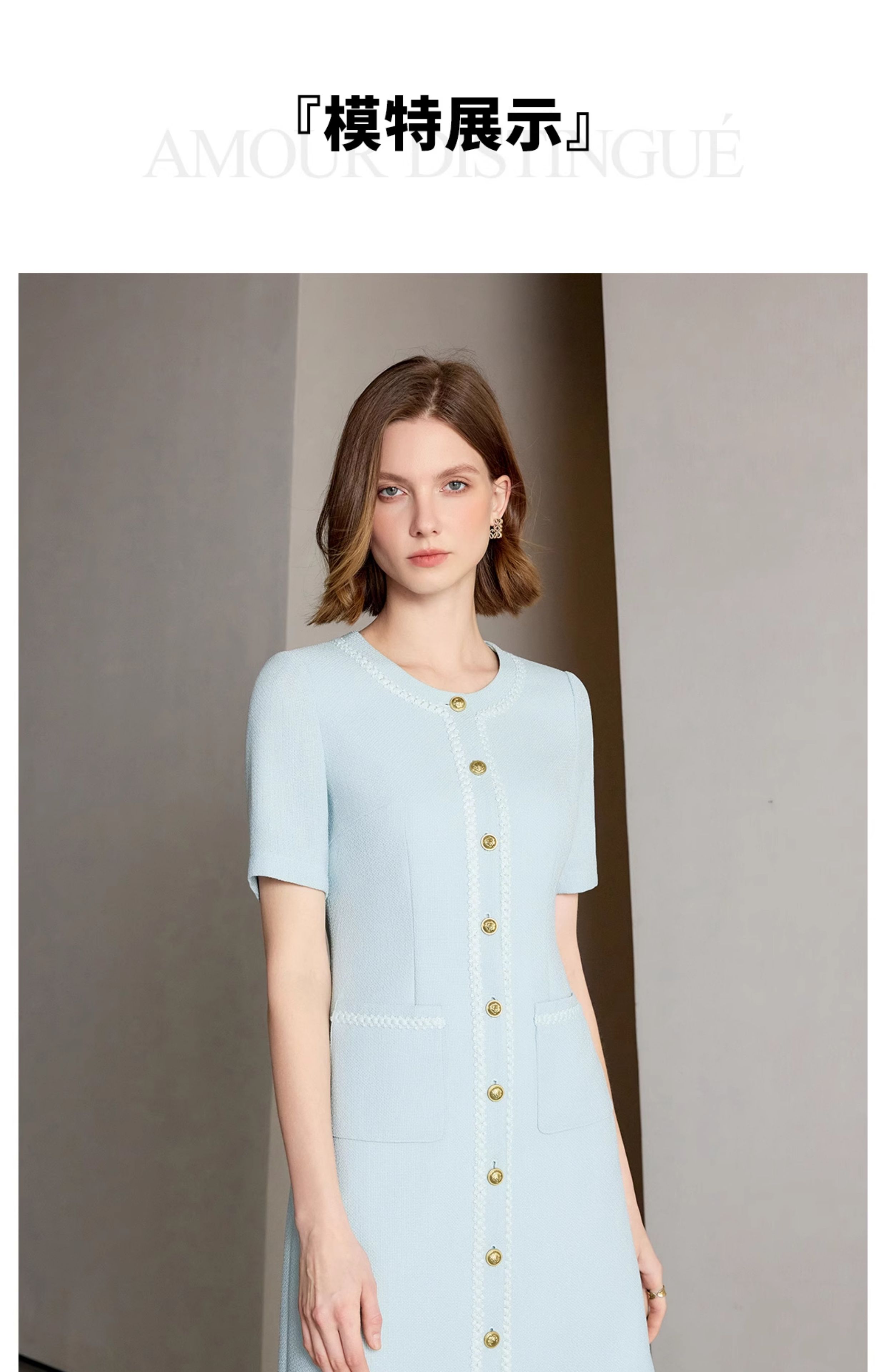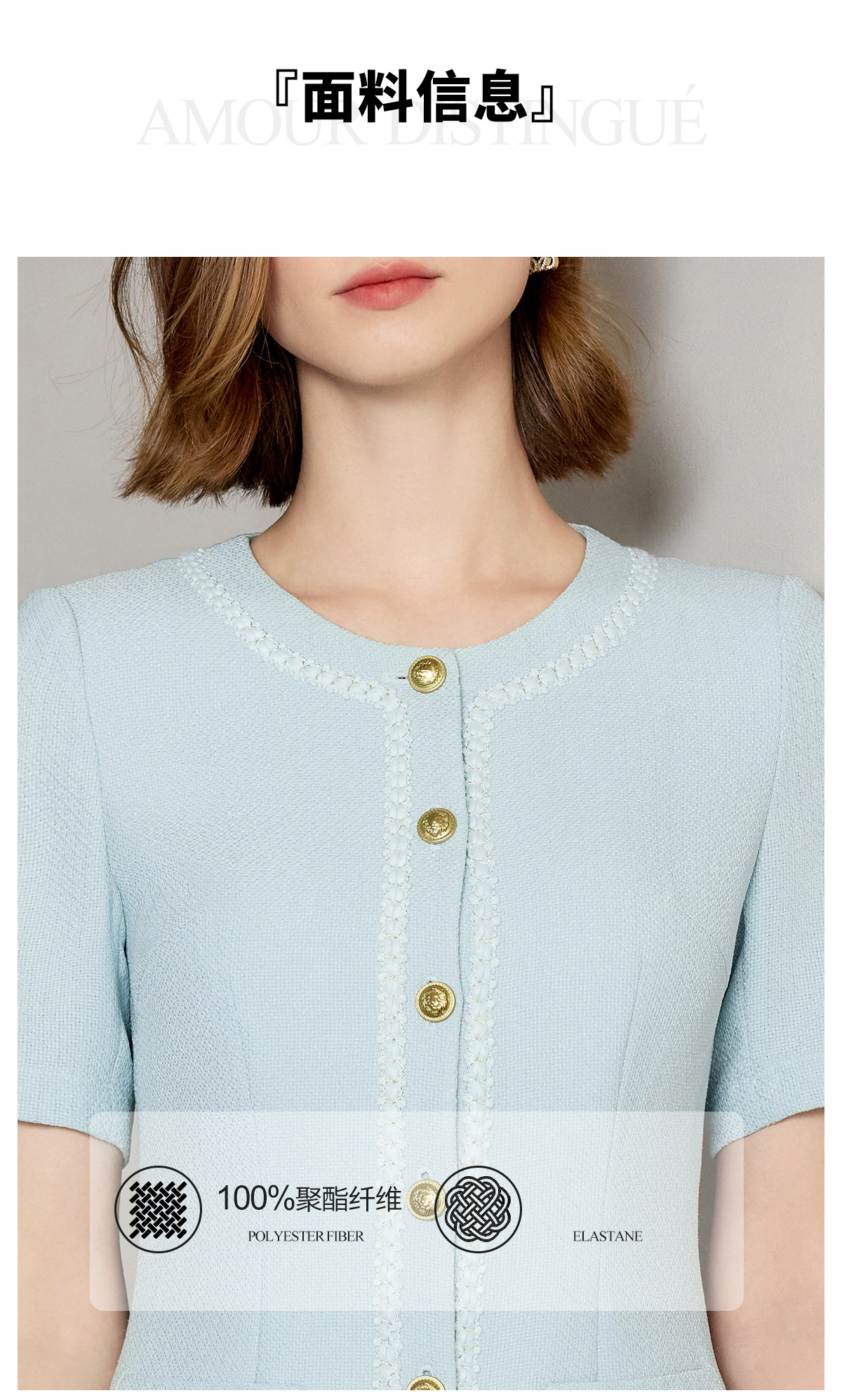 IWY/气质小香风蓝色短袖连衣裙女夏季薄款圆领西装裙Q1323