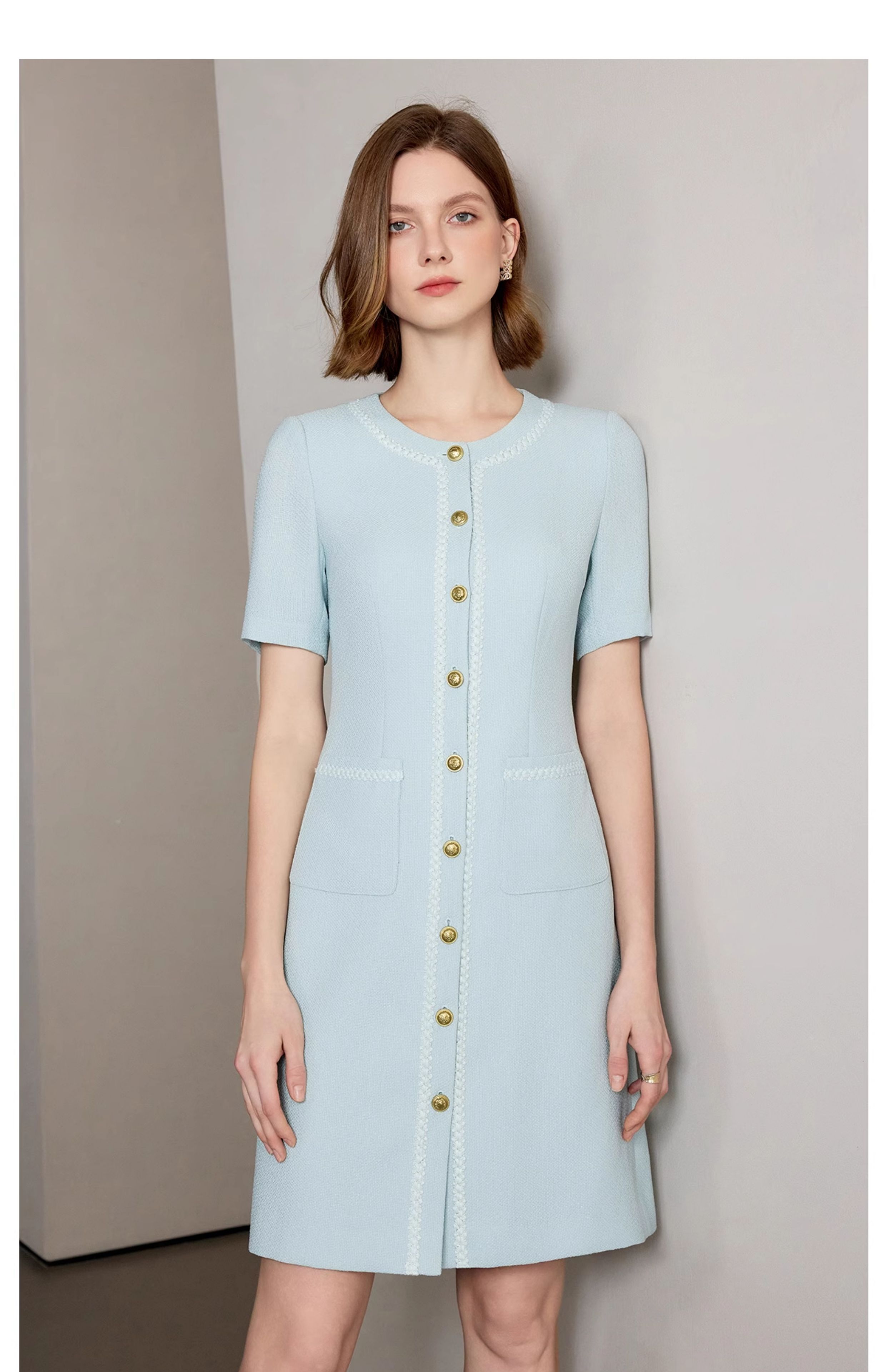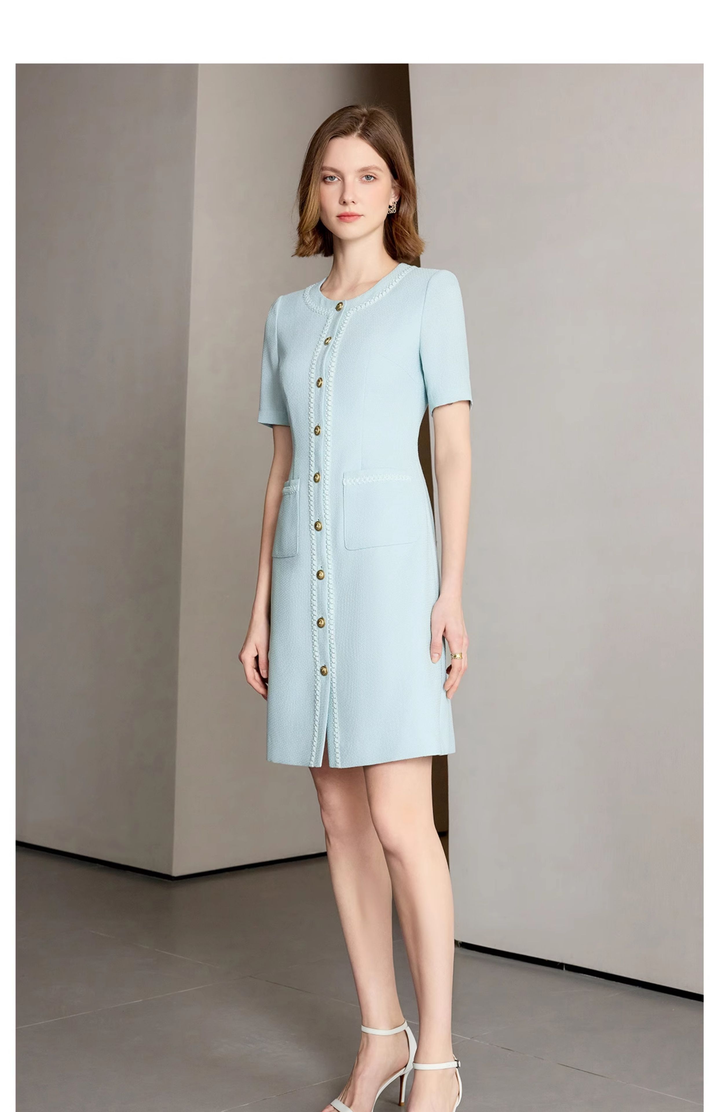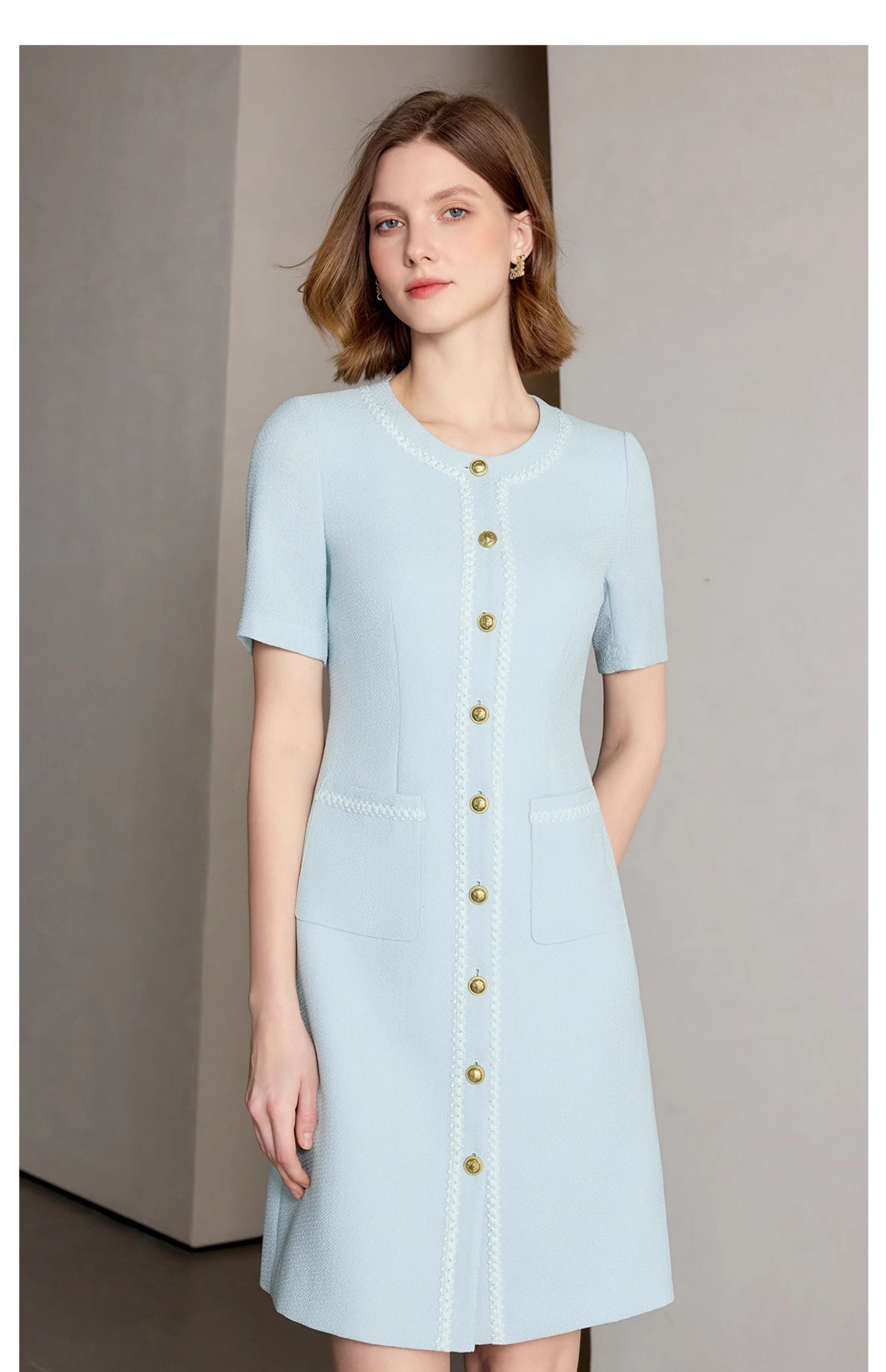 IWY/气质小香风蓝色短袖连衣裙女夏季薄款圆领西装裙Q1323