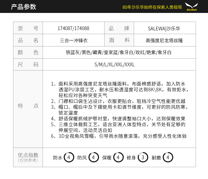 SALEWA沙乐华/女式三合一抓绒冲锋衣 174088