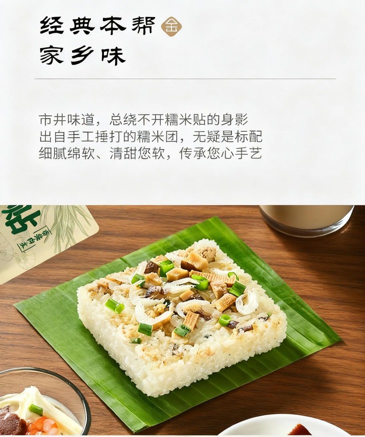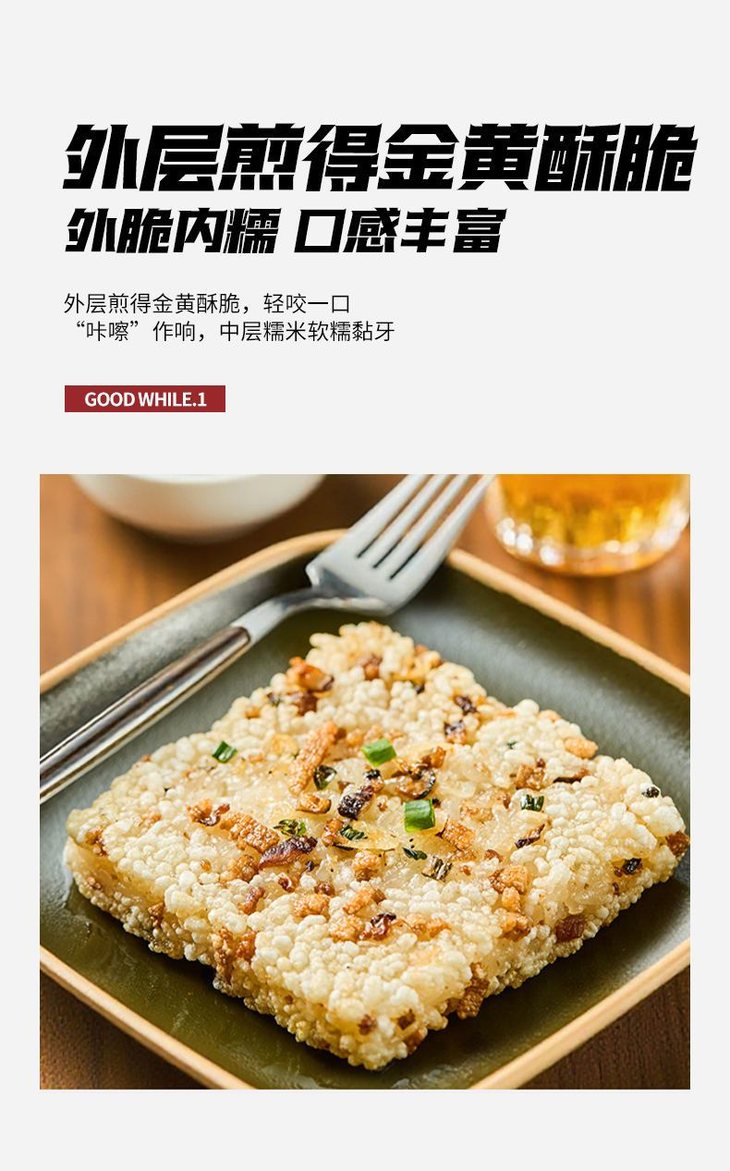 匠心手作,煎制锁香 甄选新鲜糯米,遵循古法浸泡 慢蒸工艺,细火慢煮牢牢锁住 米香,再用磨具压成方形,而后 放入有猪油的煎锅炸至金黄色 再撒上葱花与虾皮就算完工