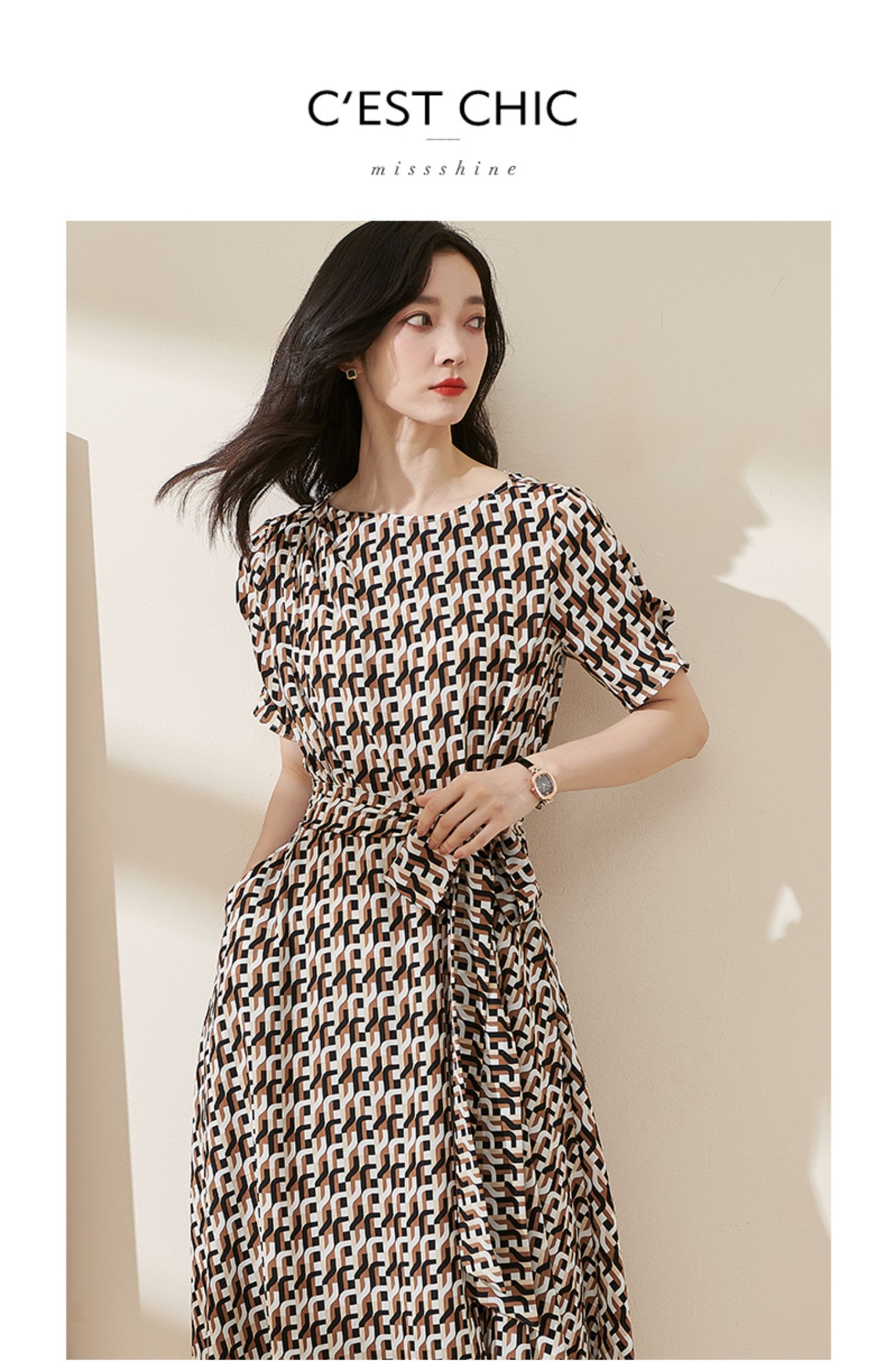 米思阳2024夏季新款时尚印花短袖一字领连衣裙优雅大摆中长裙1441