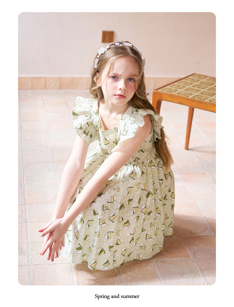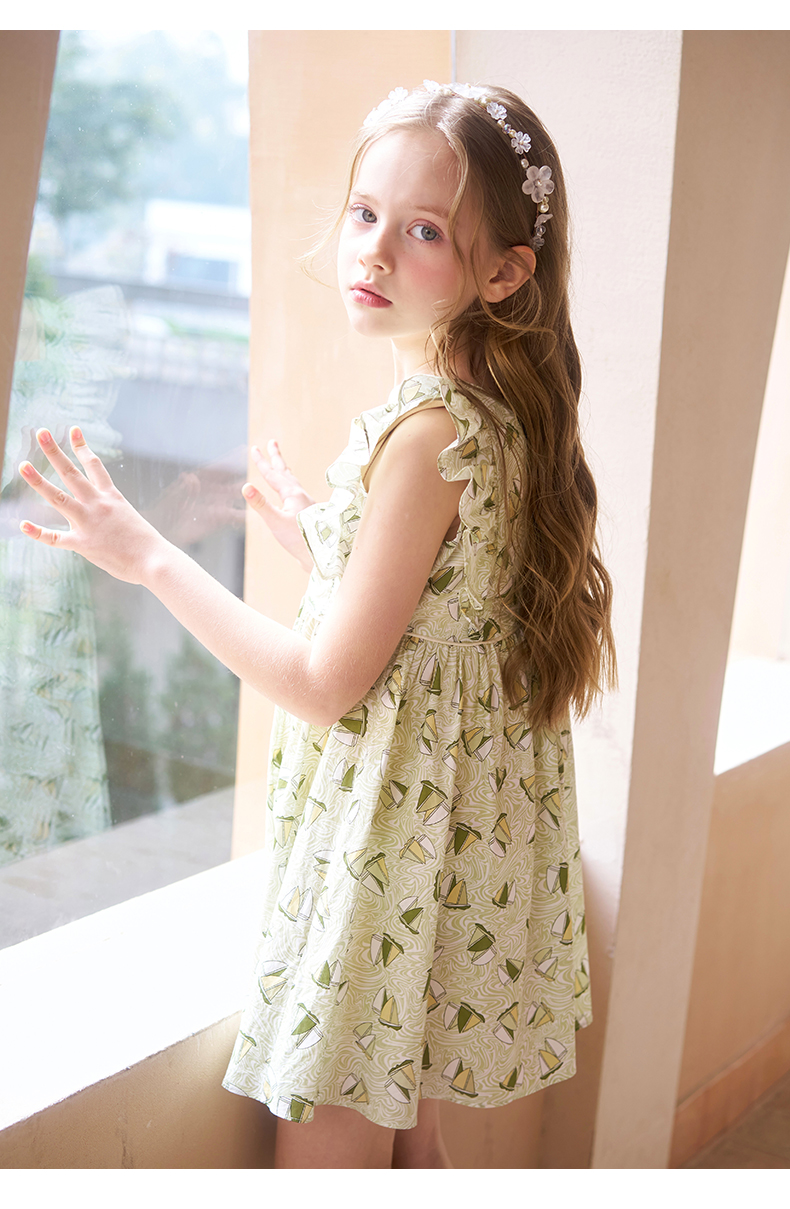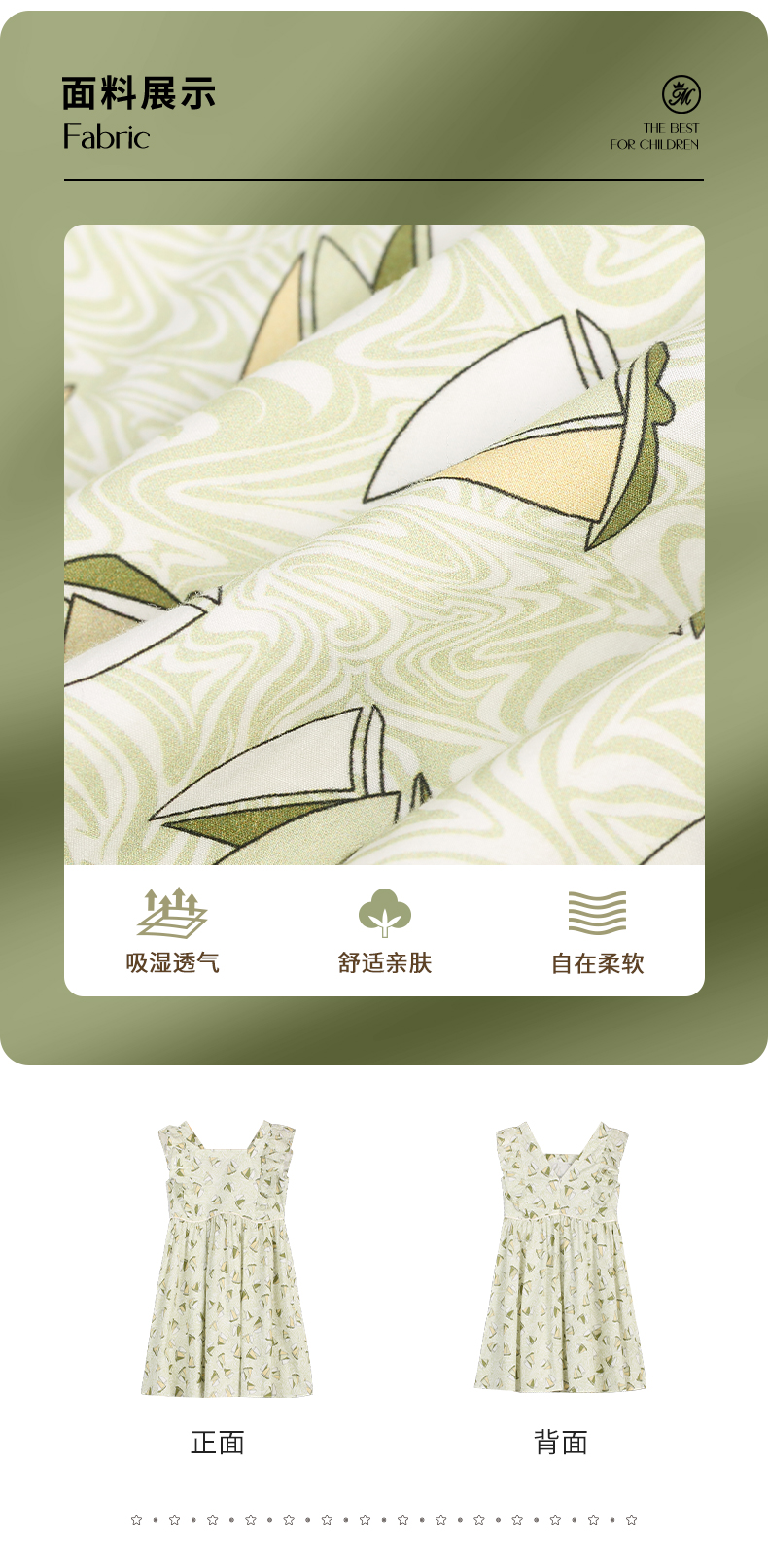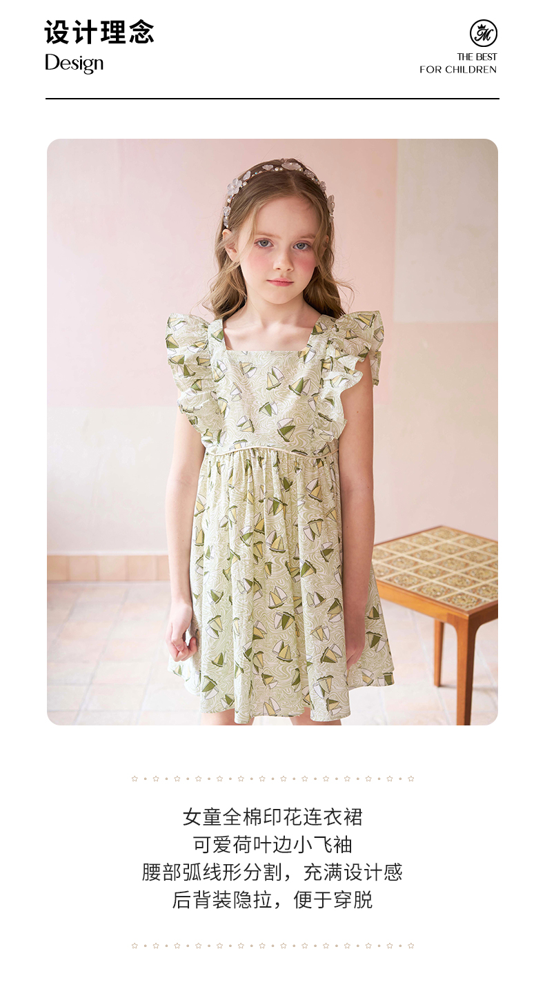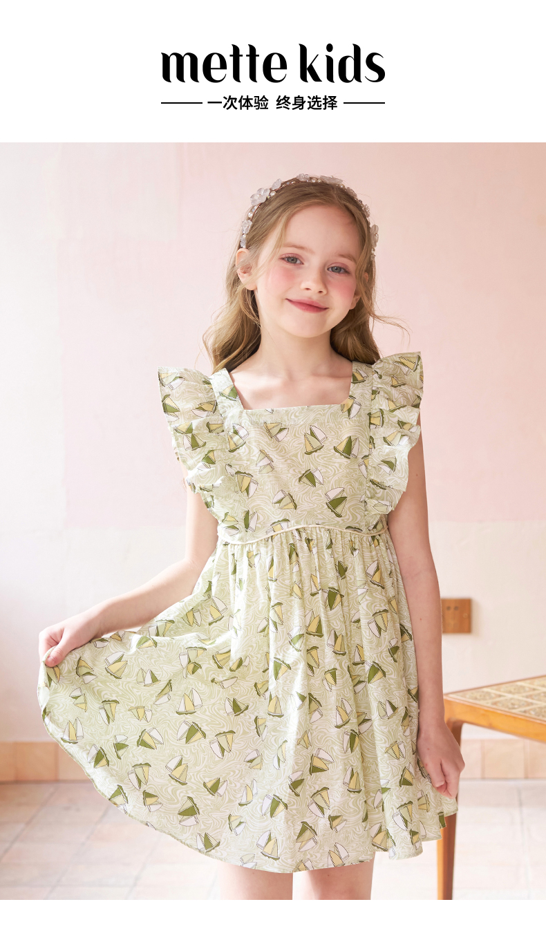 mettekids女童连衣裙夏季新款中大童绿色印花裙子儿童洋气公主裙