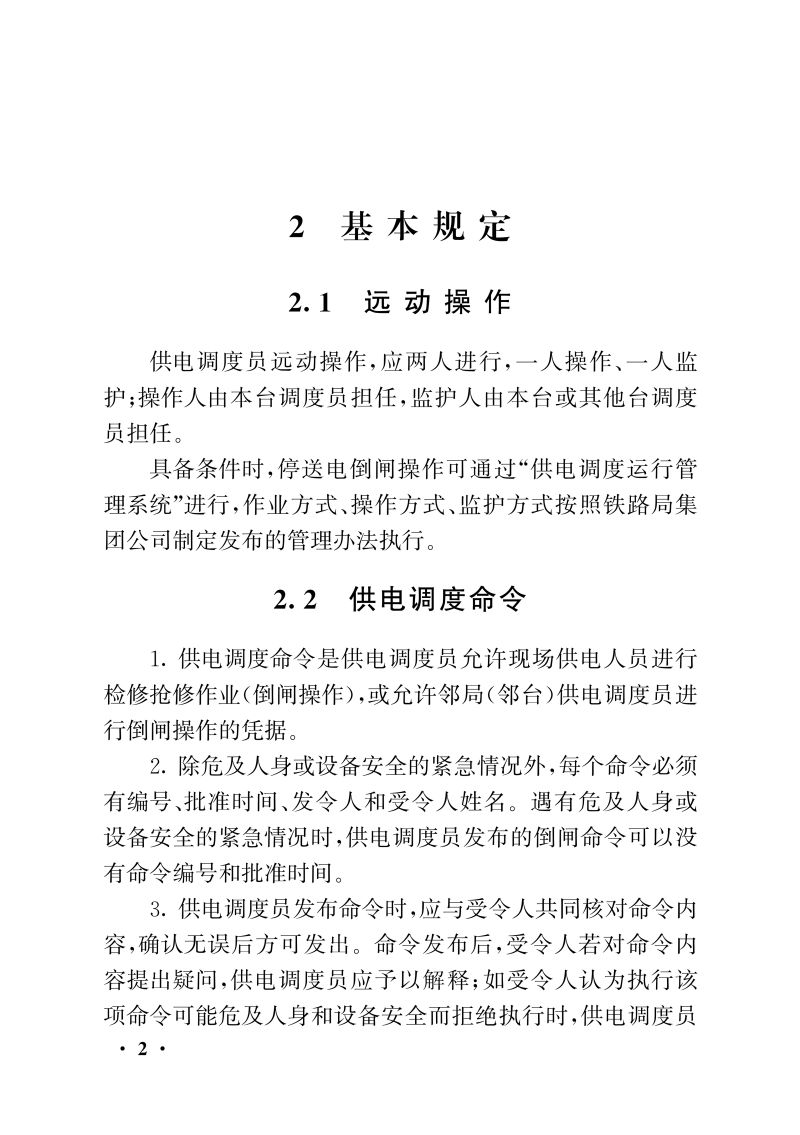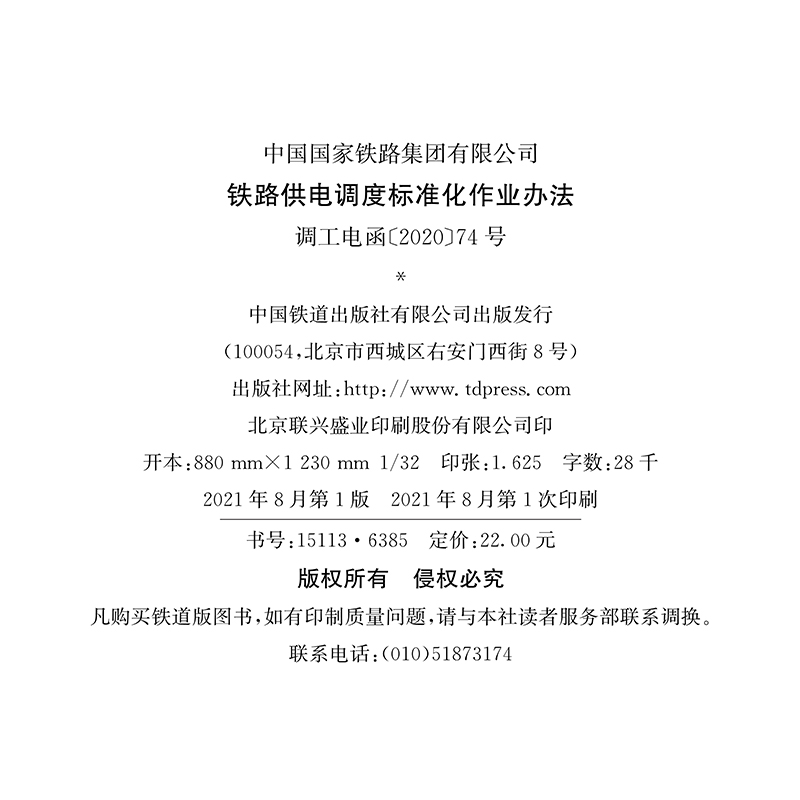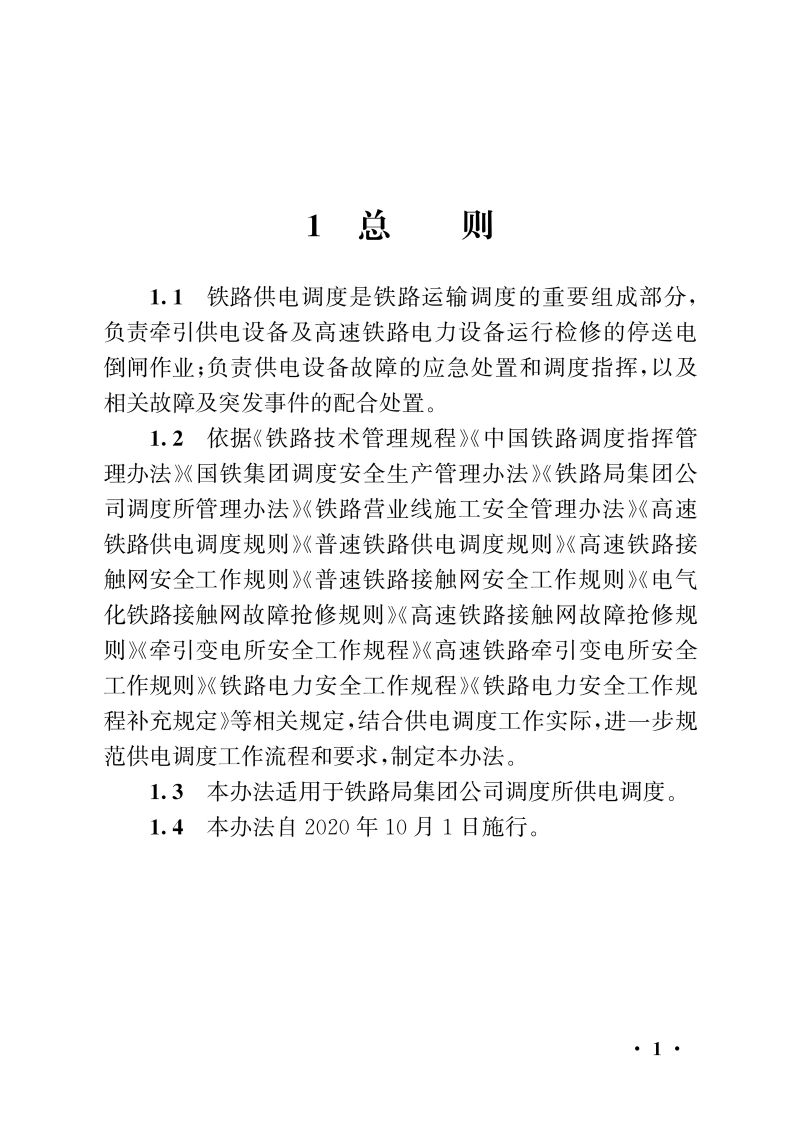为加强供电调度安全基础建设,明晰管理责任,规范管理制度,增强运输生产合力,在深入研判历年供电调度作业事故教训和安全风险的基础上,中国国家铁路集团有限公司调度中心组织编制了《铁路供电调度标准化作业办法》。本作业办法一共包含7个部分,主要包括总则、接触网作业、牵引变电所亭设备作业、高速铁路电力设备作业、远动系统作业、供电调度应急处置等内容。本作业办法可供各铁路局集团公司组织相关从业人员学习并贯彻执行。