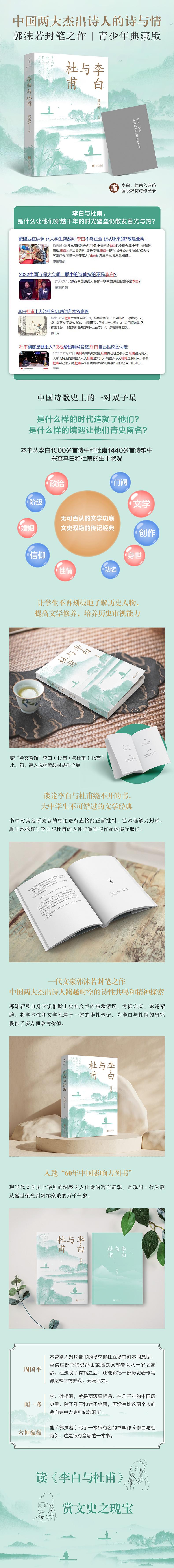★谈论李白与杜甫绕不开的书,让学生不再刻板地了解历史人物,提高文学修养,培养历史审视能力。 ★一代文豪郭沫若封笔之作,中国两大杰出诗人跨越时空的诗性共鸣和精神探索。 ★揭开唐诗引领中华文化千年的秘密,生动还原了李白和杜甫的生平状况。 ★深入探寻两位杰出诗人的内心追逐与挣扎,解析中国仕人人格与仕途之路的矛盾与冲突。 ★入选“60年中国影响力图书”,大中学生不可错过。 ★赠“全文背诵”李白(17首)与杜甫(15首)小、初、高入选统编教材诗作全。 ★周国平极力推荐:重读这部书我仍然由衷的钦佩郭老以八十岁之高龄,在遭丧子惨祸之后,还能够把一部历史著作写得这样文情并茂,充满活力。