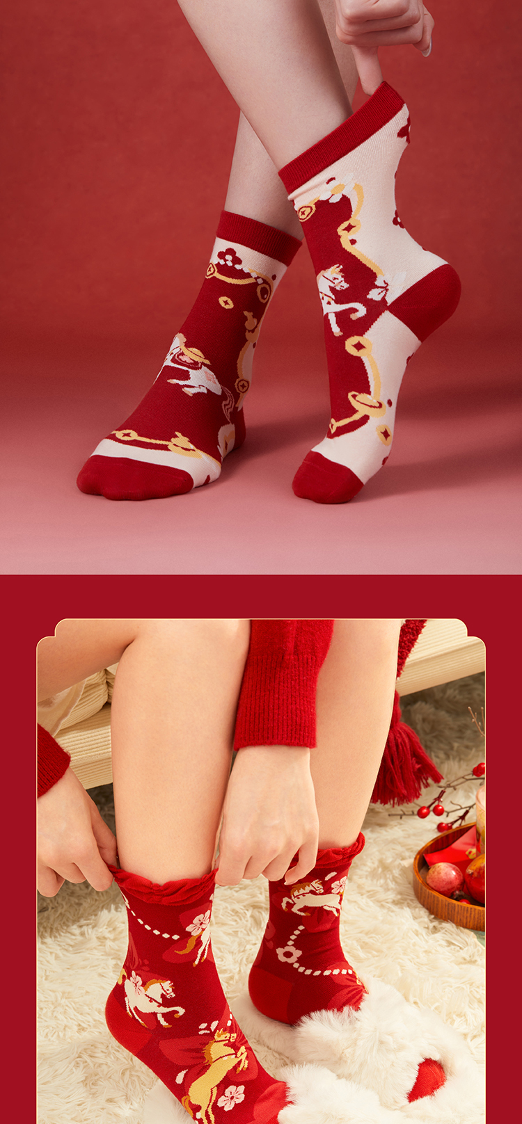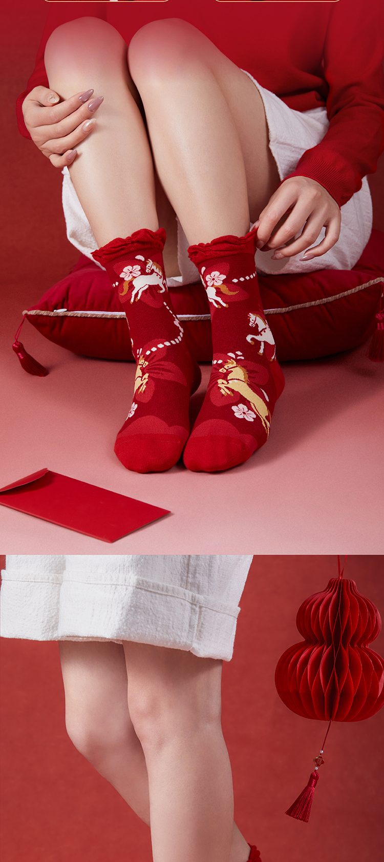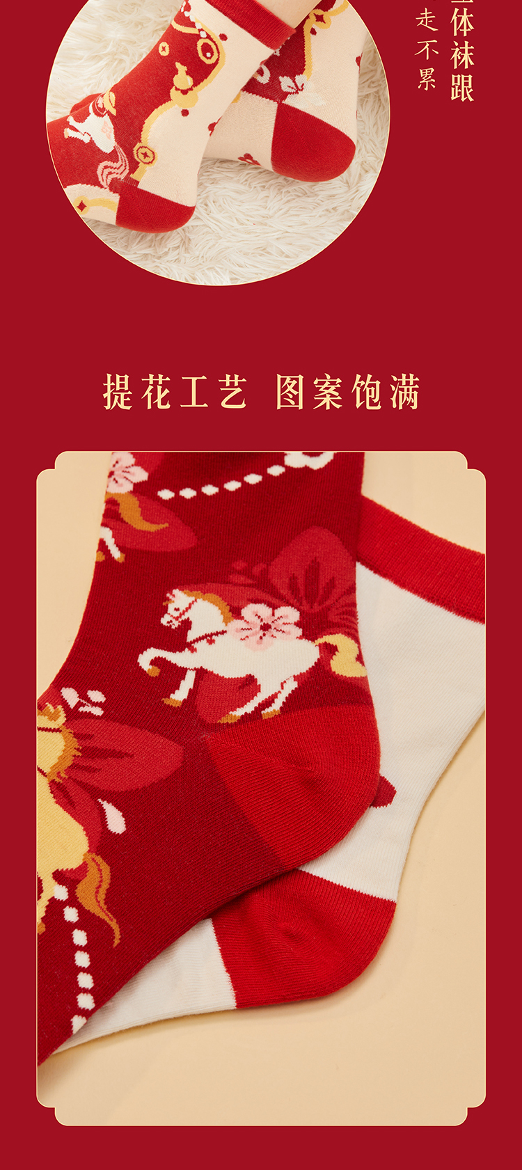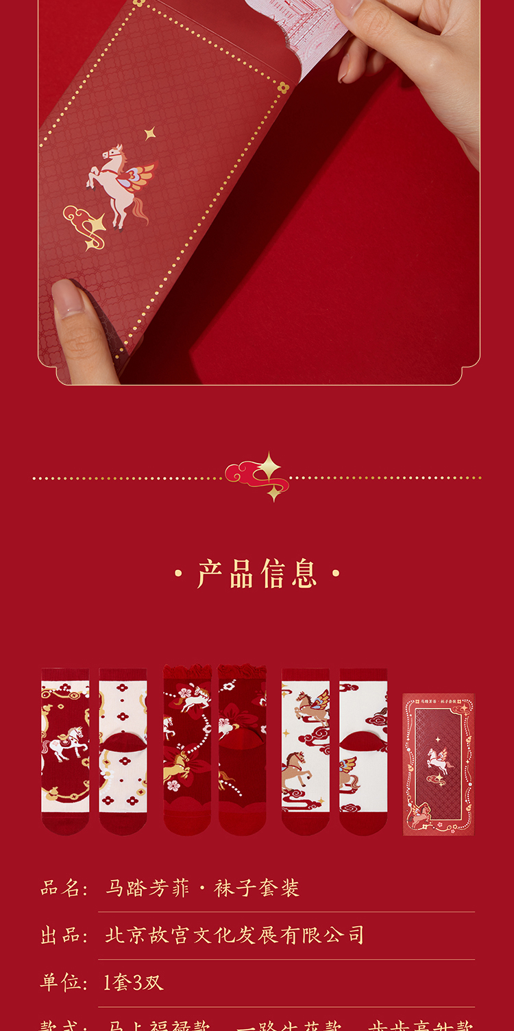 【故宫袜子】马踏芳菲袜子女中筒袜秋冬红袜子新年马年本命年礼盒