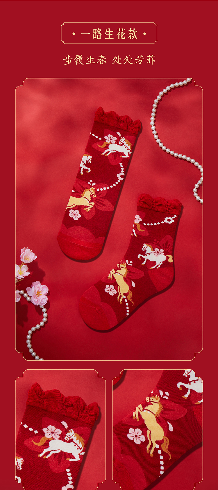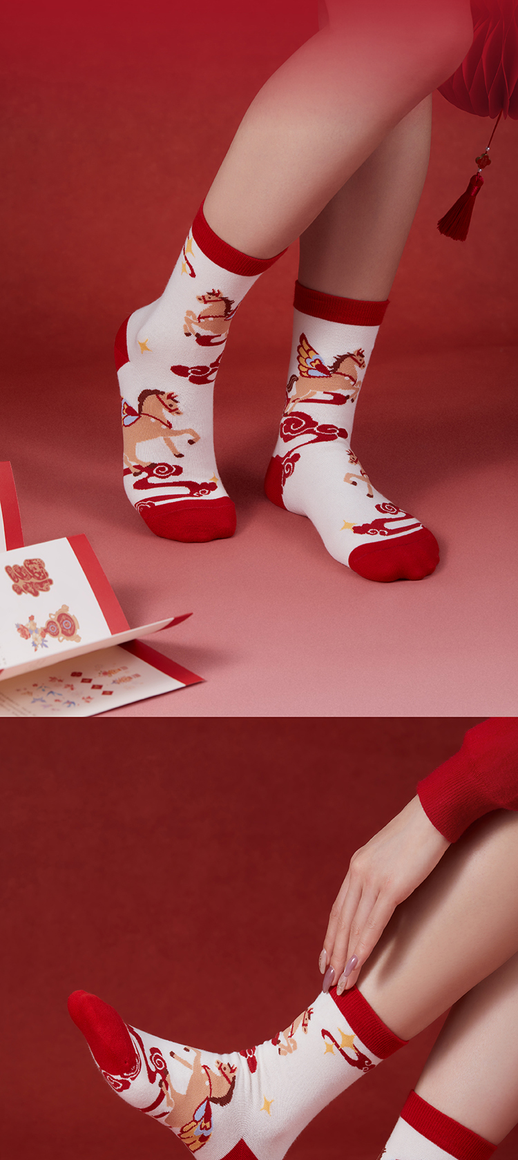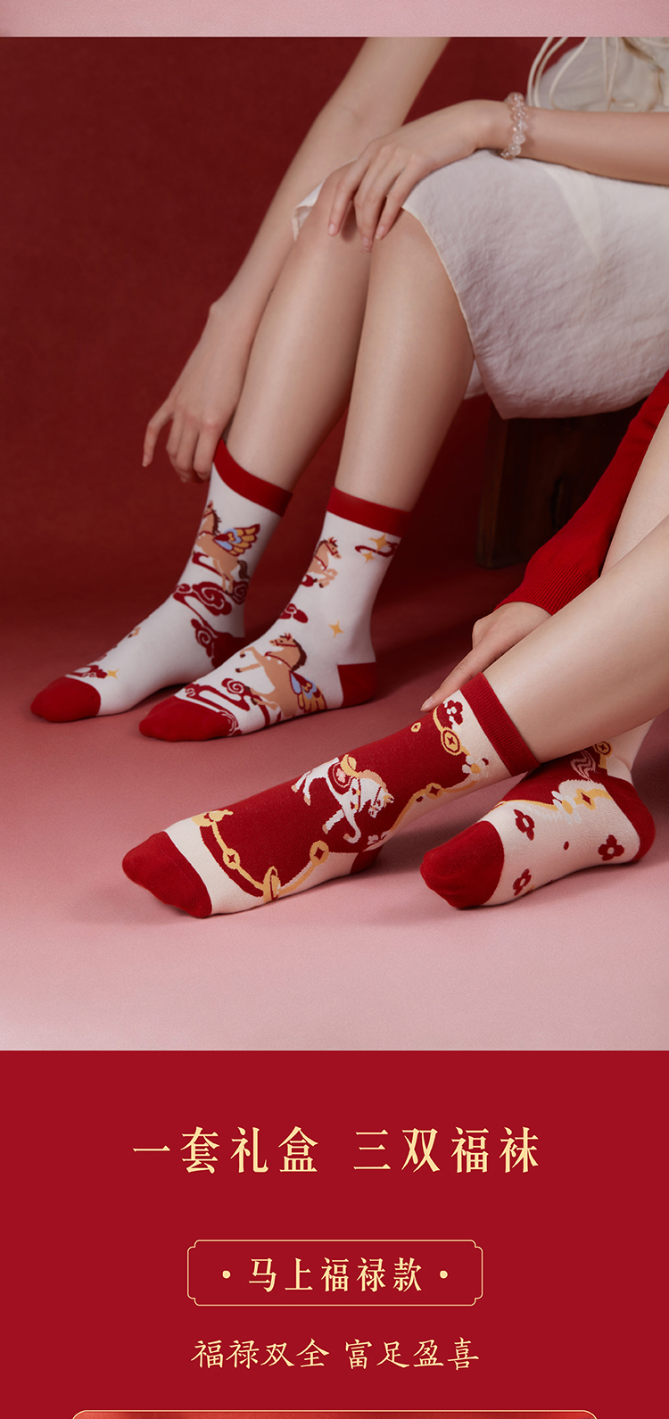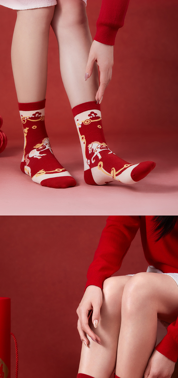 【故宫袜子】马踏芳菲袜子女中筒袜秋冬红袜子新年马年本命年礼盒
