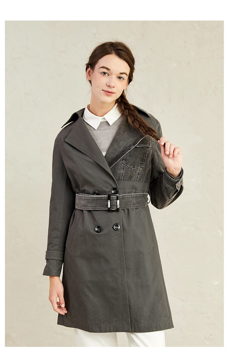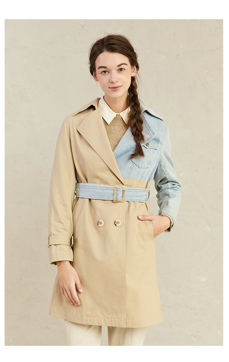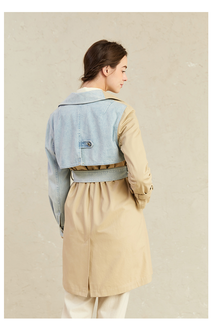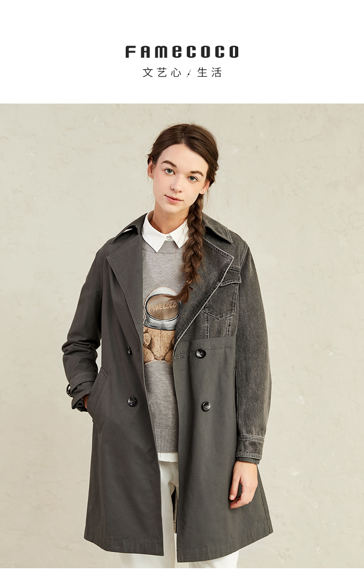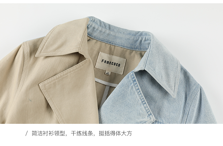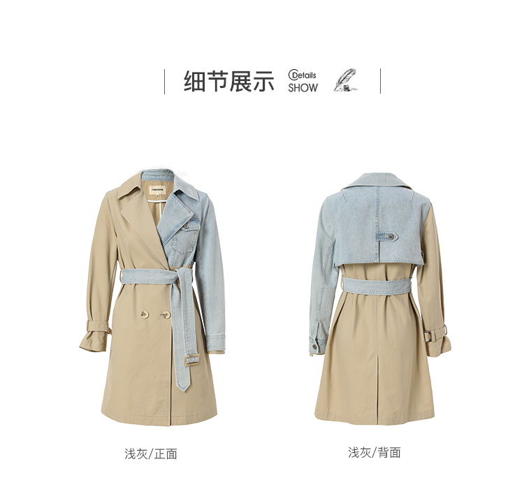 Famecoco范可儿牛仔拼接风衣女中长款小个子收腰外套F221AA005
