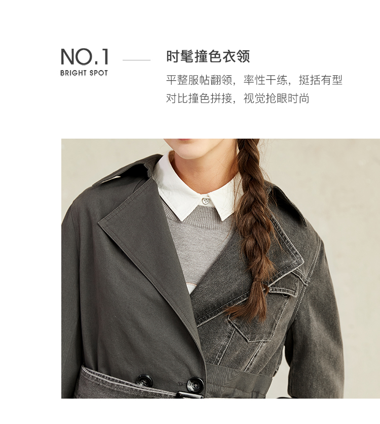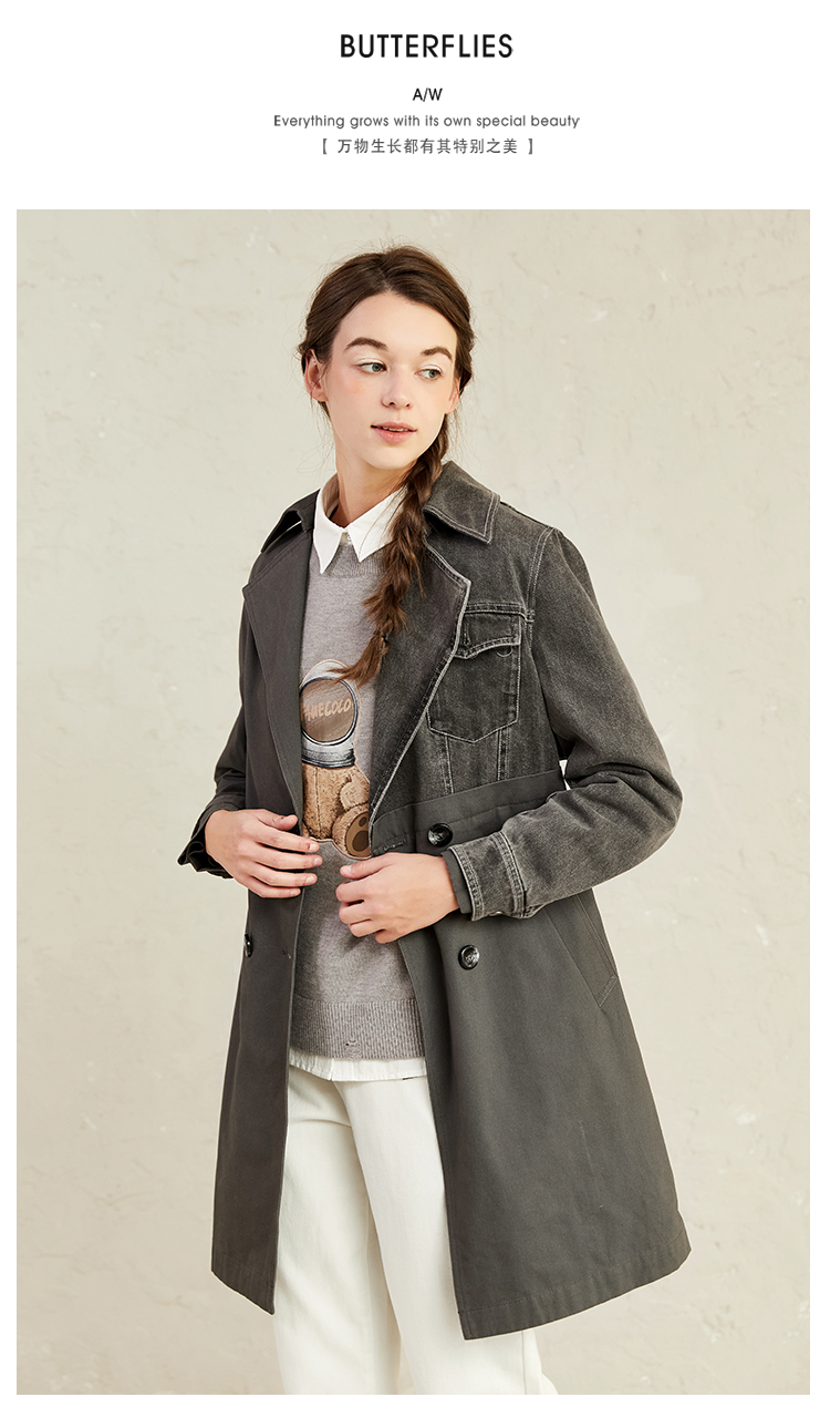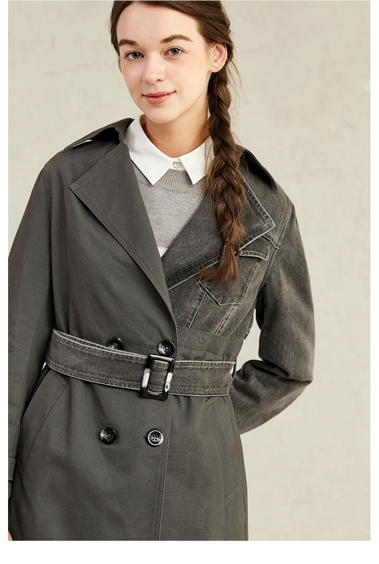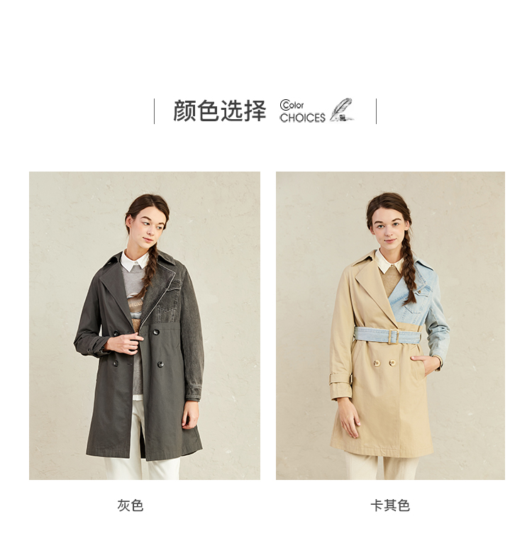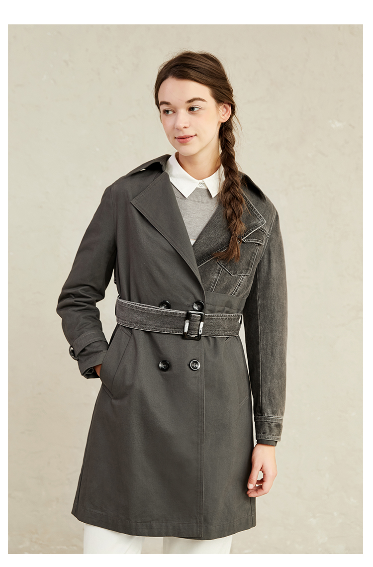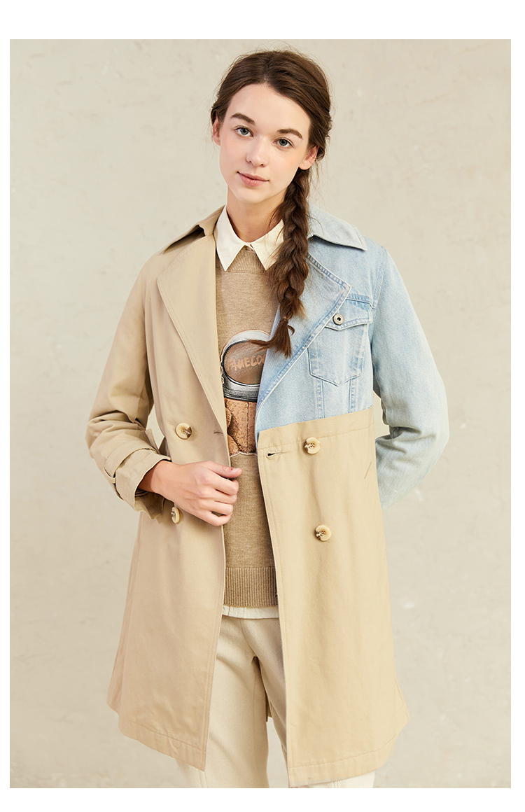 Famecoco范可儿牛仔拼接风衣女中长款小个子收腰外套F221AA005