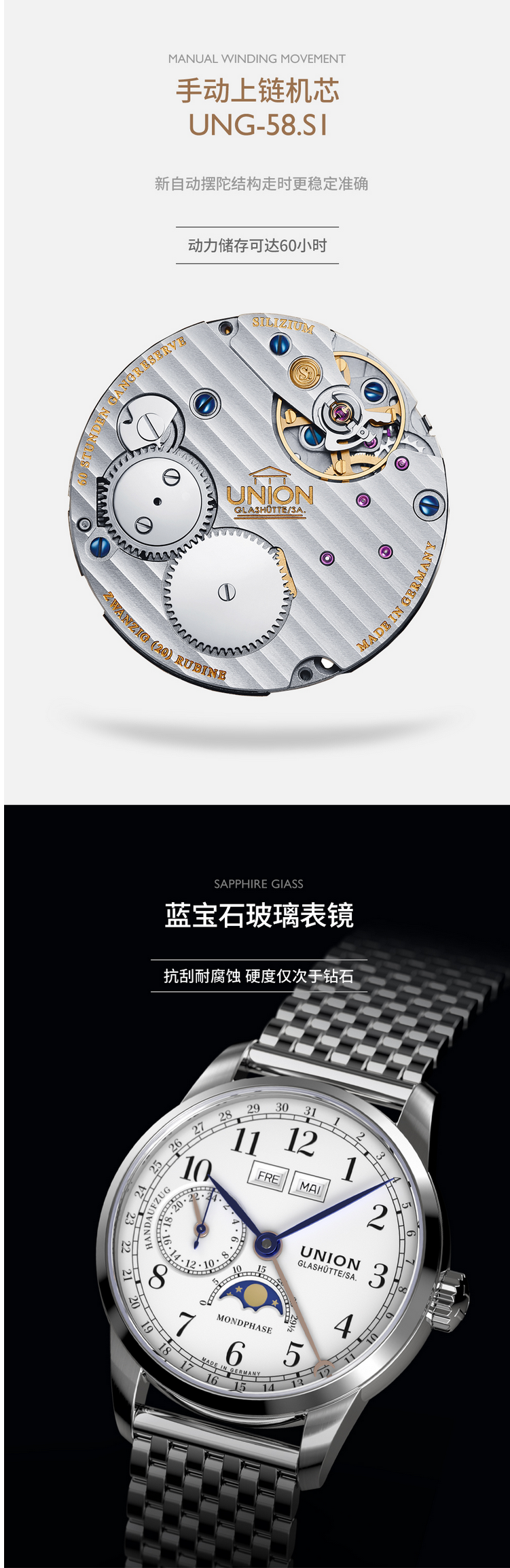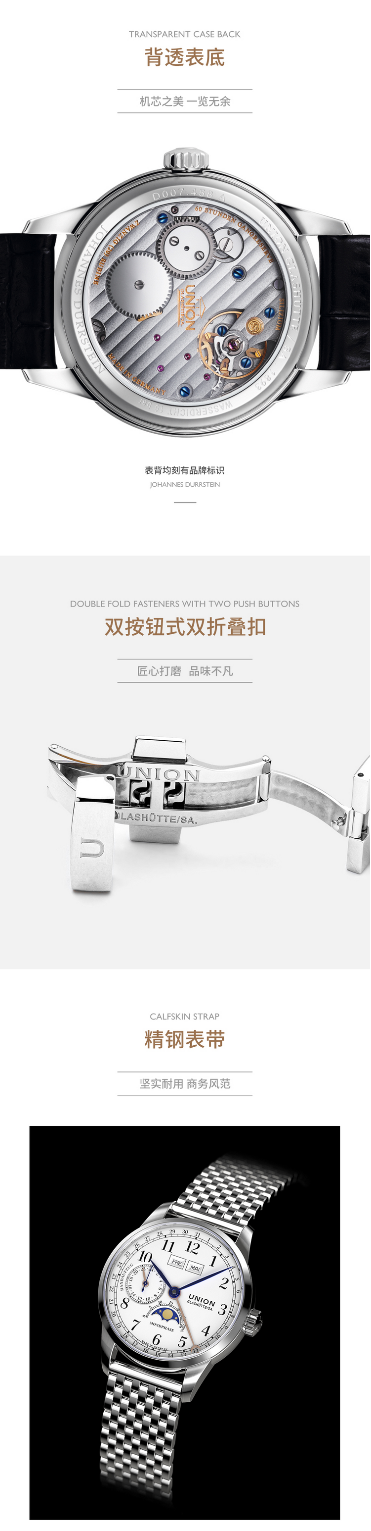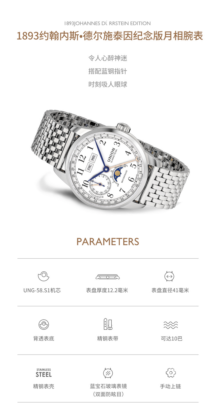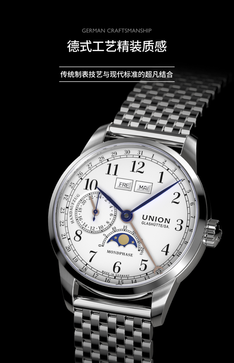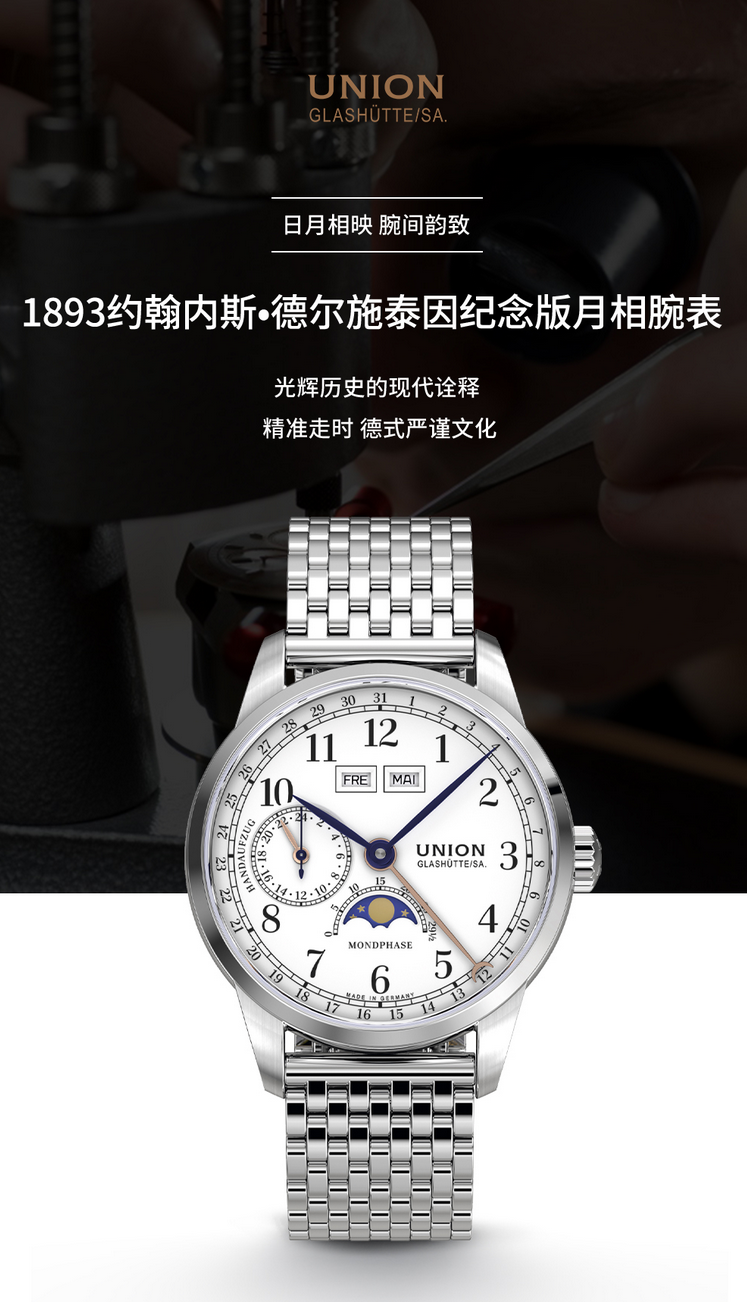 宇联(UNION GLASHÜTTE)德国月相手表 1893纪念版手动上链男士月相钢带腕表 D007.458.11.017.00