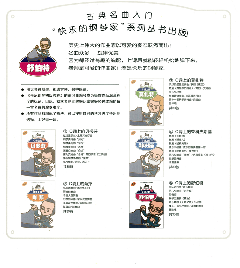 路德维希·凡·贝多芬是伟大的德国作曲家、维也纳古典乐派代表人物之一,对世界音乐的发展有着举足轻重的作用,被世人尊称为“乐圣”。 《C调上的贝多芬(原版引进)》是“快乐的钢琴家”系列之一,将贝多芬的 音乐主题,由琴谷小绪里、松波里香改编成 容易的只在白键上弹奏的版本,每首乐曲还有简短、生动的介绍。
