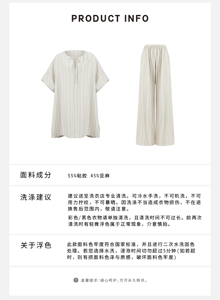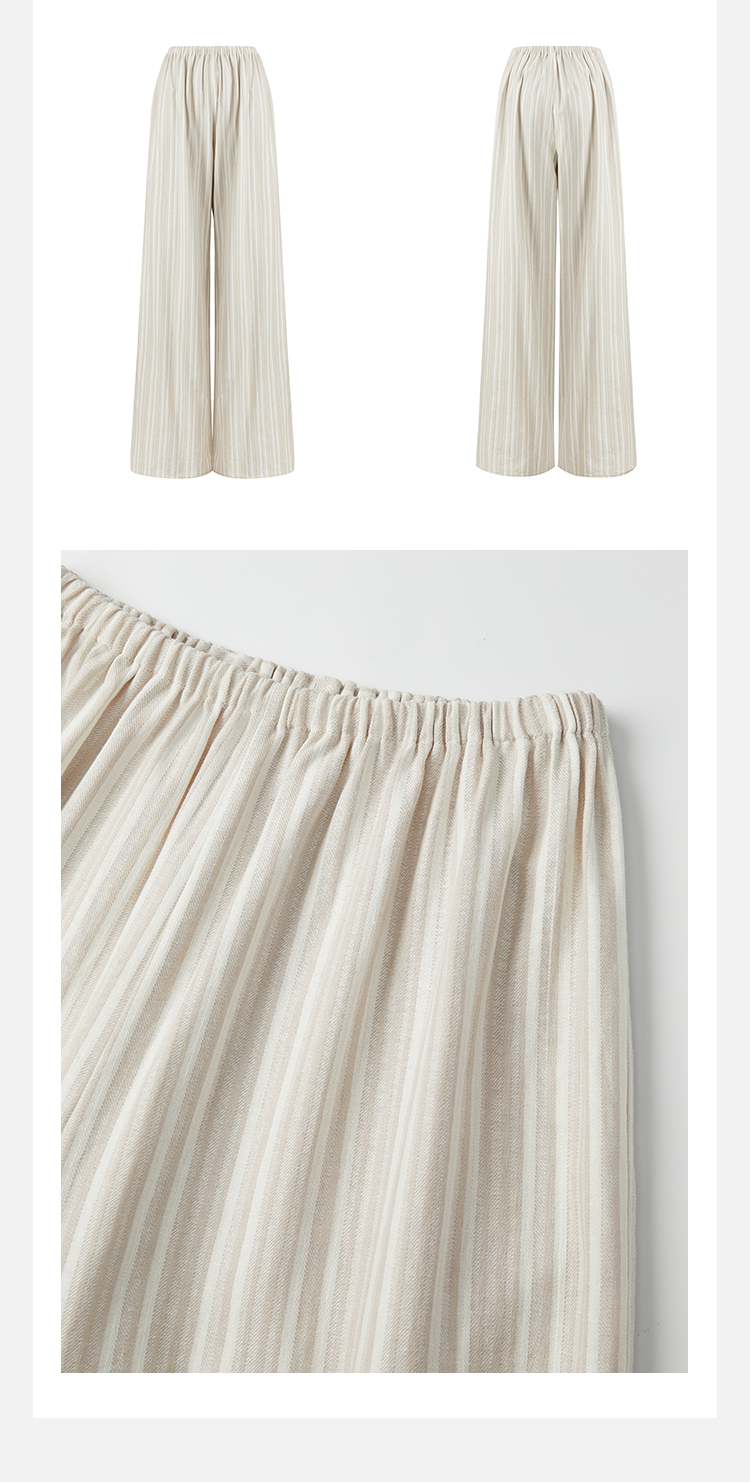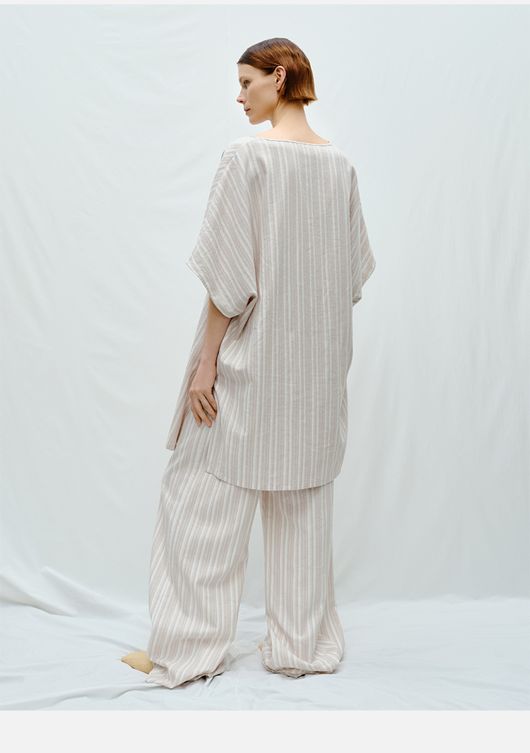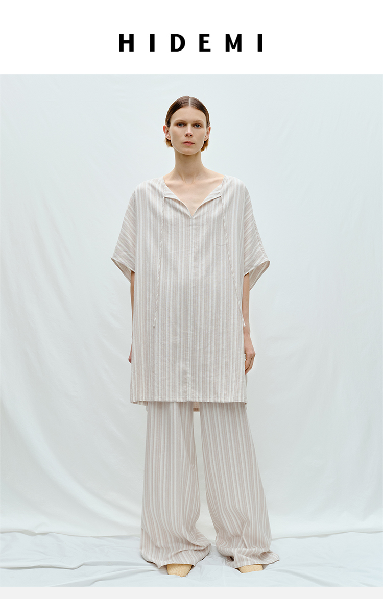 HIDEMI度假系列条纹亚麻开口领廓形套装 上衣/阔腿裤