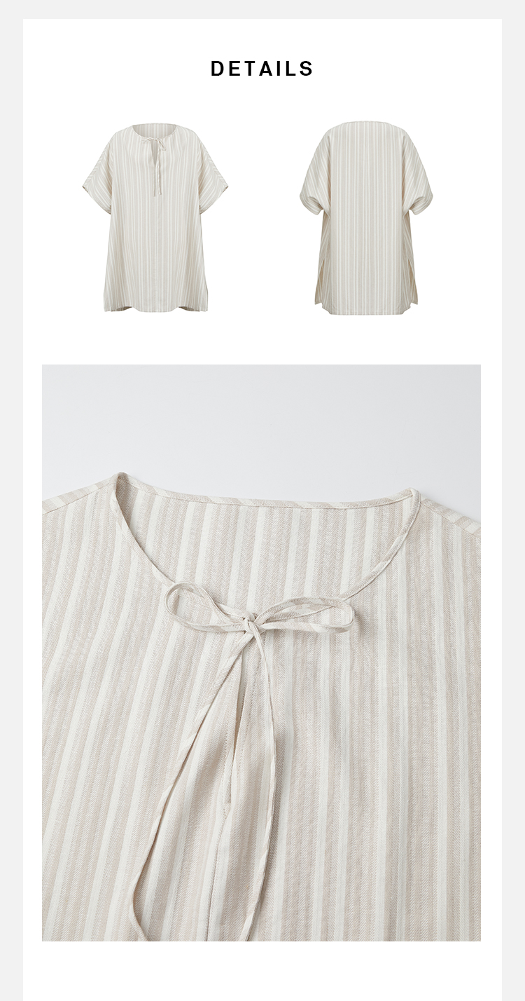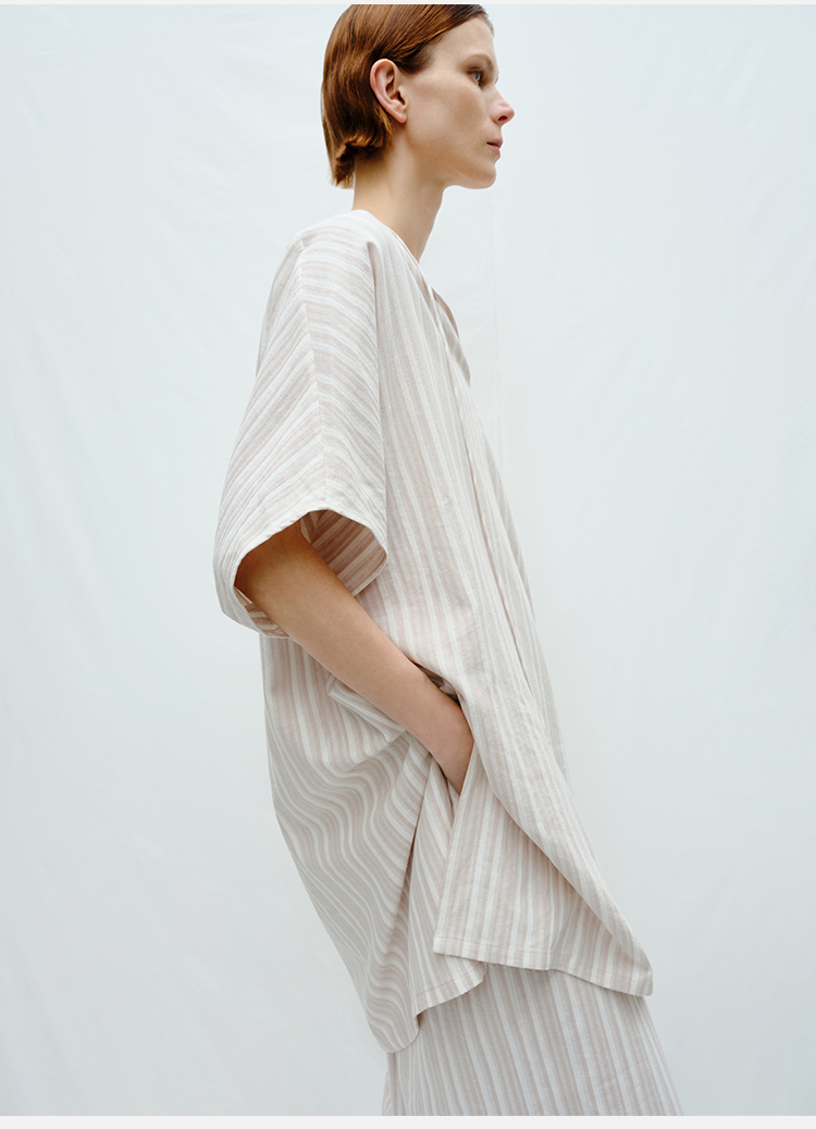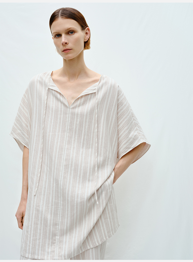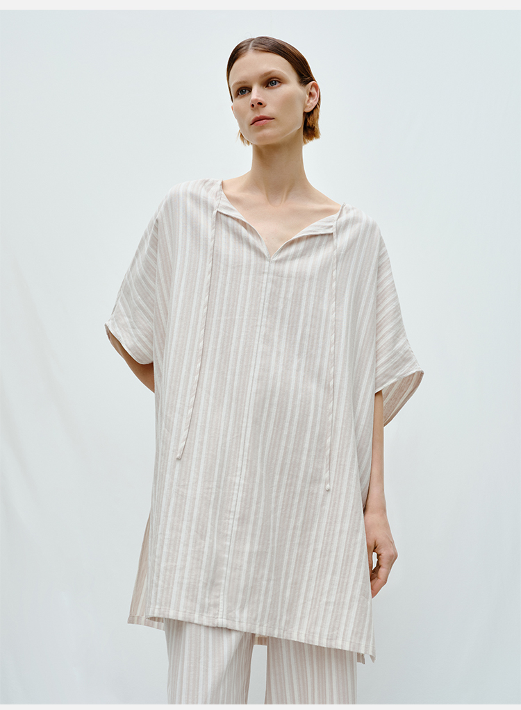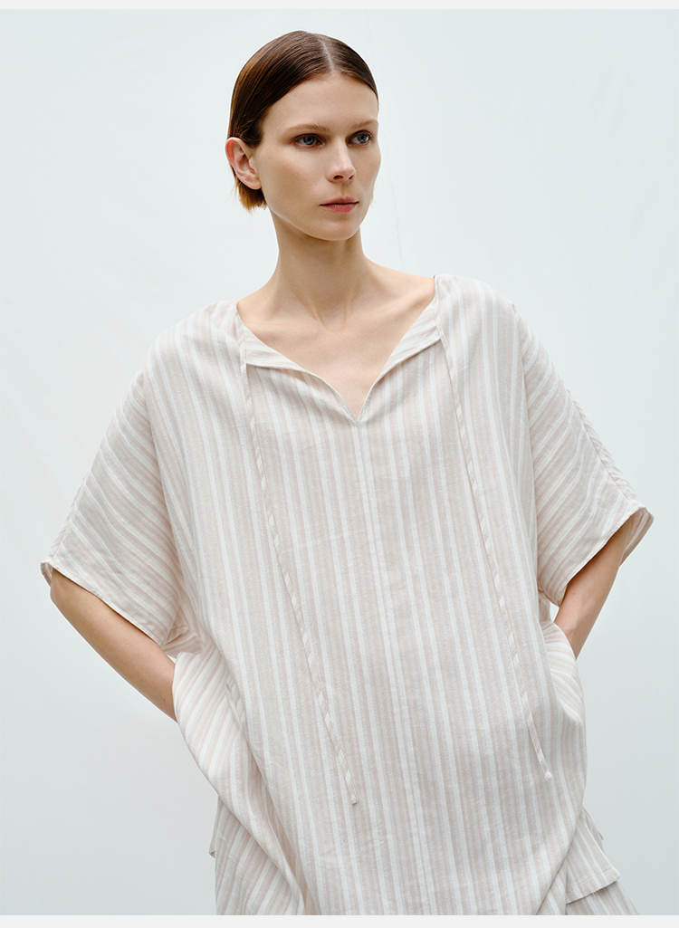 HIDEMI度假系列条纹亚麻开口领廓形套装 上衣/阔腿裤