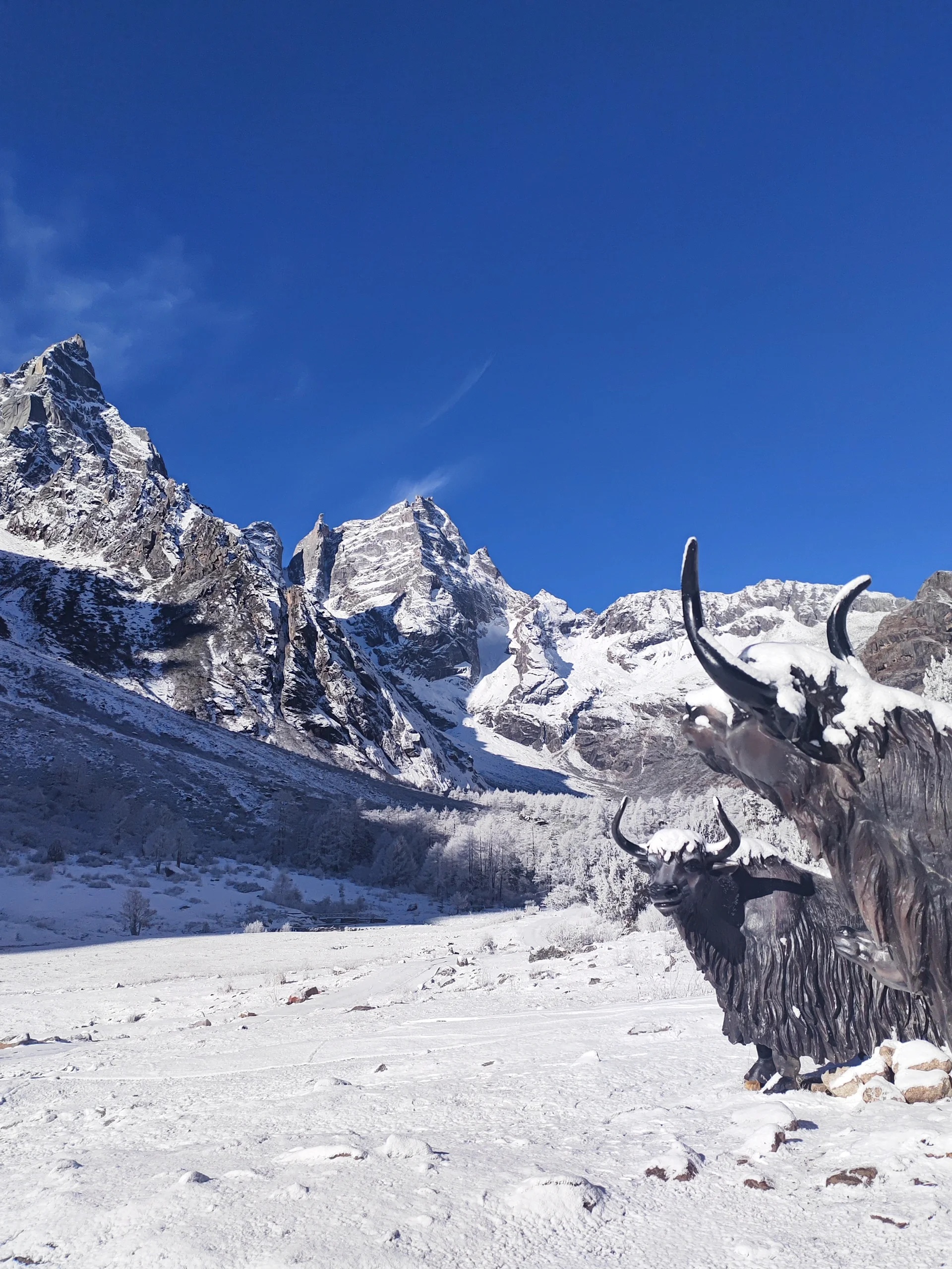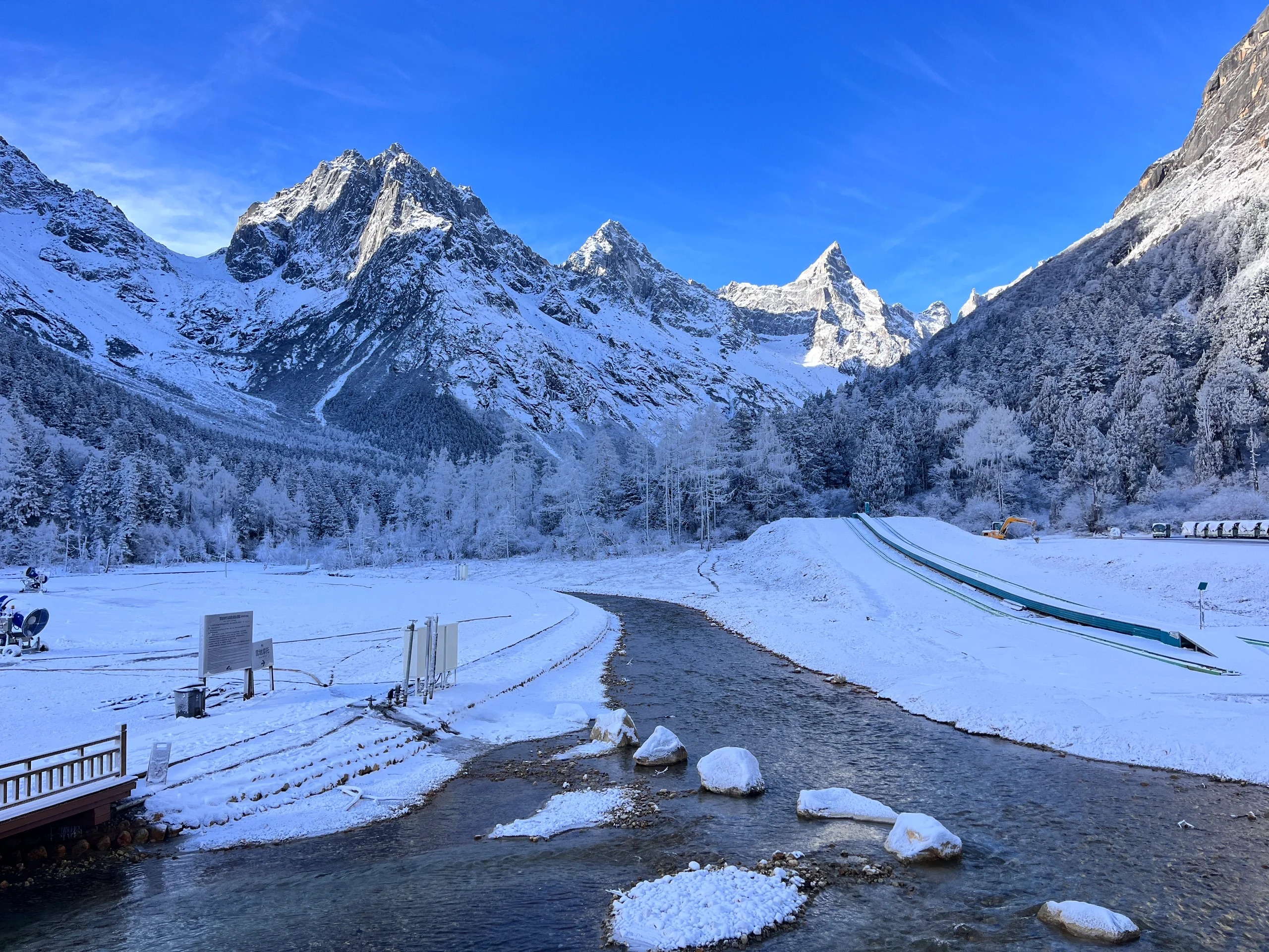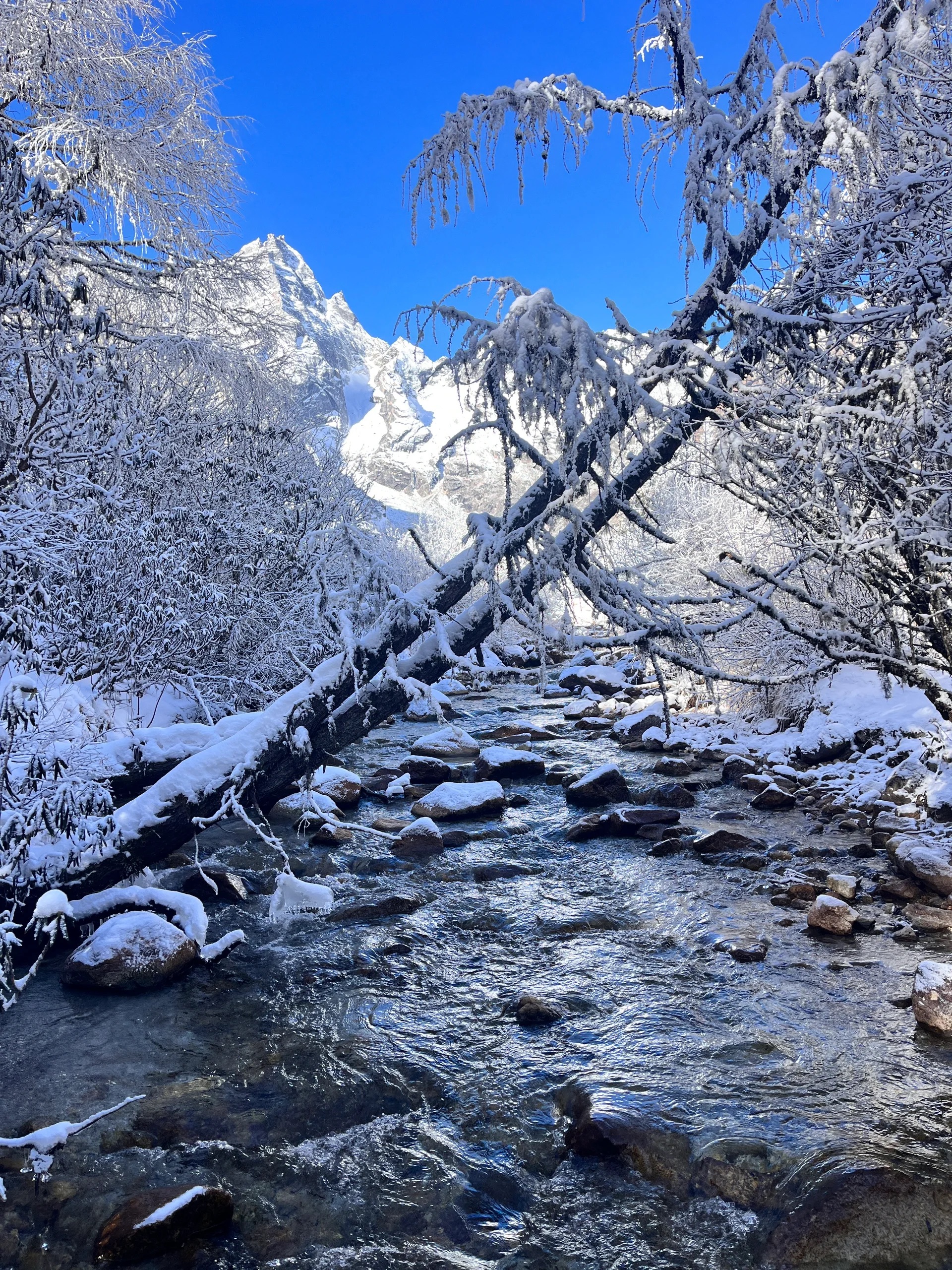 这里拥有金字塔般的雪山群,终年积雪的山峰在阳光下熠熠生辉;先到达龙王海,湖面上结了层薄冰,冰下的水还泛着翡翠色,岸边的树把影子印在冰上,像幅没干的水墨画。