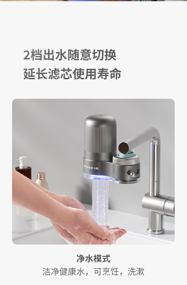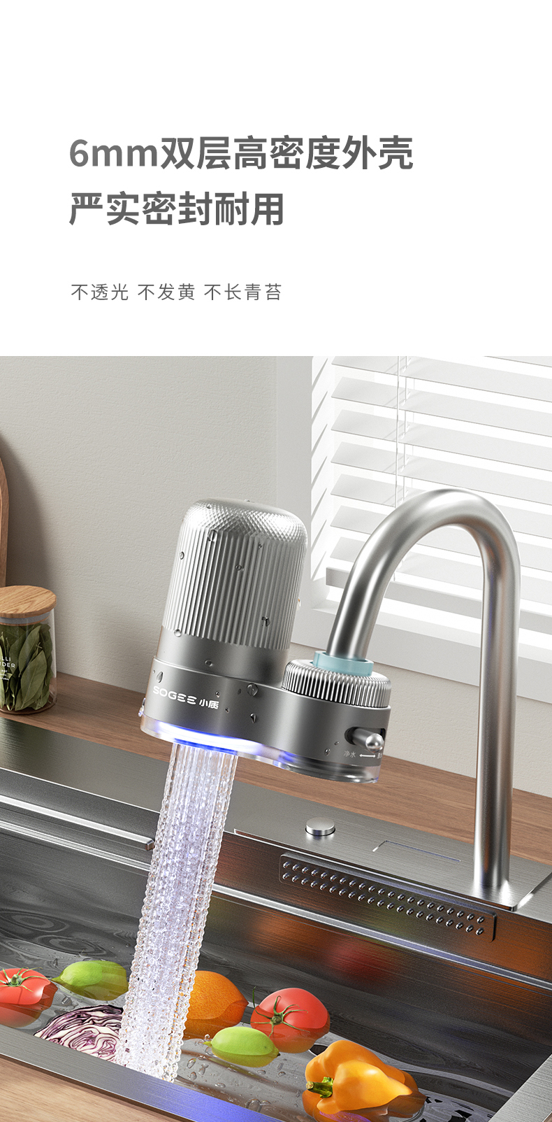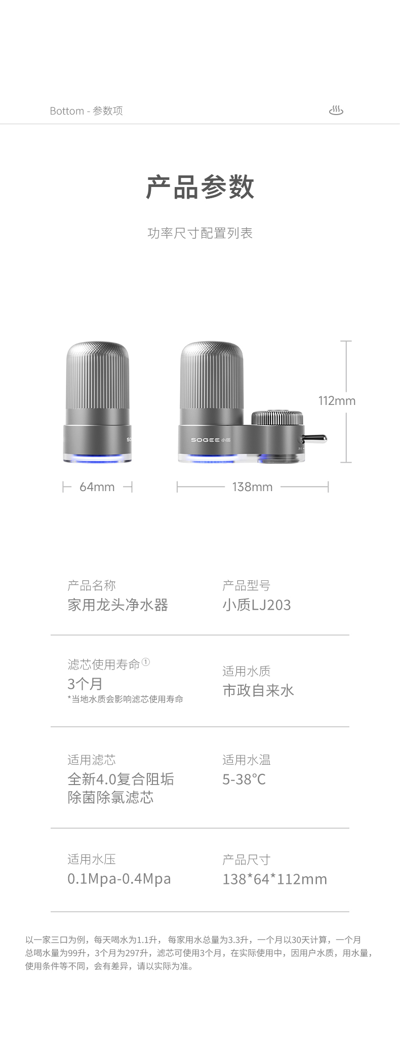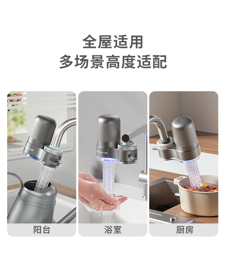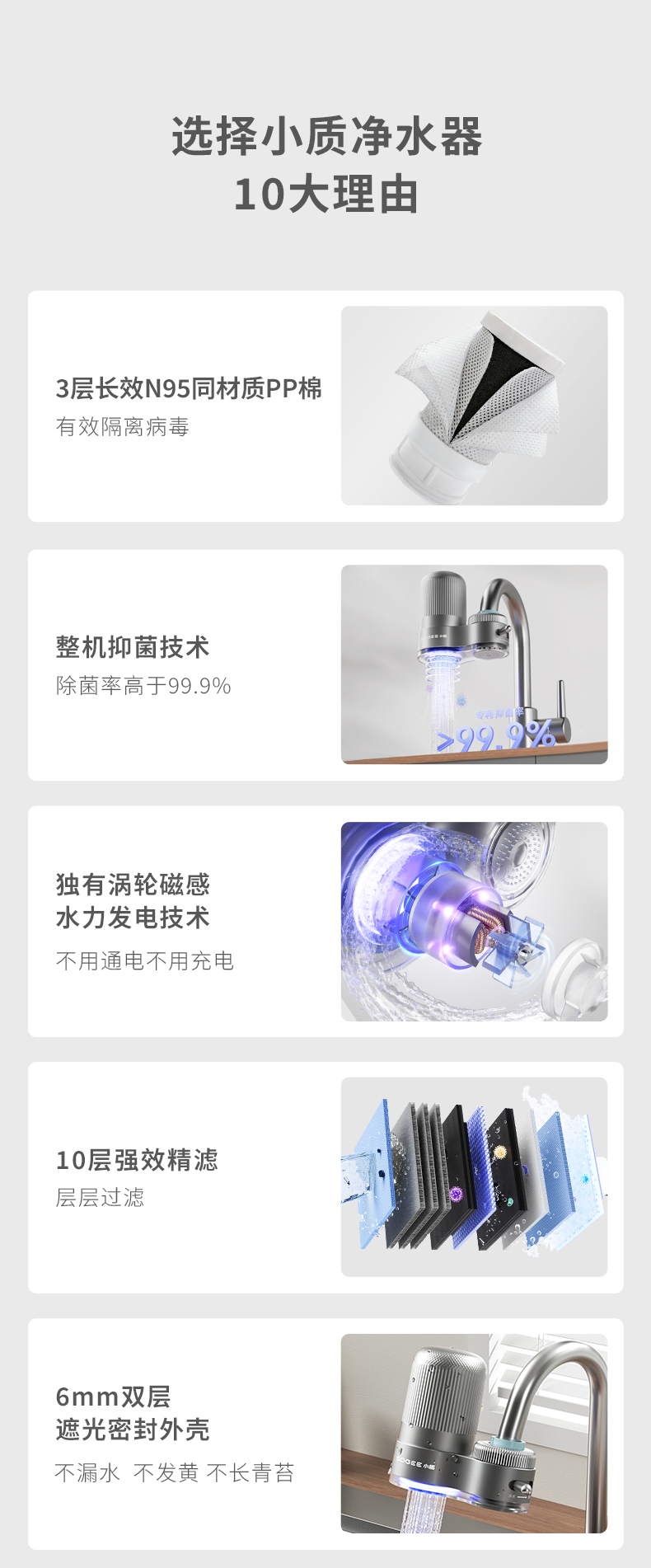 【水力发电】 小质龙头净水器LJ203 涡轮磁感水力发电 3层长效PP棉 10层过滤 有效除重金属/除阻垢/除氯 适配99%水龙头