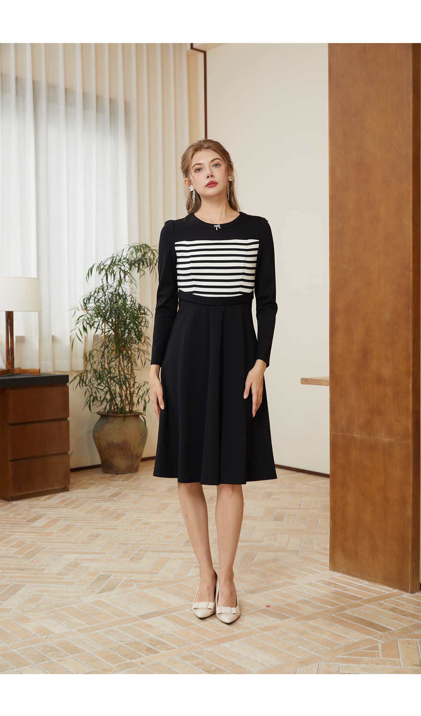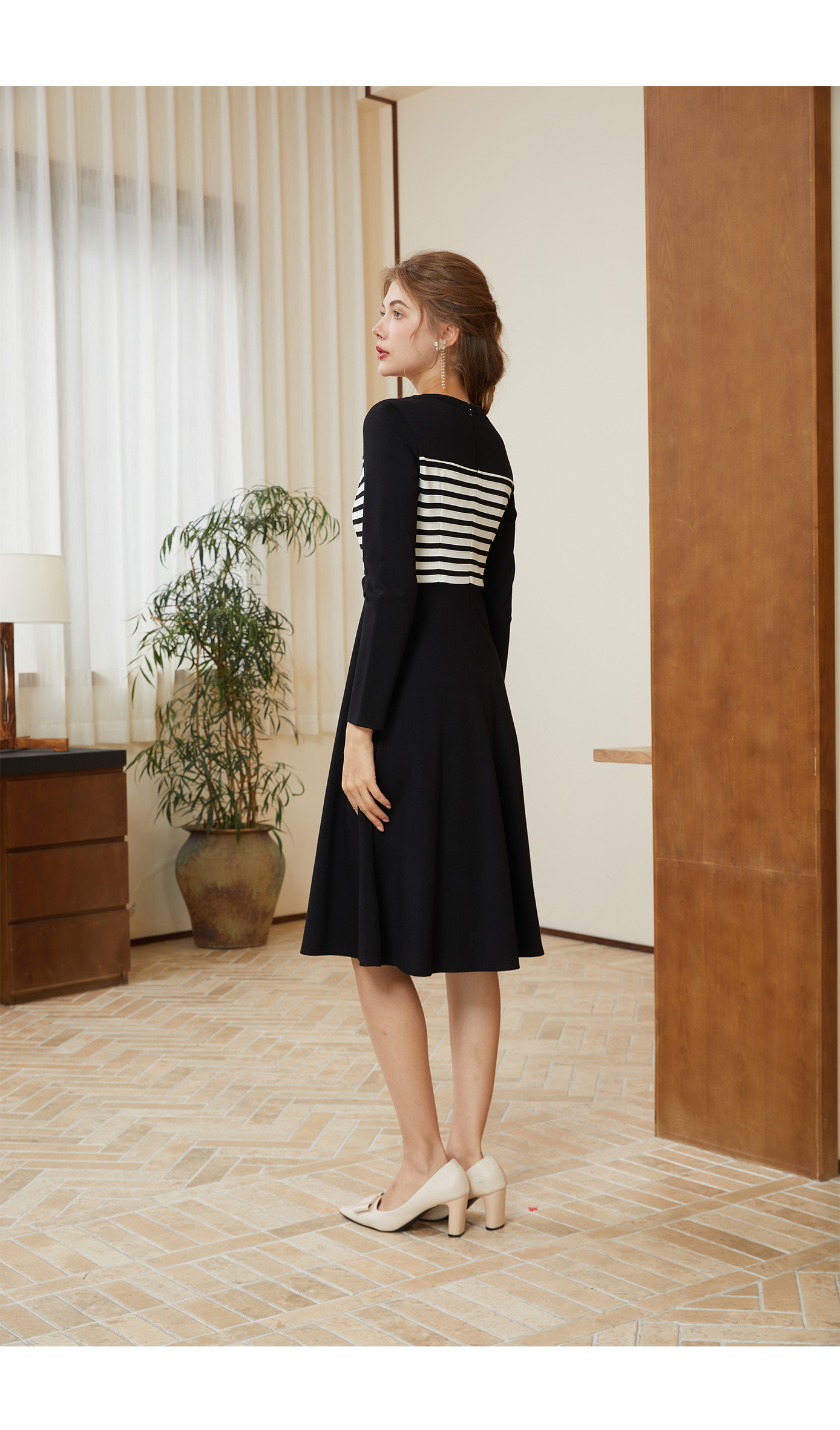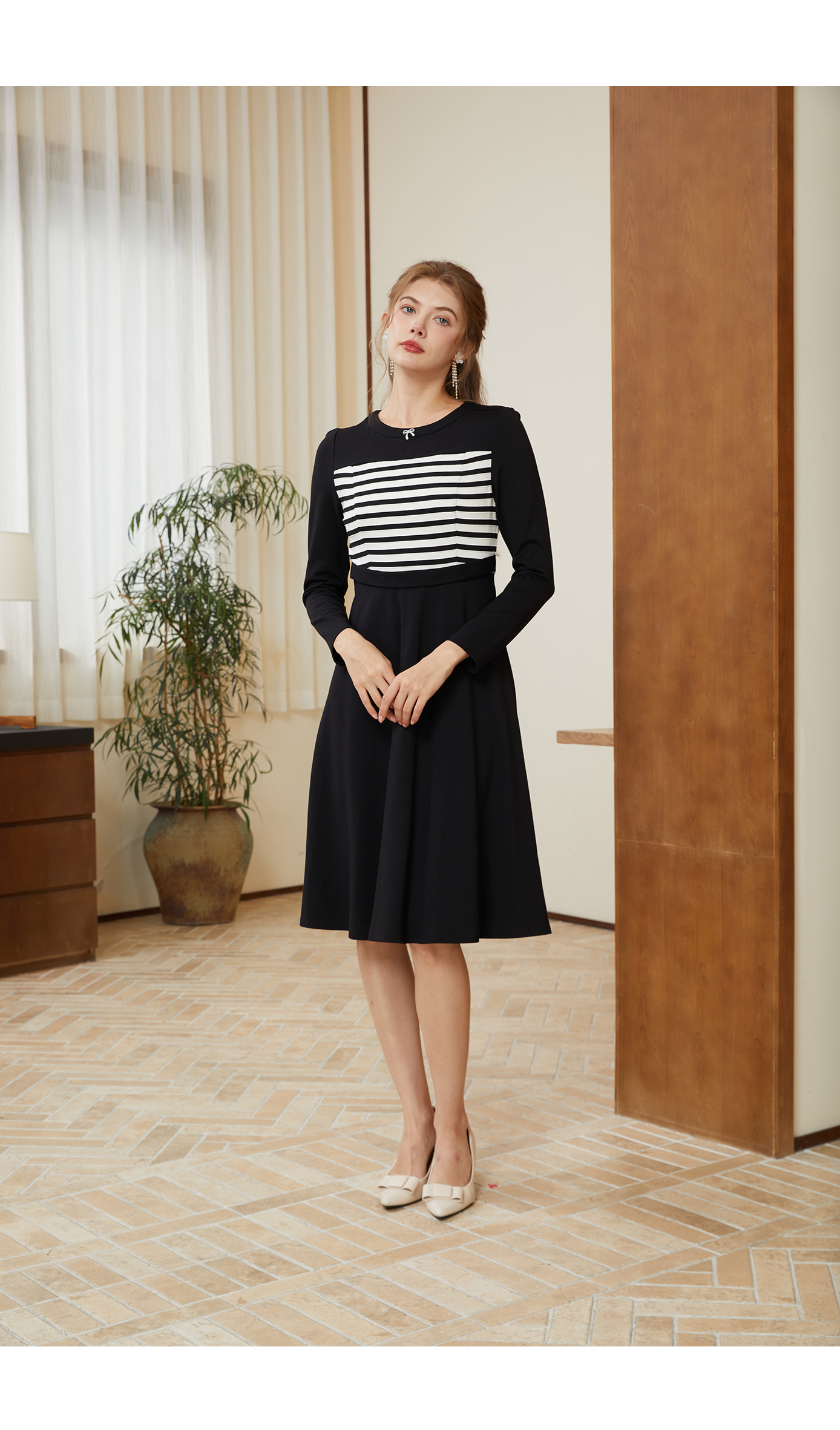司歌弹力拼条纹收腰长袖连衣裙秋冬A921039X