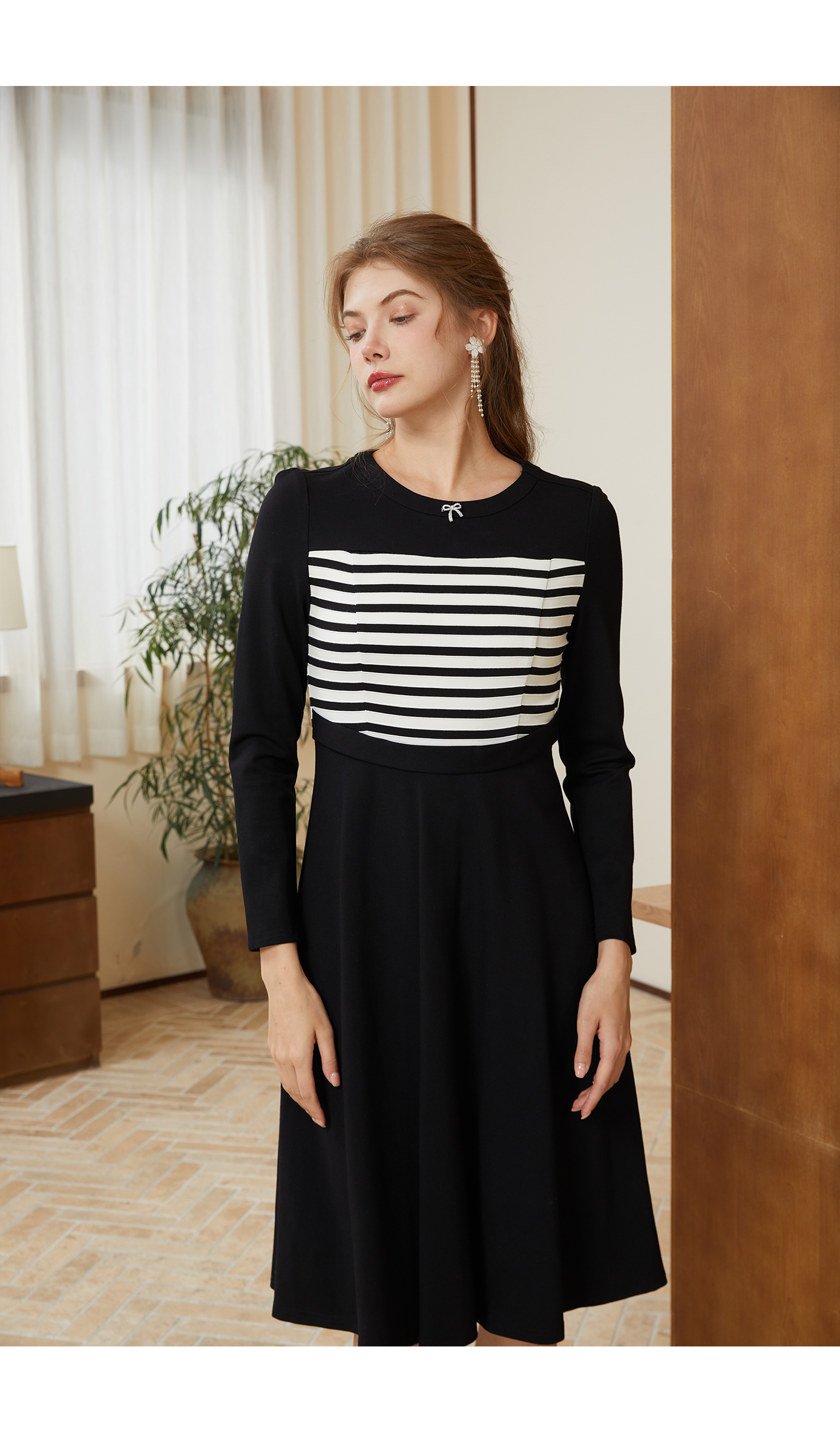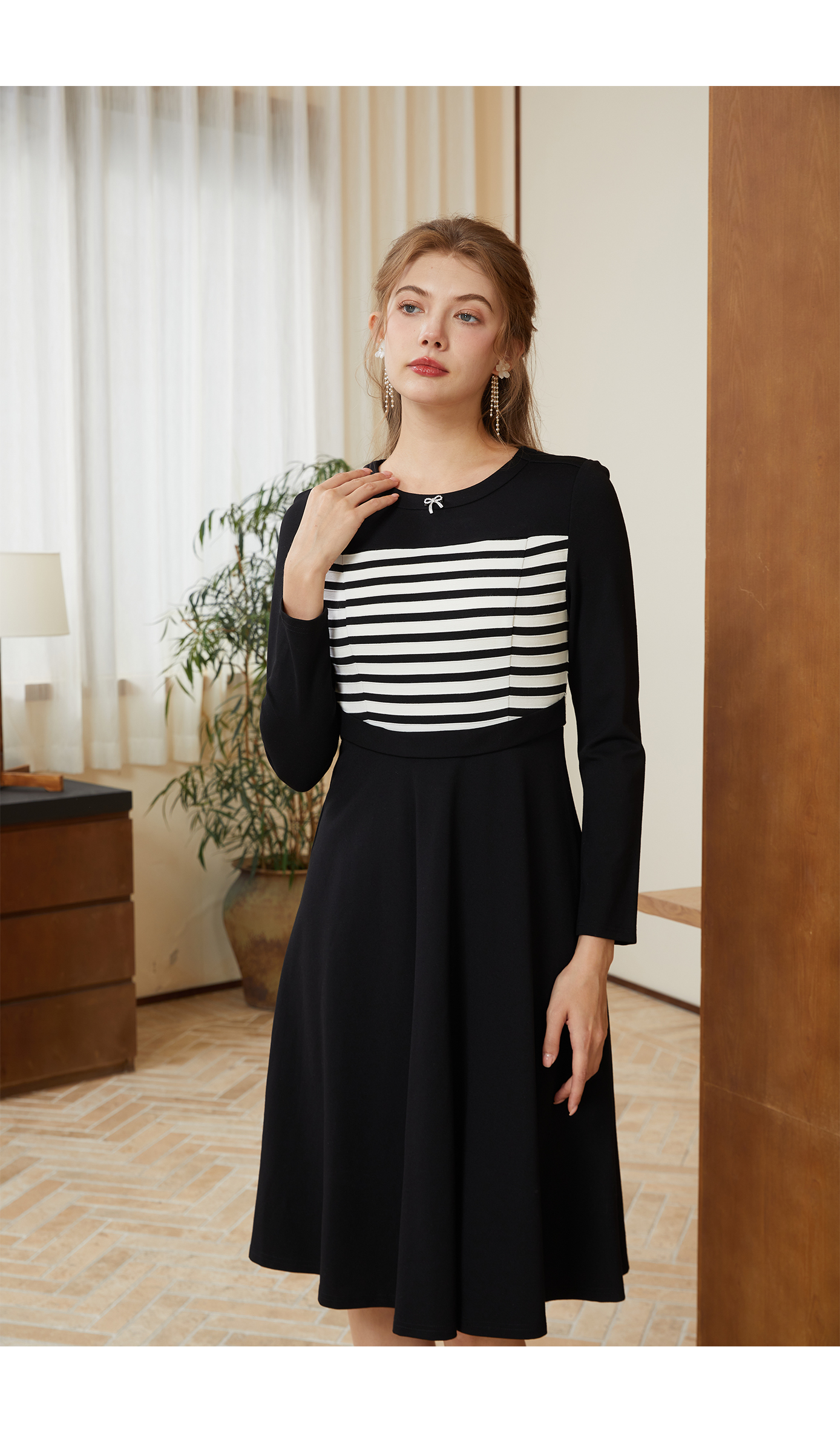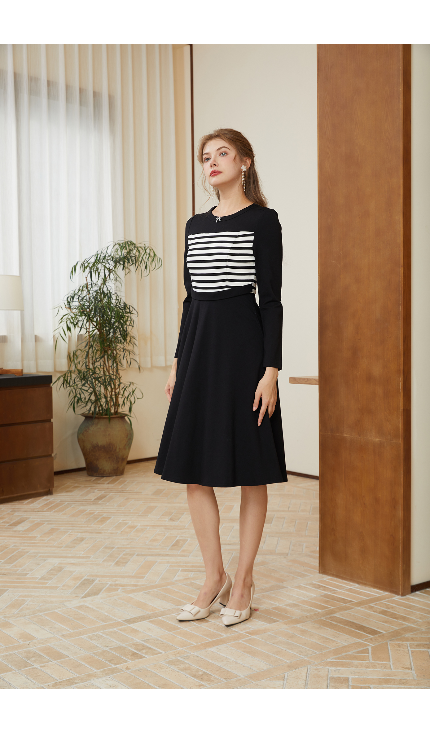 司歌弹力拼条纹收腰长袖连衣裙秋冬A921039X