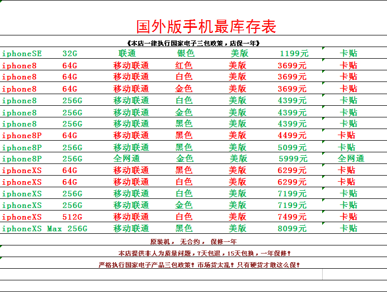 苹果手机本店有国行全新,也有国外优惠货源,国行是由苹果售后联保,国外版由我们店保修1年。国外版为本实体店多年优势,价格低并有质保,是性价比的首选。本店是实体店,保证大家没有翻新机。本店手机都保1年,所以也不做二手机。