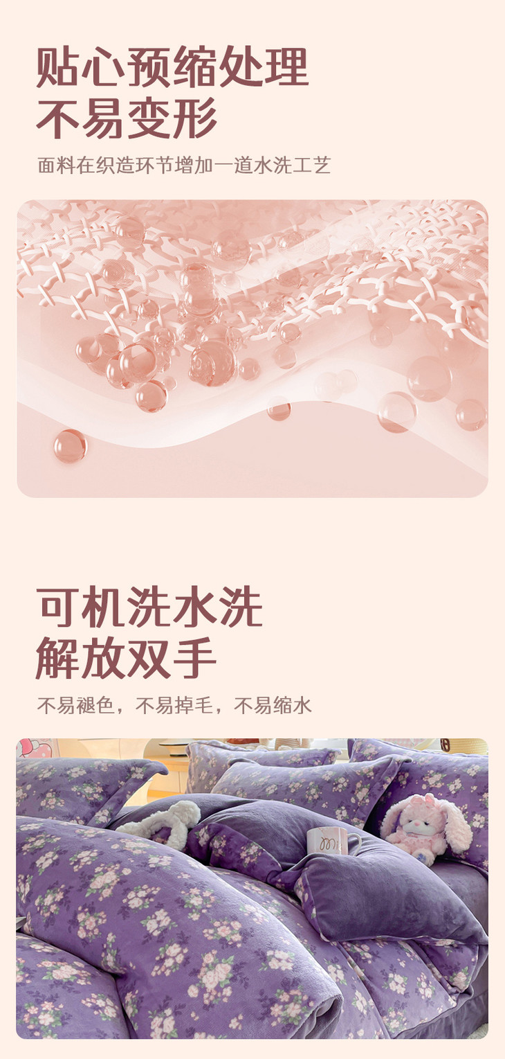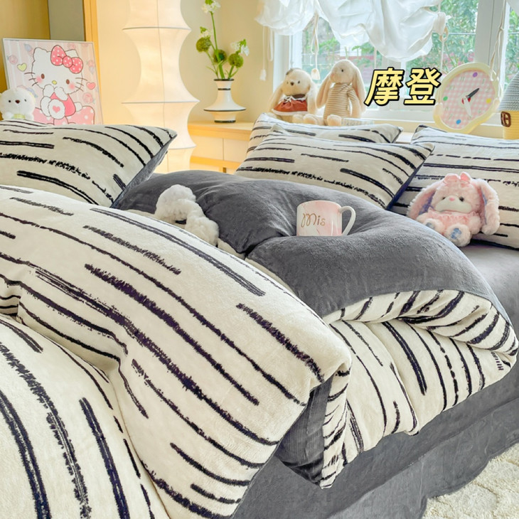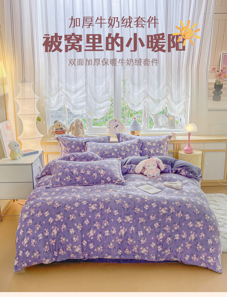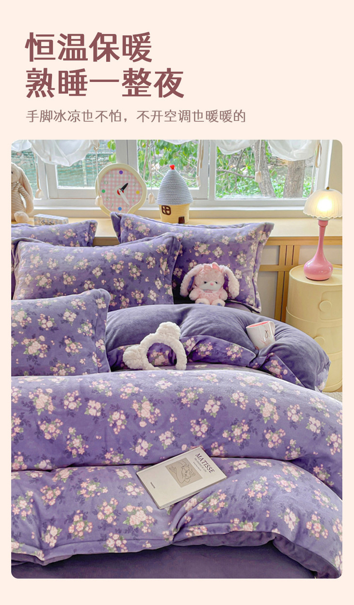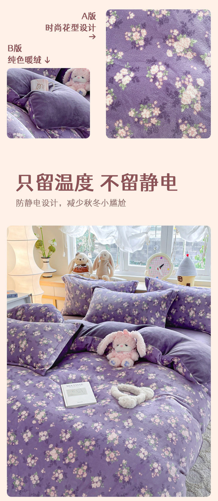 牛奶绒被套毯四件套——心动之选 不负睡眠|时光双面牛奶绒四件套印花四件套,暖进你的心里! 懂你的温暖,慵懒的享受着舒服睡眠体验园 这款甄选高克重牛奶绒面料制作 柔软舒适,绒毛细腻厚实耐用保暖强! AB版设计,A版时尚图案B版纯色平铺不管正反,都是想给你的温柔柔软顺滑,感受冬日温暖"面料中植入了抗静电导丝能够有效防止静电! 从此告别静电,无忧睡眠,可机洗可水洗,环保活性印染,安全舒适不易掉色染色!