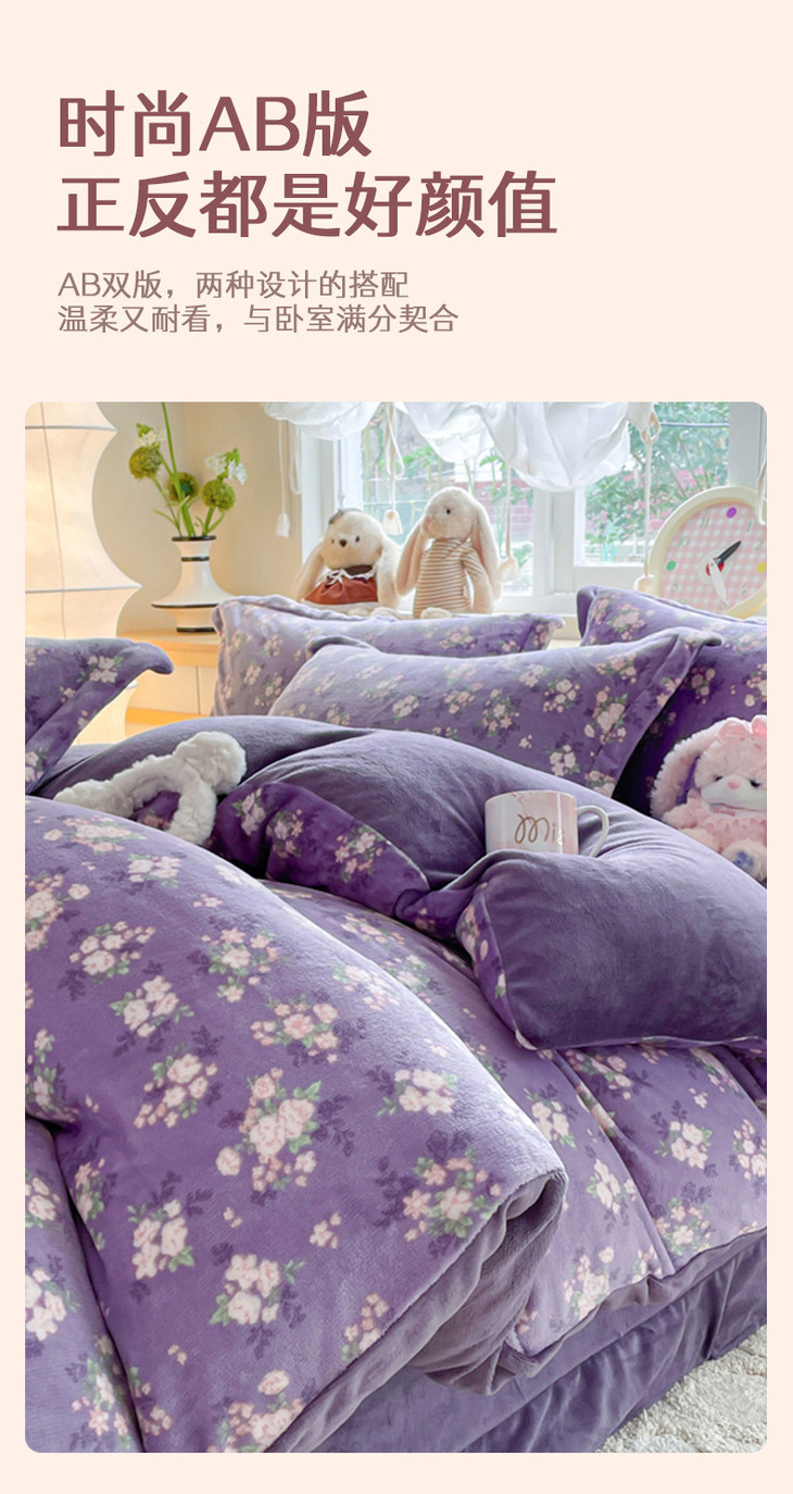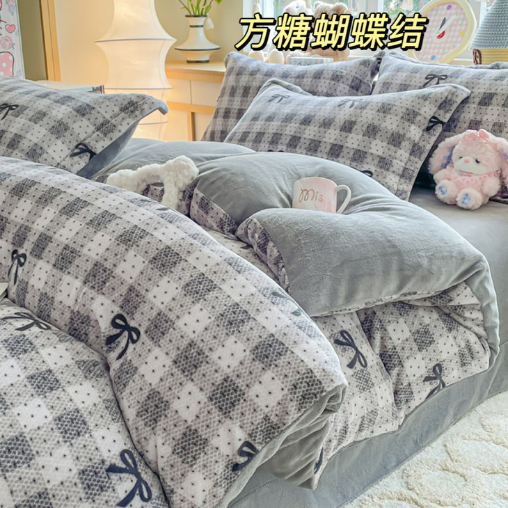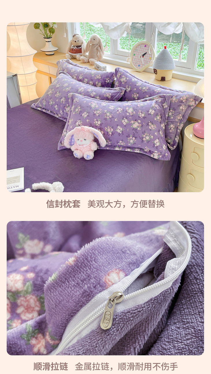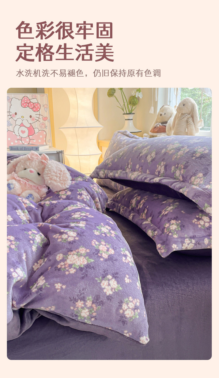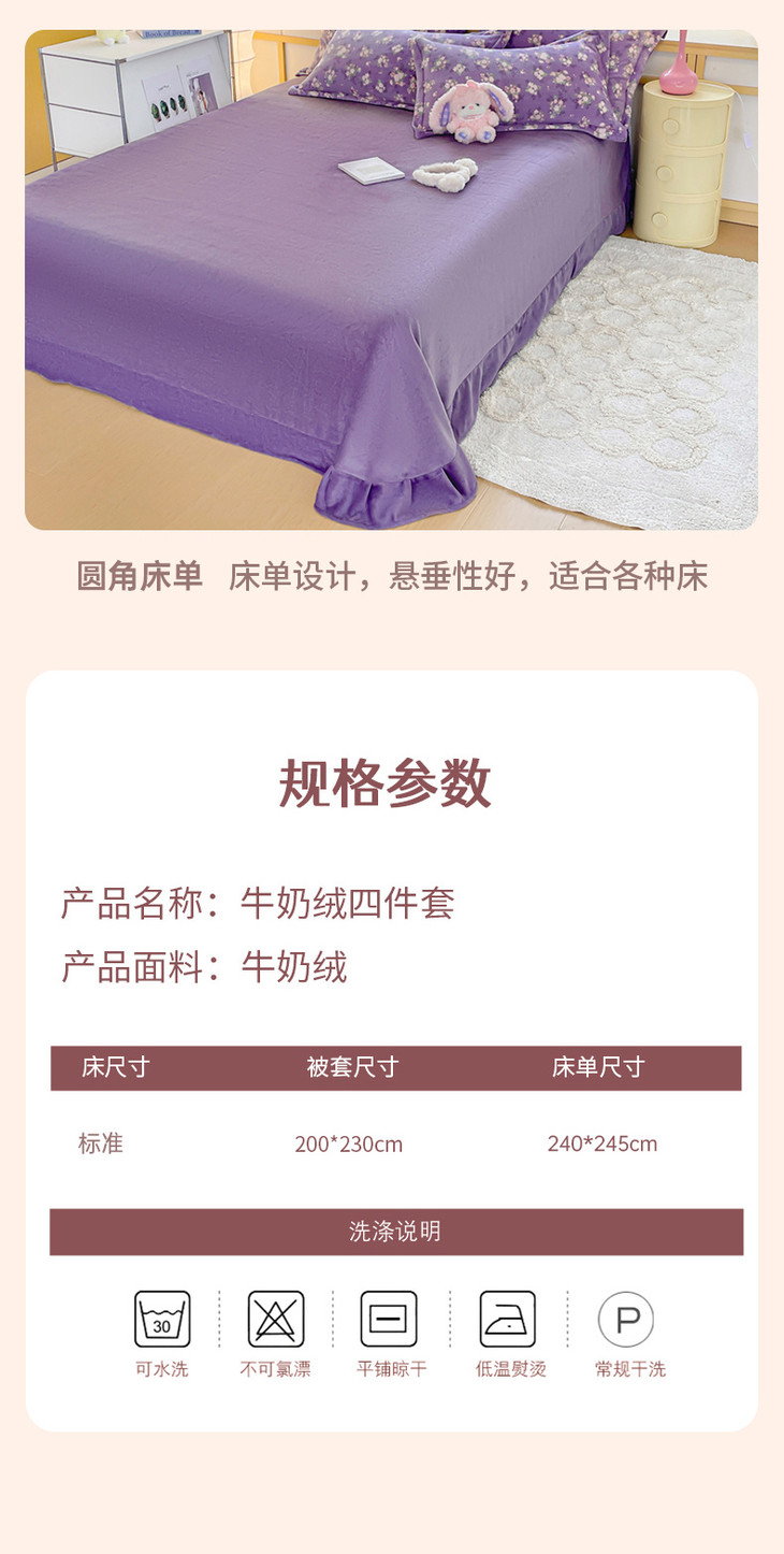 牛奶绒被套毯四件套——心动之选 不负睡眠|时光双面牛奶绒四件套印花四件套,暖进你的心里! 懂你的温暖,慵懒的享受着舒服睡眠体验园 这款甄选高克重牛奶绒面料制作 柔软舒适,绒毛细腻厚实耐用保暖强! AB版设计,A版时尚图案B版纯色平铺不管正反,都是想给你的温柔柔软顺滑,感受冬日温暖"面料中植入了抗静电导丝能够有效防止静电! 从此告别静电,无忧睡眠,可机洗可水洗,环保活性印染,安全舒适不易掉色染色!