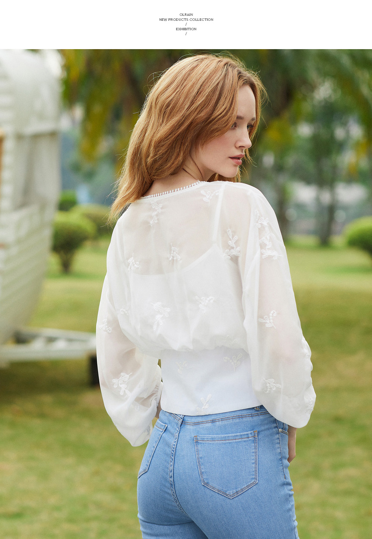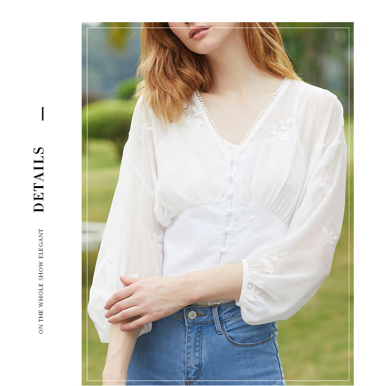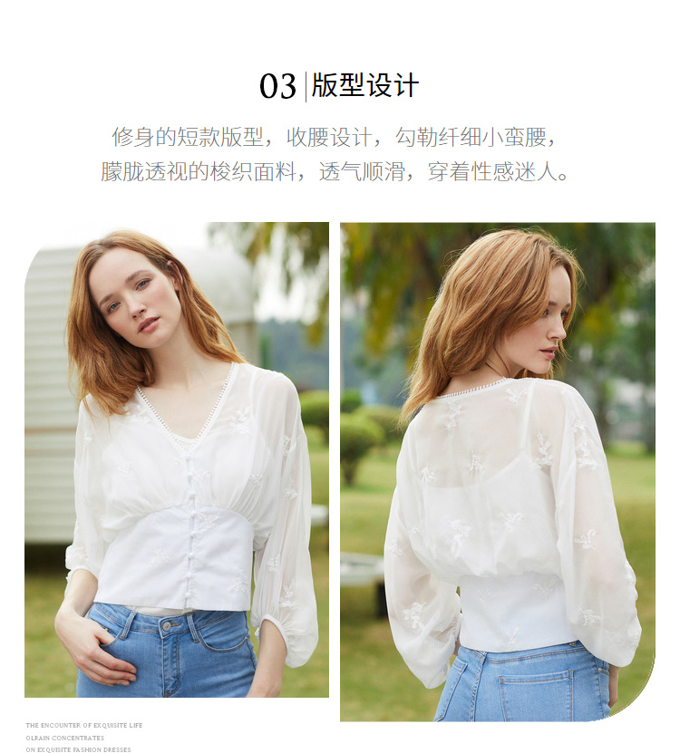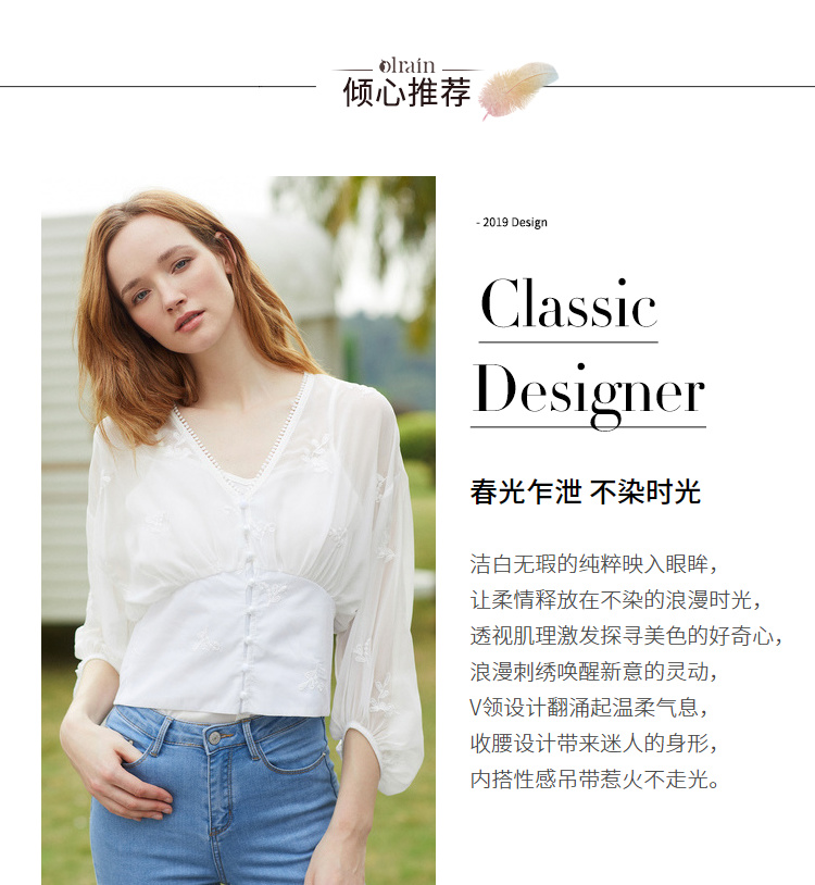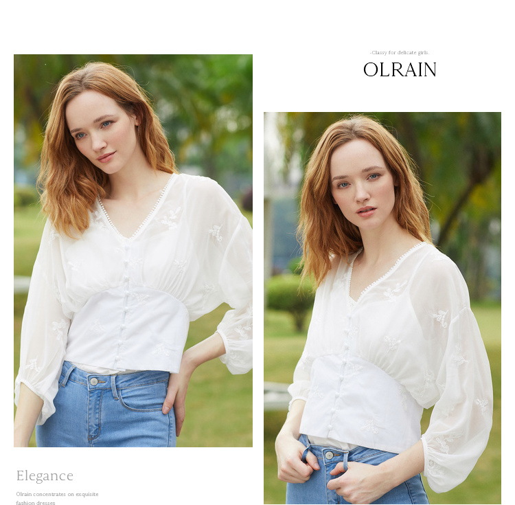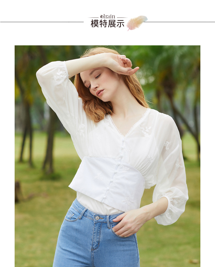欧芮儿2019夏装新款白色V领蕾丝衫超仙女上衣甜美洋气质网纱小衫