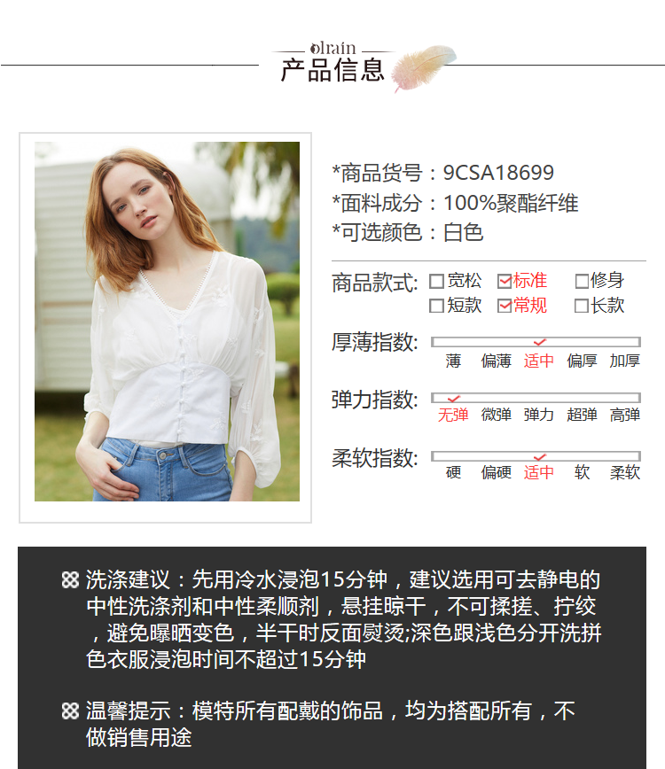 - “精致”是欧芮儿olrain品牌文化的核心,欧芮儿认为,精致的女人,不但要外在动人,更要内在迷人,内外兼修,有魅力、有气质、有内涵,自信而不自傲,优雅而不矫揉,自有万种风情而不轻浮,更不故作矜持。