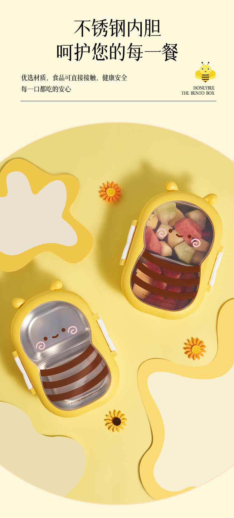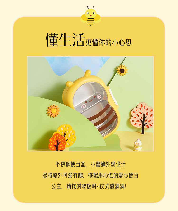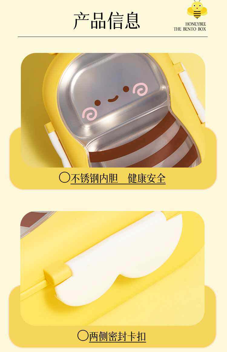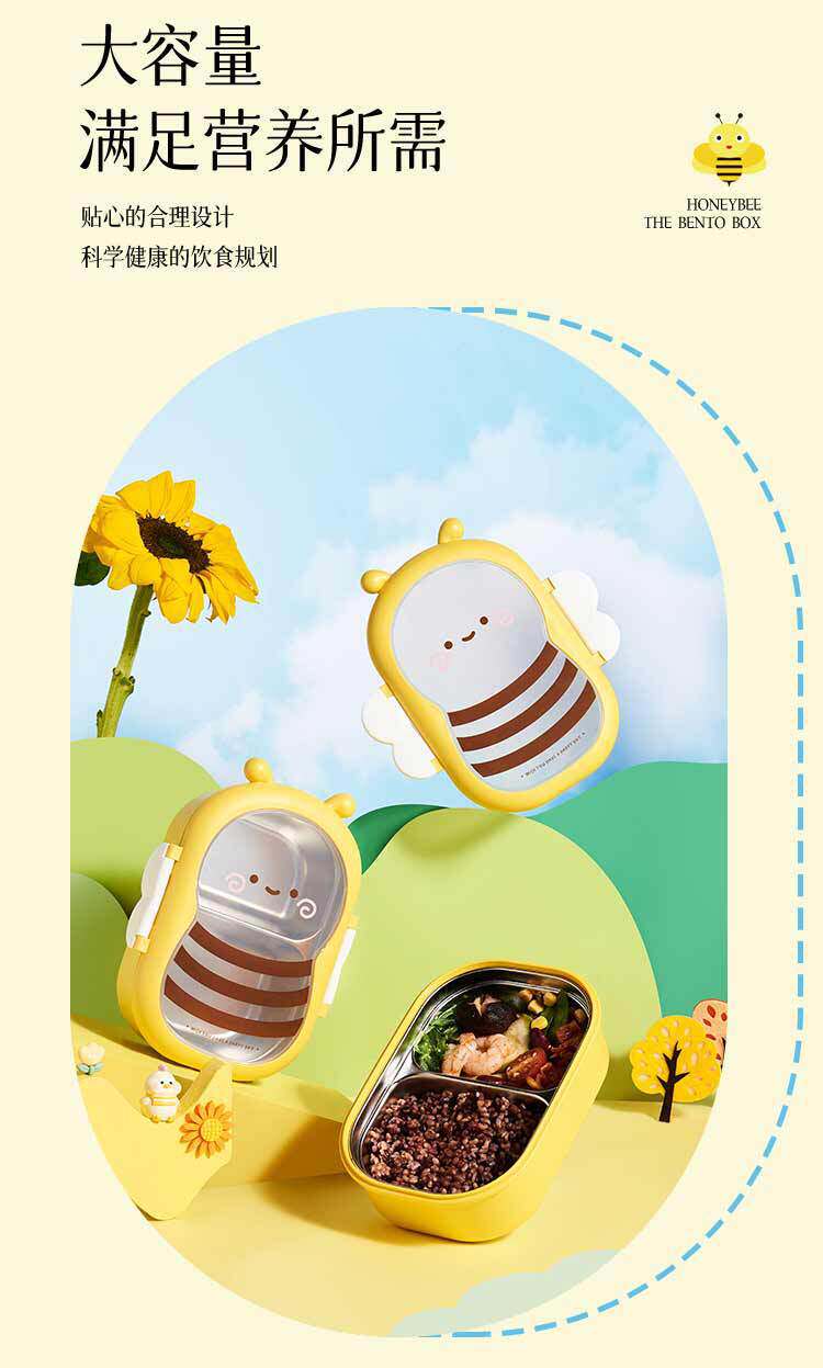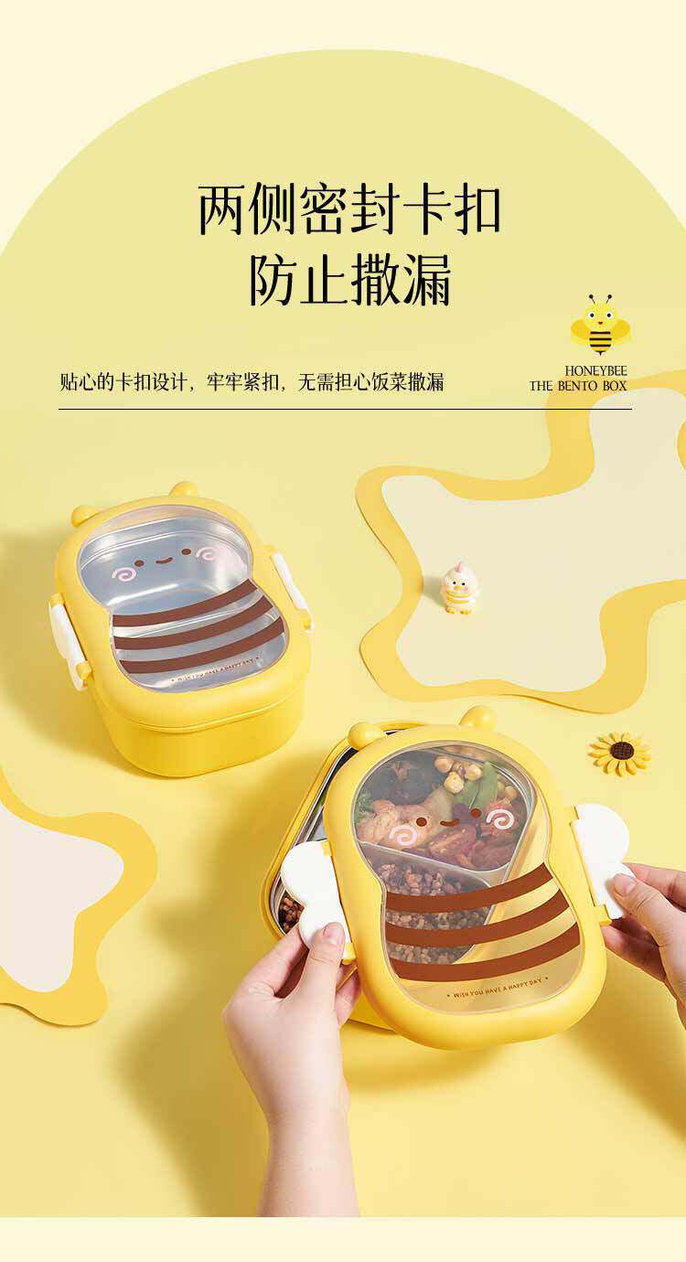 【304不锈钢双格蜜蜂饭盒】小蜜蜂上班族饭盒 卡通不锈钢便当餐盒 学生食堂专用上学盒保温分格
