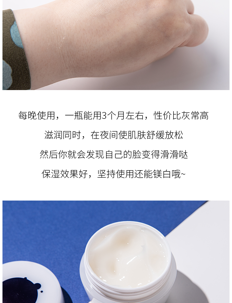这款睡眠面膜是半透明的啫喱质地,水水的那种,很容易推开,很细腻,没有颗粒,味道还挺舒服的第二天醒来不会油光满面,清洁完面部肌肤可以看到毛孔比以前细腻了哦,肌肤的润泽度也提升了不少~~