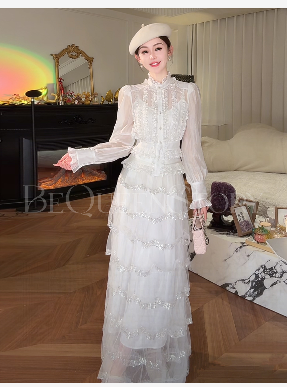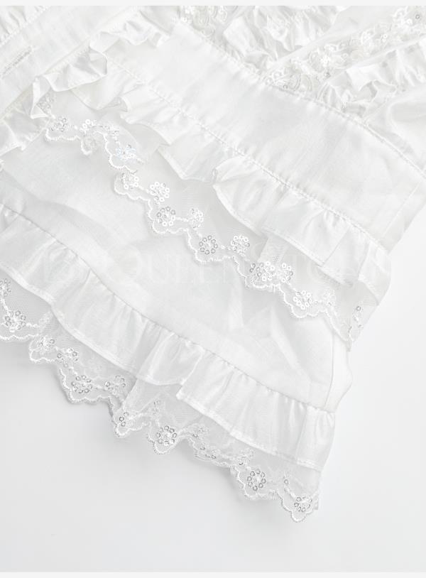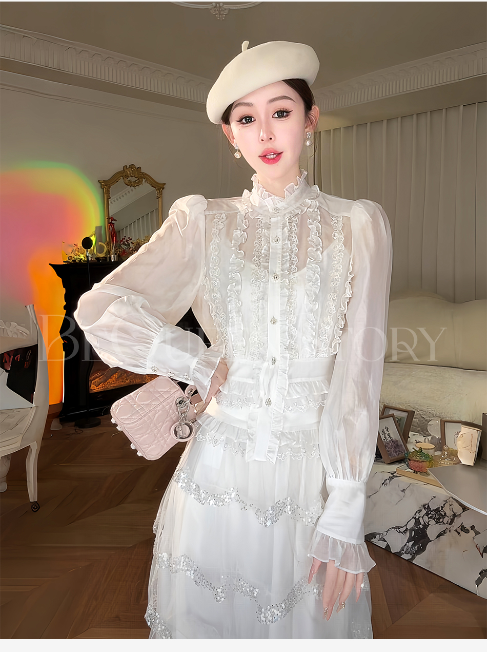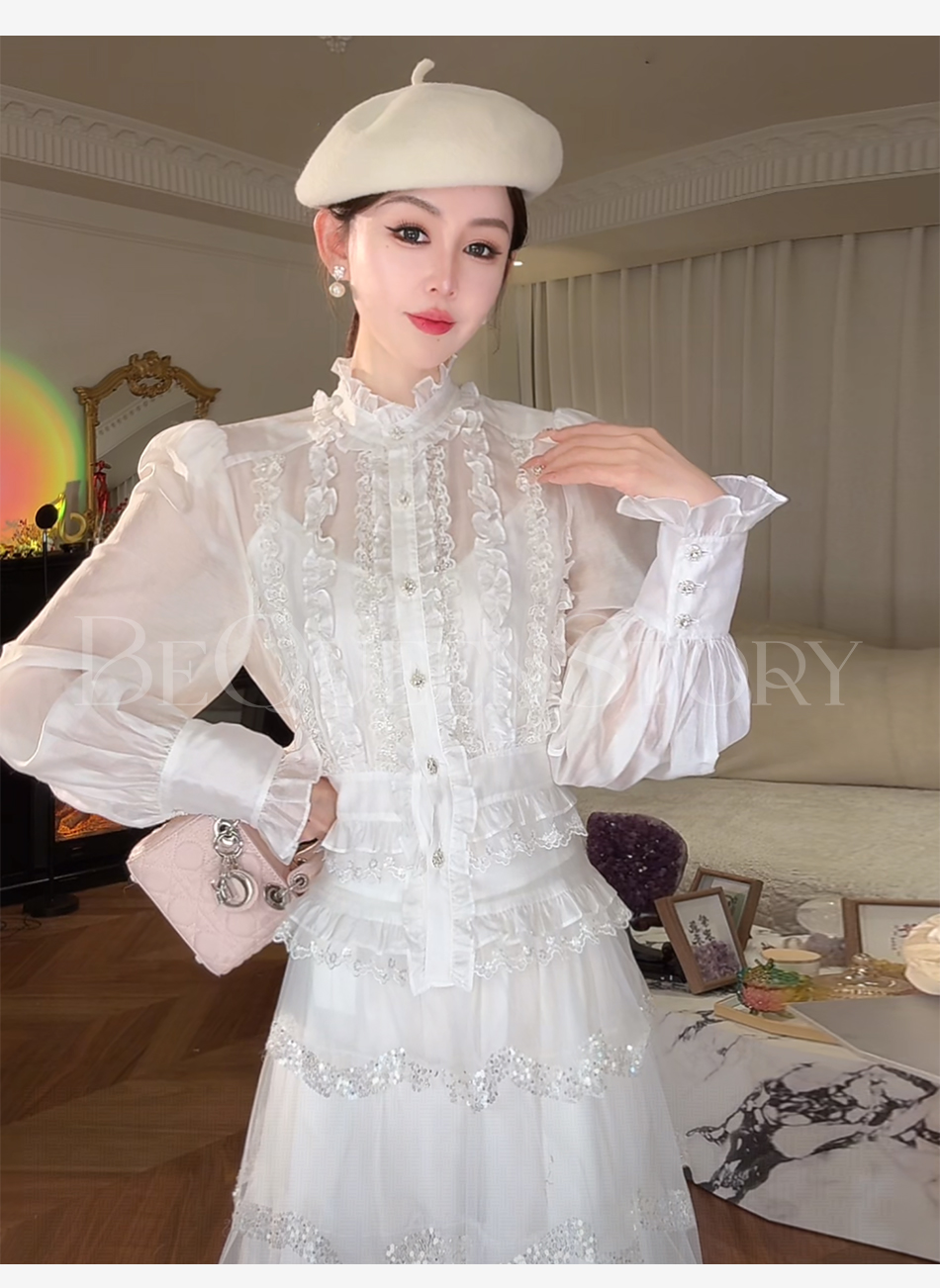 余潇潇【月光私语】法式宫廷风针织透气弹力收腰层次木耳边衬衫