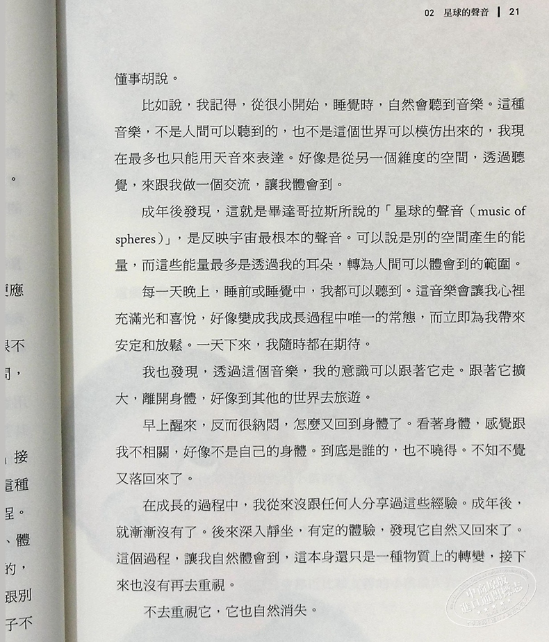 「我會談這些實例,是因為捨不得看到那麼多小孩、年輕人甚至成年人,一天下來隨時都有數不完的奇蹟──人生點點滴滴,其實都是奇蹟──卻因為人類集體的文化和觀念的洗腦,而讓我們否決它們。」