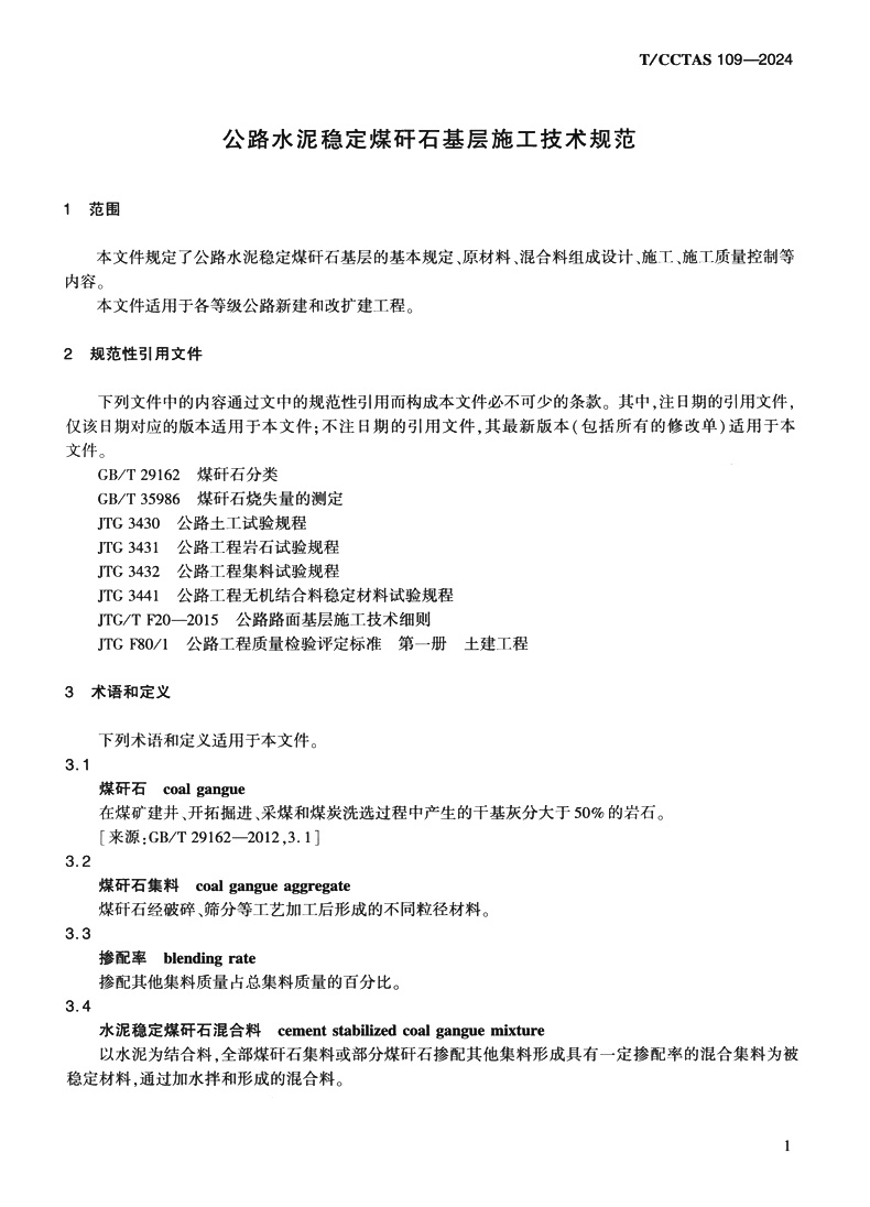 书名:公路水泥稳定煤矸石基层施工技术规范T/CCTAS 109—2024
