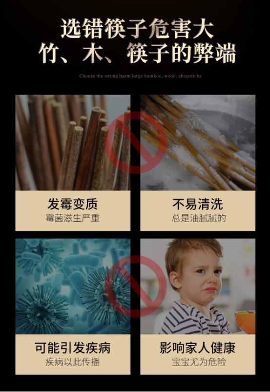 你还在用发霉的竹筷木筷吗? 赶紧扔掉吧! 竹木筷子清洗不彻底时会有 大肠杆菌、金黄色葡萄球菌、幽门螺杆 菌等致病菌 可借由筷子传播 造成感染患病使用被细菌侵蚀的筷子 轻者可能导致感染性腹泻、呕吐等消化系统疾病 重则因为感染幽门螺杆菌而导致胃 严重发霉的筷子还会产生致肝癌的物质“黄曲霉素" 黄曲霉毒素对人和动物的肝脏组织有破坏作用