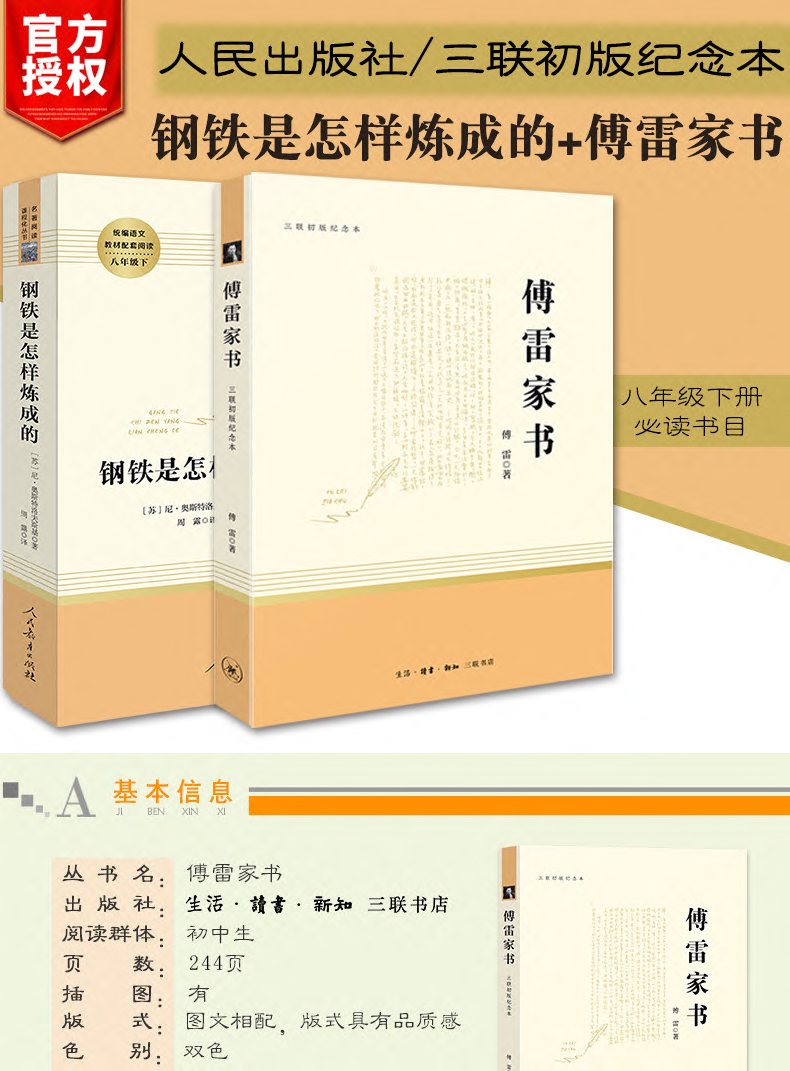 傅雷家书和钢铁是怎样炼成的八年级下册无删减完整版正版人民教育出版社统编语文教材配套中学生课外阅读书籍8下傅雷家书三联正版