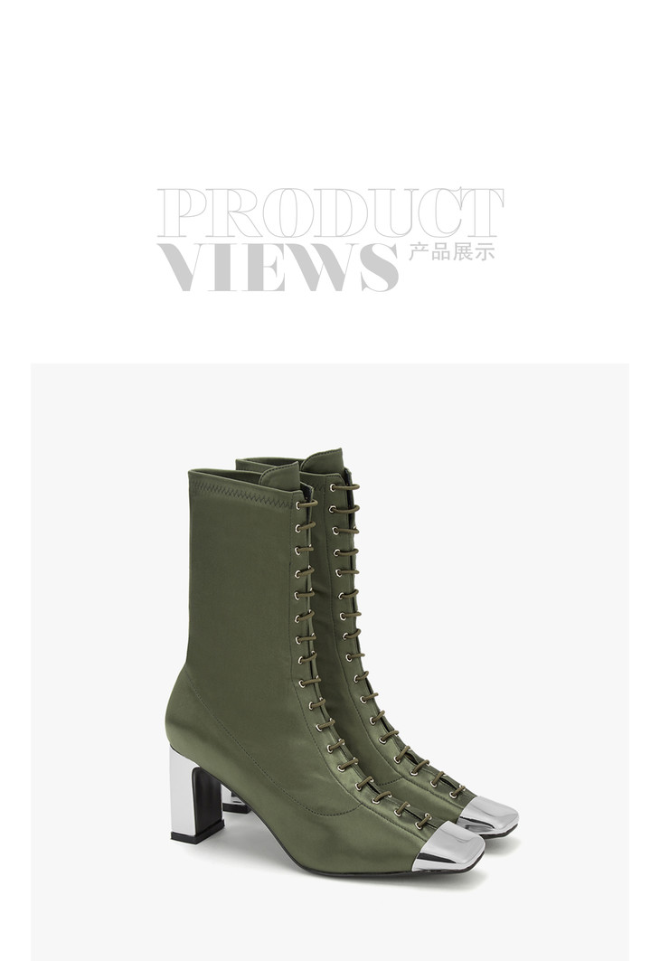 新年闪购lost in echo2020秋季弹力布绑带时尚短靴女靴 军绿色金属方头高跟女鞋