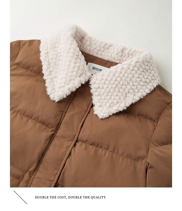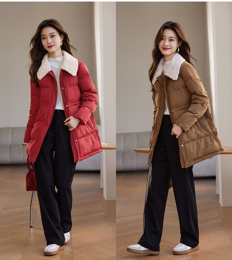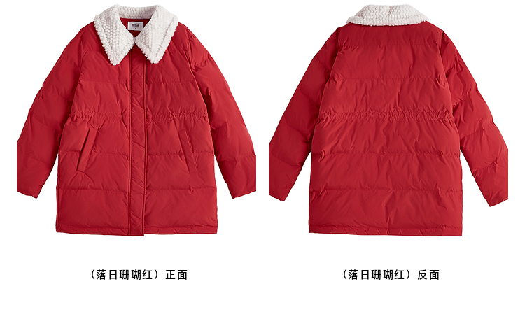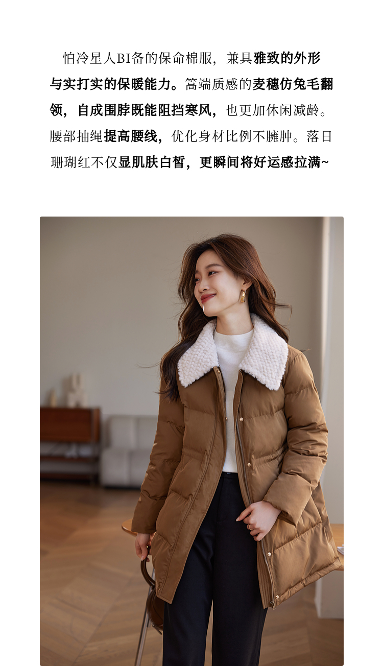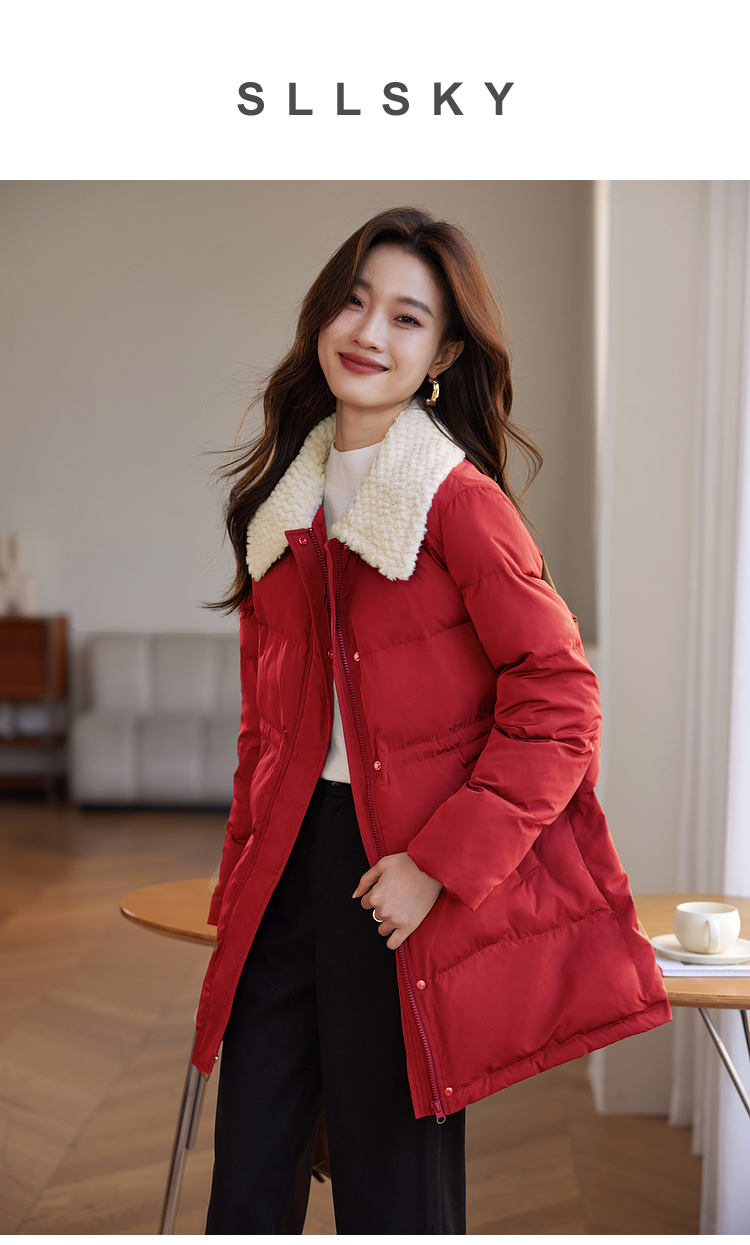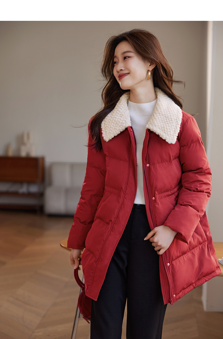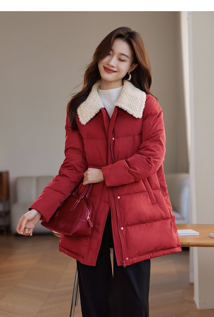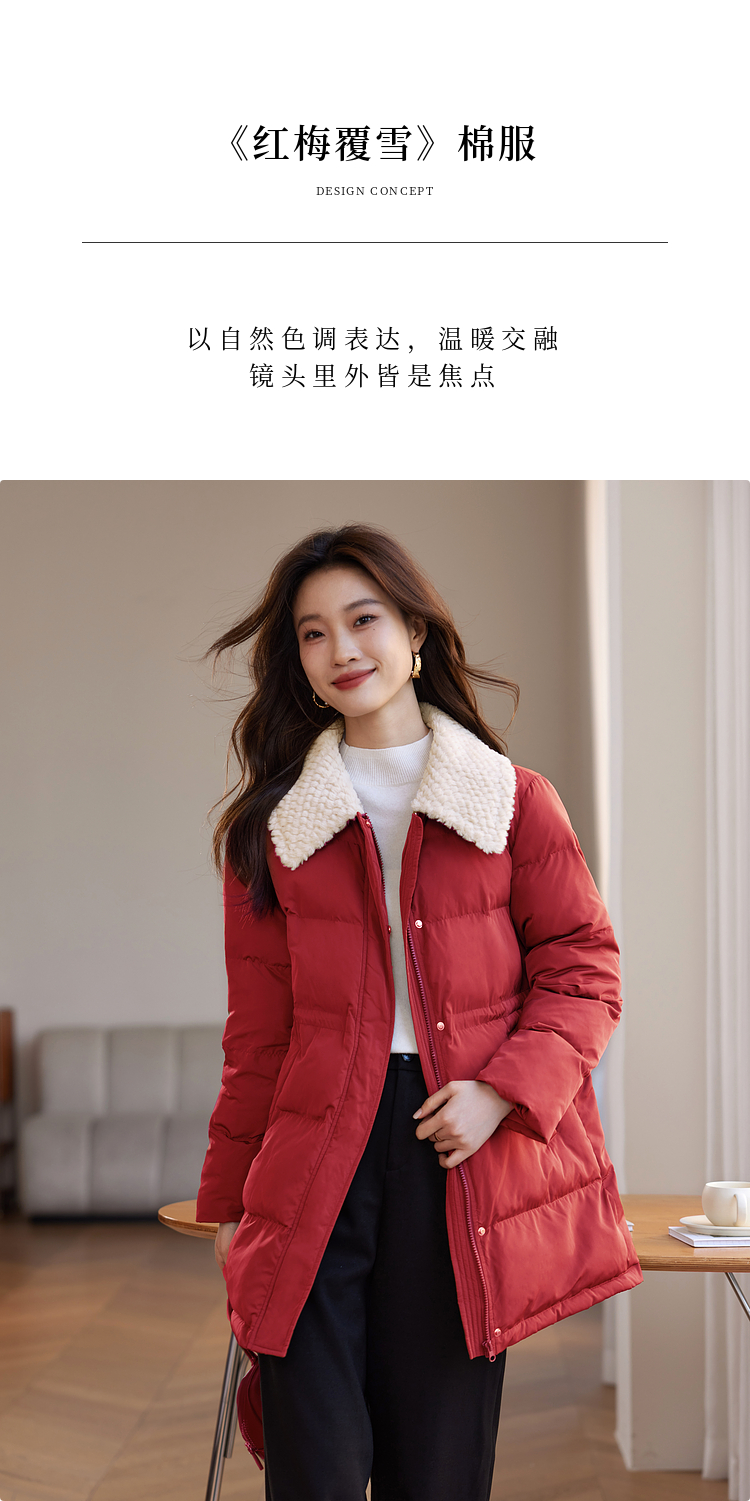 【年终特卖】熙世界红色羽绒棉服女中长款冬2025新款仿兔毛翻领保暖棉衣外套