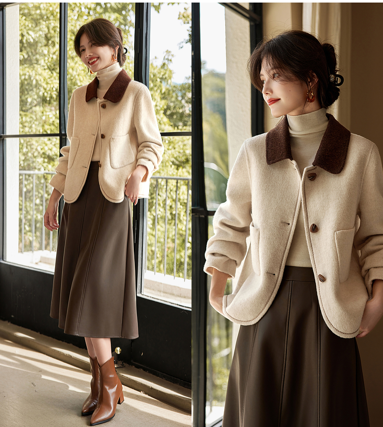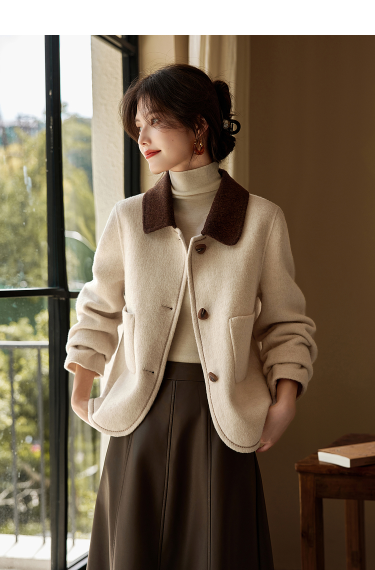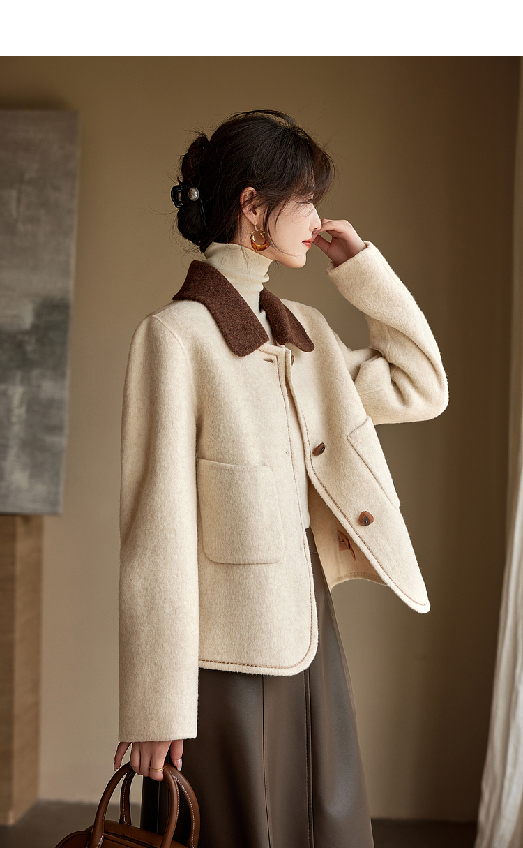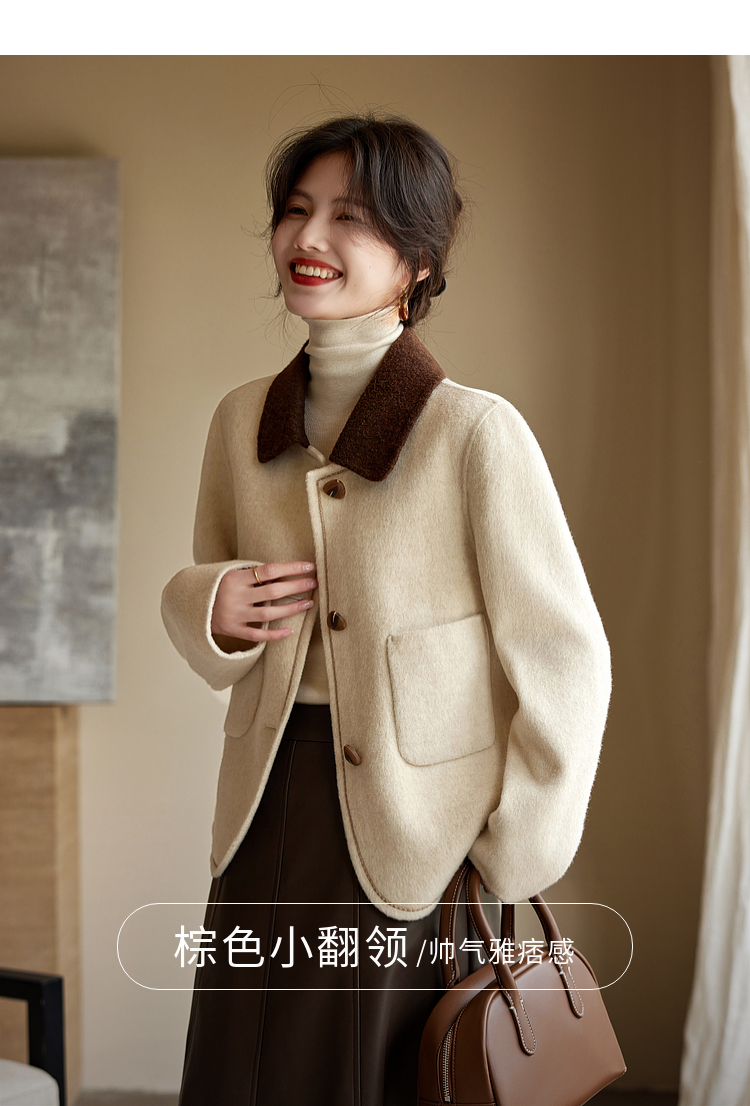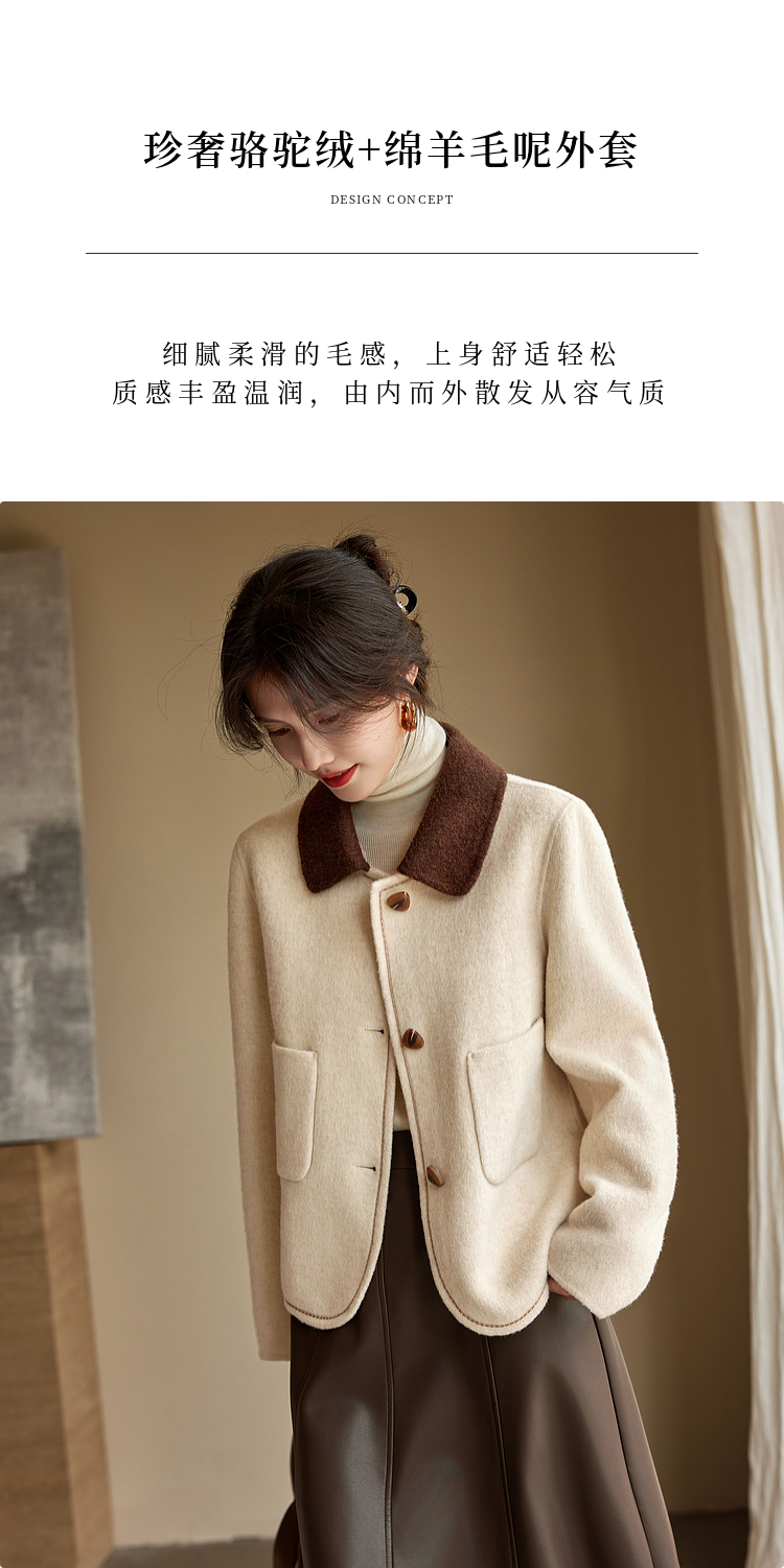 【年终特卖】熙世界骆驼绒绵羊毛大衣女短款冬季新款小香风撞色翻领毛呢外套