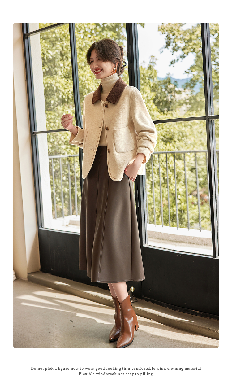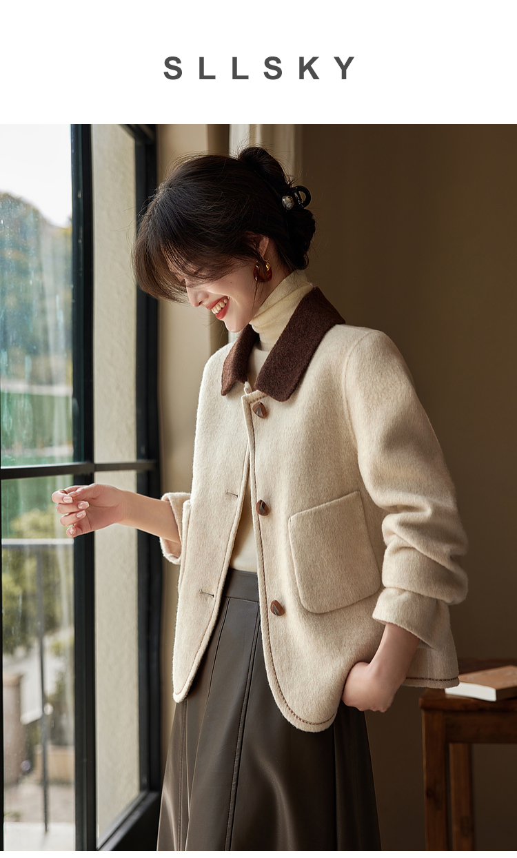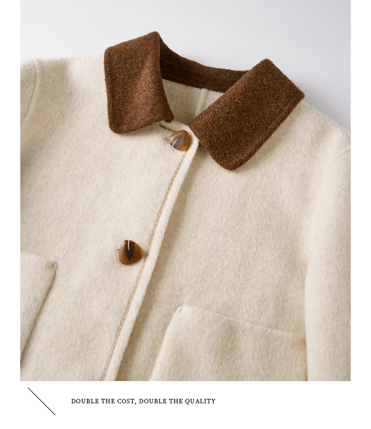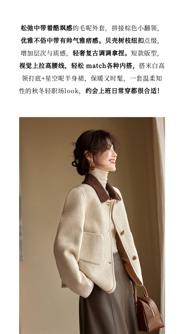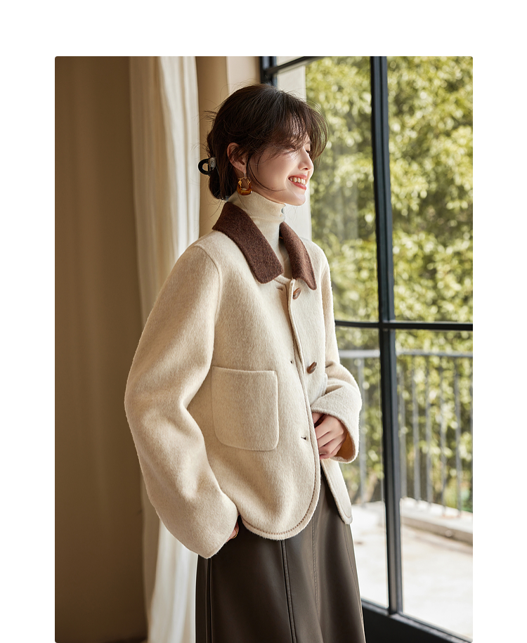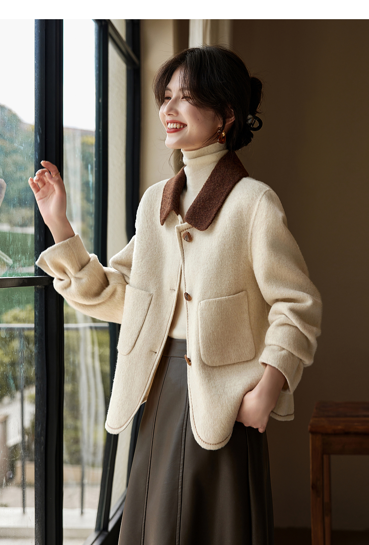 【年终特卖】熙世界骆驼绒绵羊毛大衣女短款冬季新款小香风撞色翻领毛呢外套