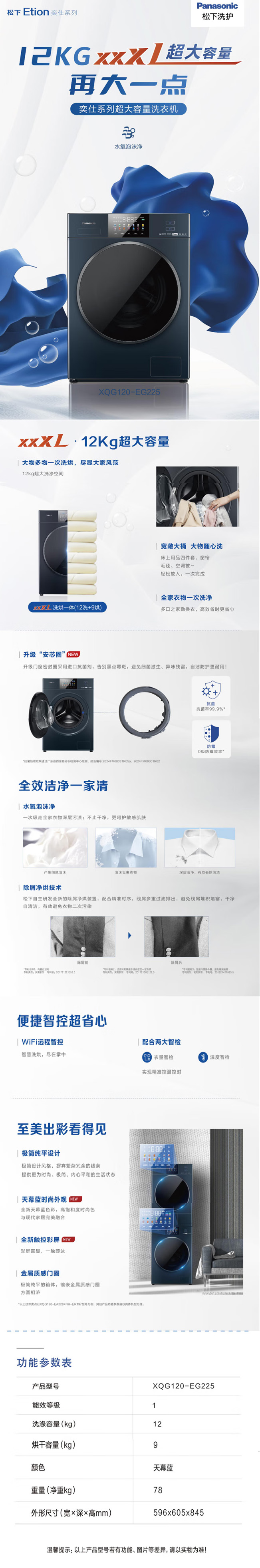 松下 洗衣机 XQG120-EG225 12KG洗+9KG烘 滚筒洗烘 冷凝烘干 变频 一级能效 高温除菌 前开式 不锈钢内筒 彩屏显示
