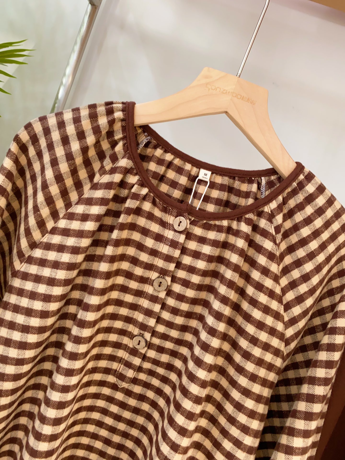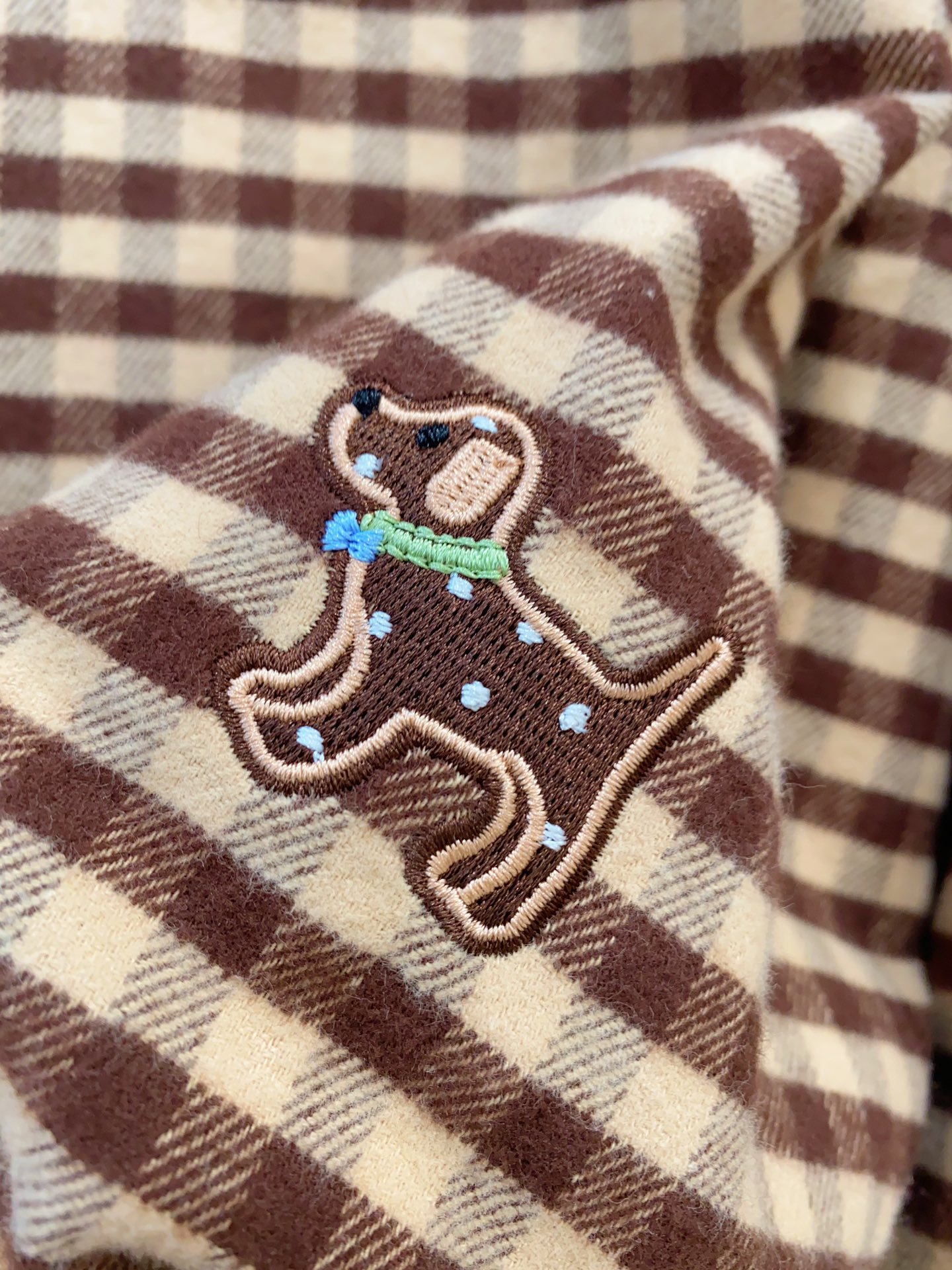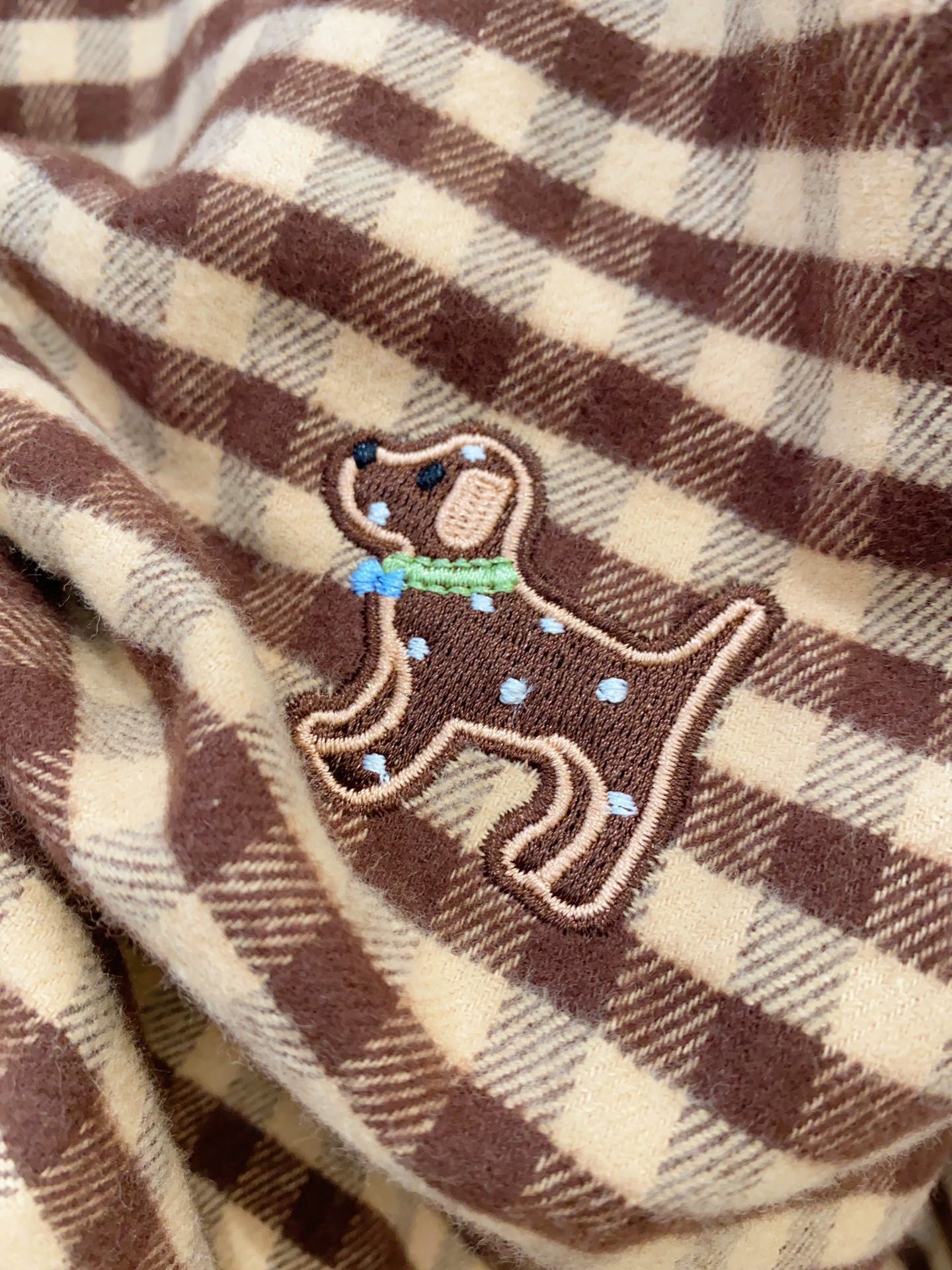 100%棉加厚磨毛,告别秋冬冰凉。 ·经典复古咖格,点缀萌趣小狗刺绣,简约中流露巧思。 · 宽松溜肩圆领上衣+松紧腰裤,行动无拘束,温暖不厚重