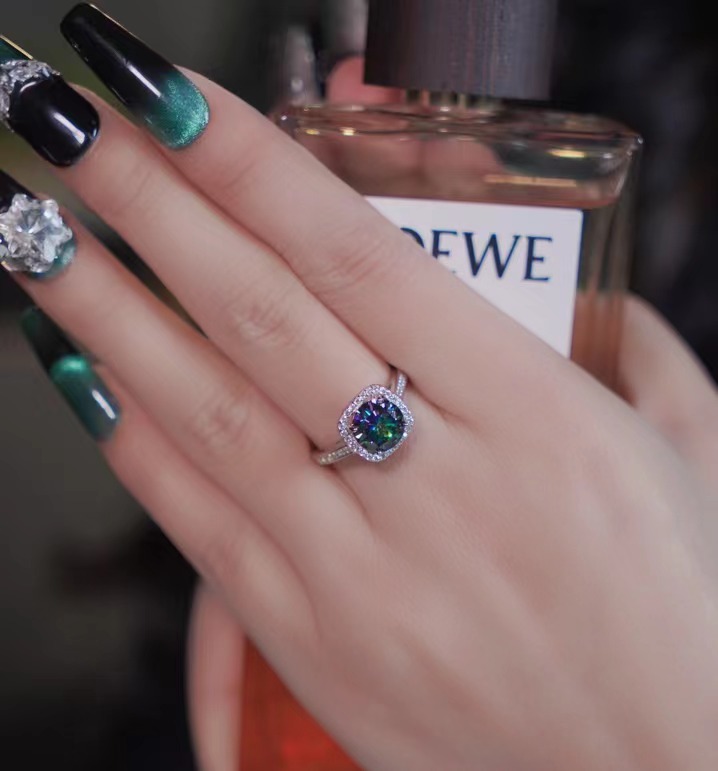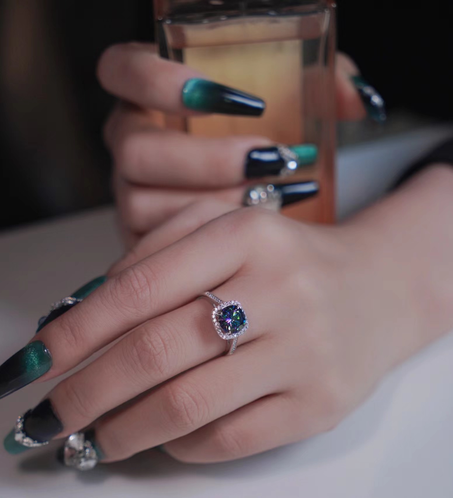 L925银莫桑石戒指 蓝钻方形镶钻戒指带证书气质时尚奢华优雅