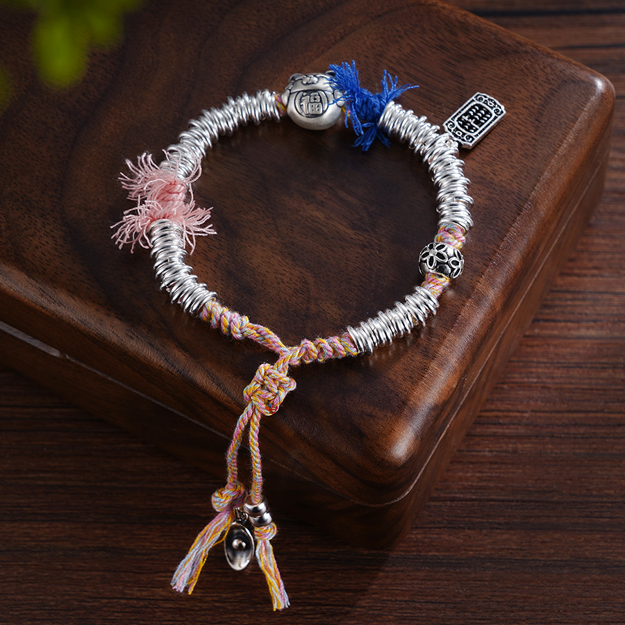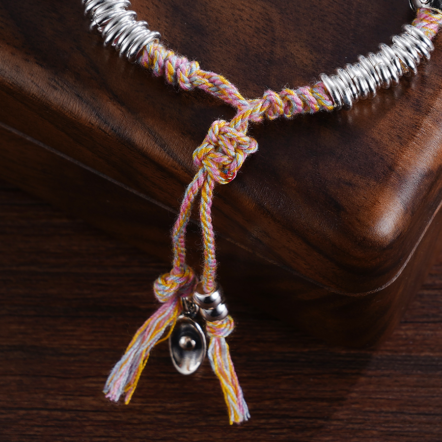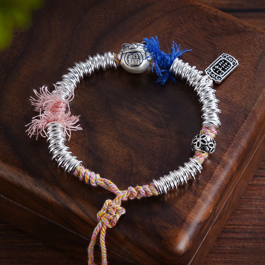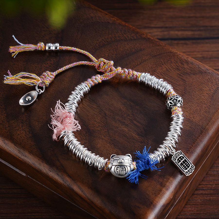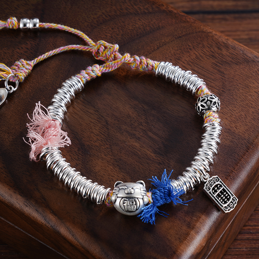【寓意】:小众设计感盘缠手串,点缀招财猫坠饰。实心锤纹手工银圈搭配彩绳,色泽古朴温润,结实耐用。作品寓意招财进宝。