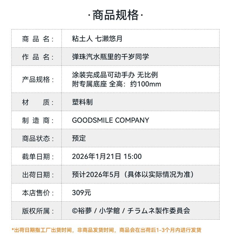 【GSC预售定金】粘土人 七濑悠月 弹珠汽水瓶里的千岁同学