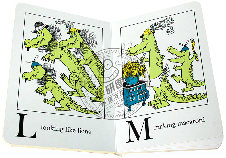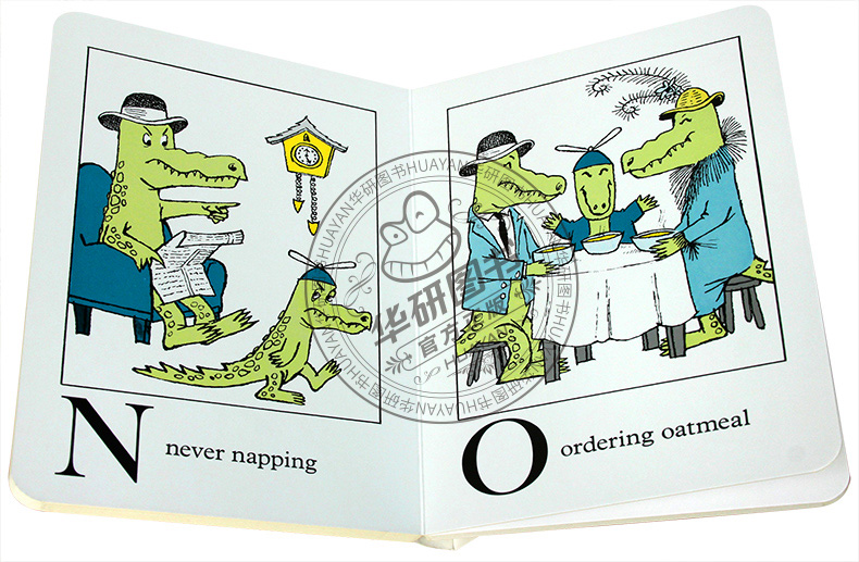 Alligators All Around Board Book《小鳄鱼学字母》是一本字母认知书,从A-Z,每页一个字母,用同一字母开头的趣味英文短语,带领孩子展开英文字母的认知。
