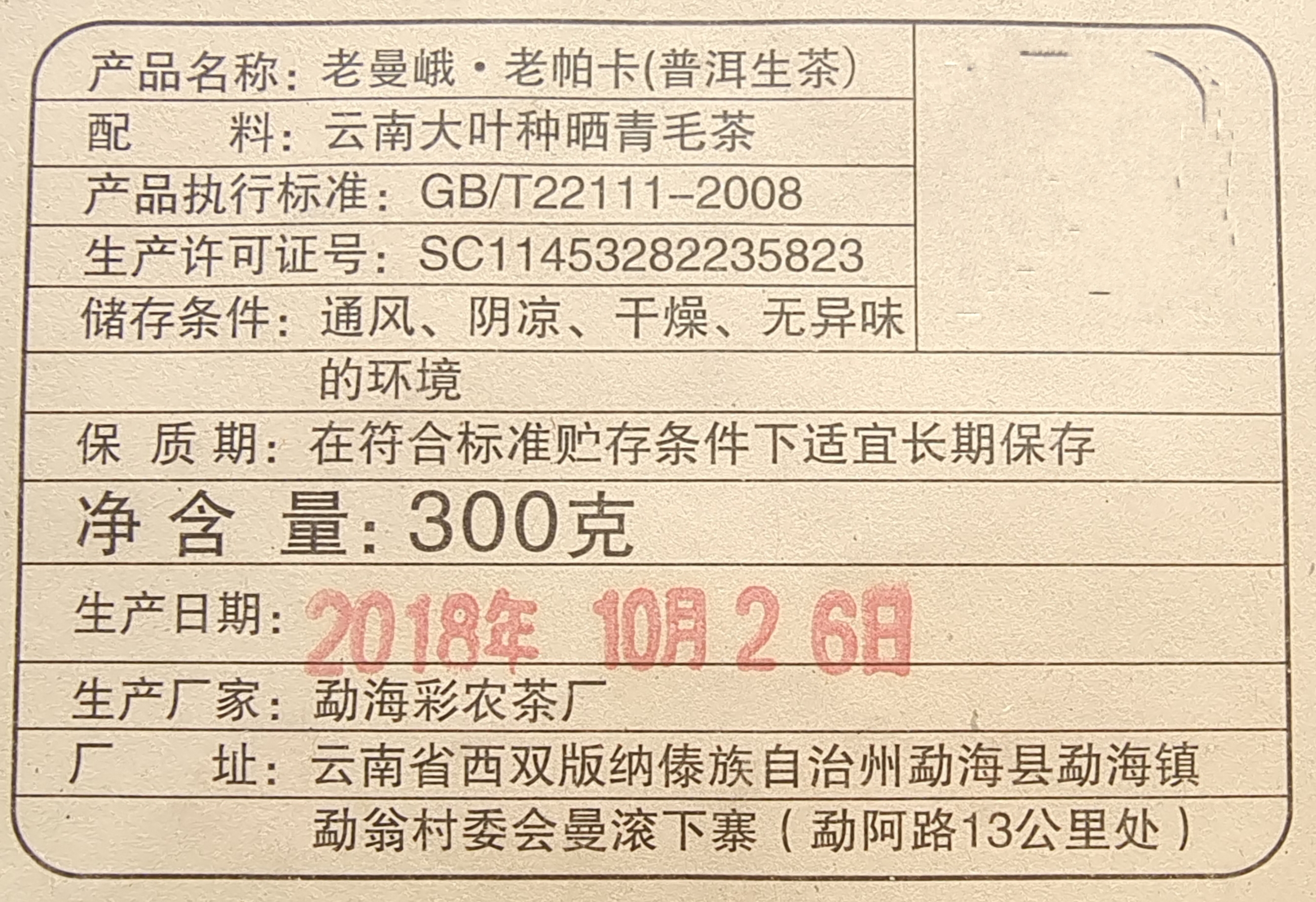 原料季节: 2017、2018年老曼峨春、秋古树纯料老帕卡