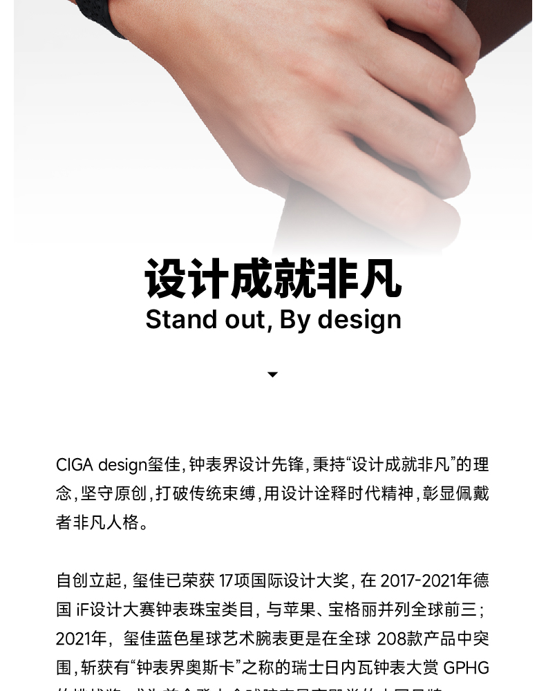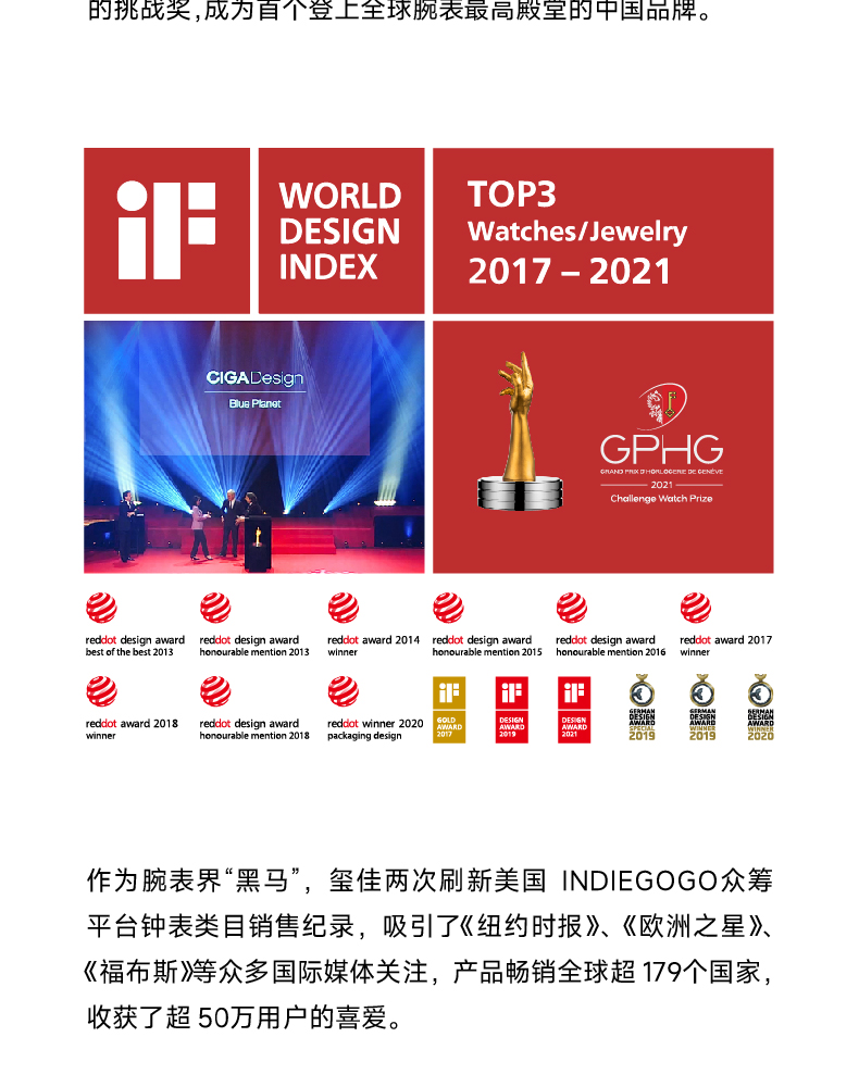 - 钟表界设计先锋,2021年荣获第19届瑞士日内瓦钟表大赏GPHG的中国品牌。秉持“设计成就非凡”理念,坚守原创,突破传统。