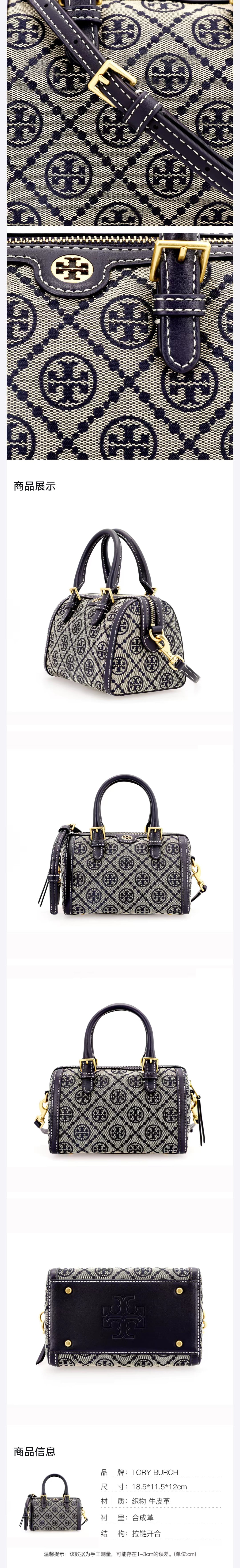 【老花波士顿】TORY BURCH 汤丽柏琦 T Monogram 老花满印 织物拼牛皮革 波士顿包单肩斜挎手提包83970 大号/小号 香港直邮 清关约7个工作日
